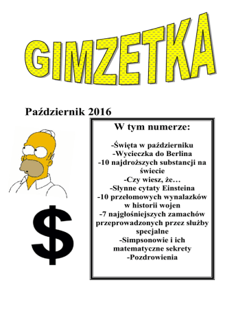 Październik 2016 W tym numerze: -Święta w październiku -Wycieczka do Berlina -10 najdroższych substancji na świecie -Czy wiesz, że… -Słynne cytaty Einsteina -10 przełomowych wynalazków w historii wojen -7 najgłośniejszych zamachów przeprowadzonych przez służby specjalne -Simpsonowie i ich matematyczne sekrety -Pozdrowienia Święta w październiku 2 października 4 października 5 października 6 października 10 października 12 października 13 października 14 października 15 października 16 października 17 października 18 października 19 października 22 października 24 października 25 października 27 października 30 października Europejski Dzień Ptaków, Światowy Dzień Zwierząt Hodowlanych, Międzynarodowy Dzień Bez Przemocy Światowy Dzień Dobroci Dla Zwierząt Światowy Dzień Nauczyciela Światowy Dzień Mieszkalnictwa Światowy Dzień Zdrowia Psychicznego Światowy Dzień Chorób Reumatycznych Dzień Ratownictwa Medycznego Międzynarodowy Dzień Zmniejszania Skutków Klęsk Żywiołowych, Dzień Nauczyciela Światowy Dzień Mycia Rąk, Międzynarodowy Dzień Kobiet Wiejskich, Dzień Dziecka Utraconego, Międzynarodowy Dzień Niewidomych Dzień Papieża Jana Pawła II Międzynarodowy Dzień Walki z Ubóstwem, Dzień Walki z Rakiem Światowy Dzień Monitorowania Wody, Dzień Łączności, Dzień Poczty Polskiej Dzień Ratownika Światowy Dzień Osób Jąkających Światowy Dzień Informacji Na Temat Rozwoju, Dzień Organizacji Narodów Zjednoczonych Dzień Ustawy o Ochronie Zwierząt Światowy Dzień Modlitwy o Pokój Zmiana czasu z letniego na zimowy 31 października Światowy Dzień Oszczędności Wycieczka do Berlina W dniach 29/30 września odbyła się wycieczka do Berlina, której organizatorem było Biuro Podróży INDEX. Kierownikiem wycieczki była Pani Elżbieta Goławska, a opiekunami podczas wyjazdu Panie Grażyna Łapszańska oraz Renata Burnecka. Wyjechaliśmy w czwartek o godzinie 5:00 spod szkoły, w Berlinie byliśmy około godziny 9. Najpierw wjechaliśmy na wieżę telewizyjną i podziwialiśmy z niej całe miasto. Następnie zwiedzaliśmy Bramę Brandenburską, Reichstag, katedre Berlińską, Wyspę Muzeów Postdammerplatz, Alexanderplatz a także Centrum handlowe Europa, w którym mieliśmy czas dla siebie. Po zwiedzeniu stolicy wróciliśmy do Polski na nocleg. Drugiego dnia naszej podróży zjedliśmy śniadanie wykwaterowaliśmy się i przejechaliśmy do aquaparku Tropical Island. Spędziliśmy w nim cały dzień, po czym wyruszyliśmy w drogę powrotną do Pokoju, byliśmy tam około godziny 22. Była to niesamowita wycieczka, która na długo pozostanie w naszej pamięci. 10 najdroższych substancji na świecie 10- Białe trufle 5$/g 9- Szafran 11/$ 8- Złoto 40 /$ 7- krem de la mer 40/$ 6- Platyna 48/$ 5- Róg nosorożca 110/$ 4- LSD 3000/$ 3- Diament 60000/$ 2- Californium 27000000/$ 1- Antymateria >618/$ Czy wiesz, że…(Einstein) -Długoletnia przyjaźń noblisty i wybitnego aktora oraz reżysera Charciego Chaplina zowocowała mnóstwem anegdot. Einstein był wielkim fanem artysty, czemu dał wyraz już podczas ich pierwszego spotkania. Stwierdził: -Najbardziej podziwiam w Twojej sztuce to, że jest uniwersalna. Nie mówisz ani słowa, a rozumie Cię cały świat. Chaplin odpowiedział: -To prawda. Ale Twoja chwała jest większa. Cały świat Cię podziwia, choć nie rozumie ani jednaego słowa z tego, co mówisz. -W dwudziestą rocznicę proklamowania niepodległości Izraela tamtejszy bank centralny, uhonorował wybitnego żydowskiego fizyka. Wyemitował banknot o nominale 5 lir, na którym umieszczono portret Alberta Einsteina. Do dziś w tym bliskowschodnim państwie nazwiskiem geniusza nazywane są ulice, parki oraz szkoły. -Ciało Einsteina poddano kremacji, niemal w całości. Thomas Stoltzt Harley, patolog przeprowadzający sekcje zwłok, uznał bowiem, że mózg naukowca powinien posłużyć do badań i bez pytania rodziny o zgodę zachował go dla siebie. Przez lata trzymał narząd w słoiku z formaliną. Kiedy sprawa wyszła na jaw, wybuchł wielki skandal, lecz ostatecznie syn Einsteina przystał na poddaniemózgu ojca analizom. Dziś wiemy m. in., że dolny płat ciemieniowy, związany z matematycznym talentem, był u genialnego fizyka zdecydowanie niż u przeciętnego człowieka. -Fizyk dorównywał sławą największym gwiazdom Hollywood, a fotoreporterzy nie odstępowali go na krok. W 1951 roku powstało jego najbardziej znane zdjęcie. Kiedy uczony wychodził z przyjęcia, które zorganizowano z okazji jego 72. urodzin, otoczyła go zgraja paparazzich. Gdy poprosili noblistę, by się uśmiechnął, ten –poirytowany ich obecnością- w odpowiedzi pokazał im język! Tak bardzo zaskoczył fotografów, że tylko jeden nacisnął spust migawki. To właśnie refleksowi Arthura Sasse zawdzięczamy zdjęcie ,,szalonego naukowca’’, które na stałe weszło do kanonu popkultury. Słynne cytaty Einsteina ,,Kiedy miałem 20 lat myślałem tylko o kochaniu. Później kochałem już tylko myśleć’’ ,,Tylko 2 rzeczy są nieskończone: wszechświat oraz ludzka głupota, choć nie jestem pewny co do tej pierwszej’’ ,,Nie ma żadnych talentów prócz namiętnej ciekawości’’ ,,Wyobraźnia jest ważniejsza od wiedzy. Wiedza jest ograniczona, podczas gdy wyobraźnią ogarniamy cały świat’’ ,,Jedynym dowodem na to, że istnieje jakaś pozaziemska cywilizacja, jest to, że się z nami nie kontaktuje’’ 10 przełomowych wynalazków w historii wojen 1 -Karabin maszynowy-Seryjny morderca 2 -Szybkostrzelna artyleriaśmierć nadchodzi z góry 3 –Czołg- pancerny walec 4 –Broń masowego rażenia- zbyt mordercza by jej użyć 5 –samolot bojowy- podniebni rycerze 6 –Radar- radiowe ucho i oko 7 –Rakiety i broń kierowana- wystrzel i zapomnij 8 –Śmigłowcehelikopter w ogniu walki 9 –Drony- wojny robotów 10 –Skomputryzowane pole walki- w sieci 7 najgłośniejszych zamachów przeprow