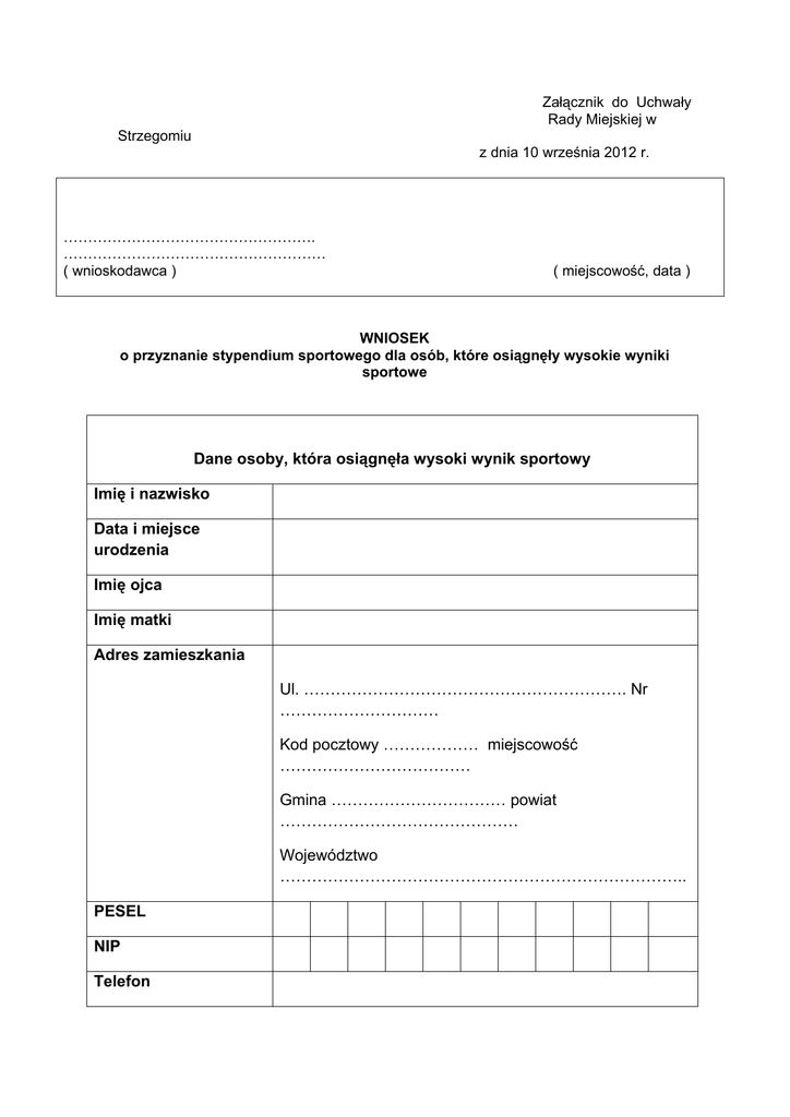 Załącznik do Uchwały Rady Miejskiej w Strzegomiu z dnia 10 września 2012 r. ……………………………………………. ……………………………………………… ( wnioskodawca ) ( miejscowość, data ) WNIOSEK o przyznanie stypendium sportowego dla osób, które osiągnęły wysokie wyniki sportowe Dane osoby, która osiągnęła wysoki wynik sportowy Imię i nazwisko Data i miejsce urodzenia Imię ojca Imię matki Adres zamieszkania Ul. ……………………………………………………. Nr ………………………… Kod pocztowy ……………… miejscowość ……………………………… Gmina …………………………… powiat ……………………………………… Województwo ………………………………………………………………….. PESEL NIP Telefon Nazwa banku Nr konta bankowego Dane klubu sportowego, do którego przynależy osoba, która osiągnęła wysoki wynik sportowy Nazwa klubu Adres UL. ………………………………………………… NR ……………………… Kod pocztowy …………… miejscowość ………………………….. Województwo ……………………………………………………………. Telefon/fax/ e-mail Oświadczam, że powyższe dane są zgodne ze stanem faktycznym. Jednocześnie oświadczam, że o zmianach wynikających z wniosku powiadomię właściwą komórkę merytoryczną Urzędu Miejskiego w Strzegomiu przed wypłatą stypendium za miesiąc, w którym zaszła zmiana. Wyrażam zgodę na przetwarzanie moich danych osobowych w celach związanych z przyznaniem stypendium sportowego zgodnie z ustawą z dnia 29 sierpnia 1997 roku o ochronie danych osobowych ( Dz. U. z 2002 r., Nr 101, poz. 926 z późn. zm.) Dane Wnioskodawcy Nazwa wnioskodawcy Adres Ul. …………………………………………………… Nr ………………………………… Kod pocztowy ………………… Miejscowość…………………………………. Województwo ……………………………………………………………………. Telefon/fax/ e-mail Osiągnięcia sportowe osoby ubiegającej się o przyznanie stypendium sportowe Dyscyplina ………………………………………………………………………………………………… ………….. Kategoria wiekowa ……………………………………………………………………………………………….. Osiągnięte wyniki / nazwa zawodów, termin/: ………………………………………………………………………………………………… ………………………….. ………………………………………………………………………………………………… ………………………….. ………………………………………………………………………………………………… ………………………….. ………………………………………………………………………………………………… ………………………….. ………………………………………………………………………………………………… …………………………… ………………………………………………………………………………………………… ……………………………… ………………………………………………………………………………………………… …………………………….. ………………………………………………………………………………………………… …………………………….. ………………………………………………………………………………………………… ……………………………. ………………………………………………………………………………………………… …………………………….. ………………………………………………………………………………………………… …………………………… ………………………………………………………………………………………………… ………………………….. ………………………………………………………………………………………………… …………………………….. ………… ……………………….. / podpis osoby wnioskującej/