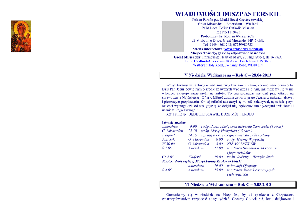 WIADOMOŚCI DUSZPASTERSKIE Polska Parafia pw. Matki Bożej Częstochowskiej Great Missenden – Amersham – Watford PCM Local Polish Catholic Mission Reg No 1119423 Proboszcz – ks. Roman Werner SChr 22 Misbourne Drive, Great Missenden HP16 0BL Tel. 01494 868 248; 07759980733 Strona internetowa: www.tchr.org/amersham Miejsca/kościoły, gdzie są odprawiane Msze św.: Great Missenden; Immaculate Heart of Mary, 23 High Street, HP16 9AA Little Chalfont-Amersham: St Aidan, Finch Lane, HP7 9NE Watford: Holy Rood, Exchange Road, WD18 0PJ V Niedziela Wielkanocna – Rok C – 28.04.2013 Wciąż trwamy w zachwycie nad zmartwychwstaniem i tym, co ono nam przyniosło. Dziś Pan Jezus powie nam o źródle zbawczych wydarzeń i o tym, jak możemy się w nie włączyć. Skieruje nasze myśli na miłość. To ona gromadzi nas dziś przy ołtarzu na sprawowanie Najświętszej Ofiary. Miłość została zawarta przez Jezusa w najważniejszym i pierwszym przykazaniu. On tej miłości nas uczył, tę miłość pokazywał, tą miłością żył. Miłości wymaga dziś od nas, gdyż tylko dzięki niej będziemy autentycznymi świadkami i uczniami Jego Ewangelii. Ref. Ps. Resp.: BĘDĘ CIĘ SŁAWIŁ, BOŻE MÓJ I KRÓLU Intencje mszalne Amersham G. Missenden Watford P.29.04. W.30.04. S.1.05. 9.00 za śp. Jana, Marię oraz Edwarda Szymczaka (8 rocz.) 12.30 za śp. Marię Hostyńską (13 rocz.) 14.15 z prośą o Boże błogosławieństwo dla rodziny G. Missenden 8.00 za śp. Helenę Wargacką G. Missenden 8.00 NIE MA MSZY ŚW. Amersham 11.00 w intencji Simeona w 14 rocz. ur. i jego rodziców Cz.2.05. Watford 19.00 za śp. Jadwigę i Henryka Szulc P.3.05. Najświętszej Maryi Panny Królowej Polski Amersham 19.00 w intencji Ojczyzny S.4.05. Amersham 15.00 w intencji dzieci I-komunijnych i ich rodziców VI Niedziela Wielkanocna – Rok C – 5.05.2013 Gromadzimy się w niedzielę na Mszy św., by od spotkania z Chrystusem zmartwychwstałym rozpocząć nowy tydzień. Chcemy Go wielbić, Jemu dziękować i prosić o ciągłą obecność pośród nas obiecanego Pocieszyciela – Ducha Świętego. On działa w Kościele, działa w każdym z nas i umacnia w nas wiarę, nadzieję i miłość. Owoce tego działania zależą od nas – od naszej współpracy z łaską Bożą. Ref. Ps. Resp.: NIECH WSZYSTKIE LUDY SŁAWIĄ CIEBIE BOŻE Intencje mszalne Amersham G. Missenden 9.00 12.30 za śp. Antoniego Różyckiego za śp. Marię i Zygmunta Maligranda i Czesława Kaczmarka - od żony i dzieci 14.15 za śp. Annę Góralską (2 mies.) G. Missenden 8.00 za śp. Łucję, Alfreda Powieckich G. Missenden 8.00 w pewnej intencji Amersham 11.00 za śp. Helenę Kamińską Watford 19.00 do Najśw. Serca Pana Jezusa o błogosławieństwo dla Anelki i Kafi z ich rodzicami oraz Ojca Amersham 19.00 za śp. Jarosława Skorupskiego Amersham 8.30 za śp. Jarosława Watford P.6.05. W.7.05. S.8.05. Cz.9.05. P.10.05. S.11.05. Wniebowstąpienie Pańskie – Rok C – 12.05.2013 W dziesiejszą niedzielę celbrujemy uroczystość Wniebowstąpienia Pana Jezusa. Syn Boży uniósł się do nieba i jako kapłan ze swoją ofiarą wszedł do Świątyni Niebiańskiej – do chwały Ojca. Miało to miejsce w czterdziestym dniu po zmartwychwstaniu i rozpoczęło nowy etap w dziejach wspólnoty Jego uczniów – trwania w komunii z Chrystusem obecnym w Kościele. Ref. Ps. Resp.: PAN WŚRÓD RADOŚCI WSTĘPUJE DO NIEBA Intencje mszalne Amersham G. Missenden Watford P.13.05. W.14.05. S.15.05. Cz.16.05. P.17.05. S.18.05. 9.00 w intencji Zuzany 12.30 za zmarłych kapłanów 14.15 za śp. Adama Lipa G. Missenden 8.00 za śp. Jarosława Skorupskiego G. Missenden 8.00 za śp. Marię Kreyser Amersham 11.00 dziękczynna za dar Chrystusowego kapłaństwa Watford 19.00 za śp. Marię Kreyser Amersham 19.00 za śp. Jarosława Amersham 8.30 za śp. Marię Kreyser Uroczystość Zesłania Ducha Świętego – Rok C – 19.05.2013 Radujemy się dziś uroczystością Zesłania Ducha Świętego. To czas spełnienia Jezusowej obietnicy: moc z wysoka stała się doświadczeniem ludu Bożego. Tak wtedy, kiedy stało się to udziałem uczniów jezusa w Wieczerniku, jak i dzisiaj, kiedy gromadzimy się w Jego Imię. Dzięki Duchowi Świętemu każdy z nas słyszy Boga „w swoim własnym języku”. Dzięki Niemu możemy wyznać, że Jezus jest naszym Panem. Ref. Ps. Resp.: NIECH ZSTĄPI DUCH TWÓJ I ODNOWI ZIEMIĘ Intencje mszalne Amersham G. Missenden Watford P.20.05. W. 21.05. S. 22.05. Cz.23.05. P.24.05. S.25.05. 9.00 za śp. Władysława Lentowicza (34 rocz.) 12.30 o Bożą łaskawość dla Zoe i babci Zofii (dzień imienin) 14.15 za śp. Ignacego Wesołowskiego (19 rocz.) – od żony i dzieci G. Missenden 8.00 za śp. Gertrudę Liszowską G. Missenden 8.00 za zmarłych Amersham 11.00 za śp. Stanisława Portalskiego Watford 19.00 za śp. Stanisława Portalskiego Amersham 19.00 za śp. Marię i Michała Amersham 8.30 za śp. Helenę Wargacką KRONIKA PARAFIALNA CHRZTY: W naszej Wspólnocie Parafialnej zostali ochrzczeni: 1/ 24.03.2013: Oliver ANDREWS, s. Paul i Jolanty; 2/ 1.04.2013: Maya ZIEMBICKI, c. Roberta i Ewy; 3-4/ 7.04.2013: Hanna PIECHOCKA. C. Wojciecha i Marleny; Richard PIASECKI, s. Artura i Edyty; 5/ 21.04.2013: Zachary ZACIERKA, s. Marcina i Joanny. Niech wzrastają w łasce u Boga i ludzi! ZAPOWIEDZI: Do sakramentu małżeństwa przygotowują się: 1/ Sylwester GENDEK i Kamila PYDZIŃSKA; 2/ Kevin WARREN i Agnieszka PŁANETA. Ktokolwiek wiedziałby o istniejących przeszkodach małżeńskich proszony jest o powiadomienie duszpasterza. POGRZEB: śp. Jarosław SKORUPSKI, l. 41, zam. Henel Hempstead zmarł 19.03.2013 r. Nabożeństwo Słowa Bożego i spopielenie ciała zmarłego odbyło się 5.04.2013 r. w Amrsham Crematorium. Niech odpoczywa w pokoju wiecznym! OGŁOSZENIA PARAFIALNE • • • MAJ - miesiącem poświęconym Matce Bożej. W naszej polskiej tradycji oddajemy cześć Matce Najświętszej przez odmawianie lub śpiew Litanii Loretańskiej. Zach