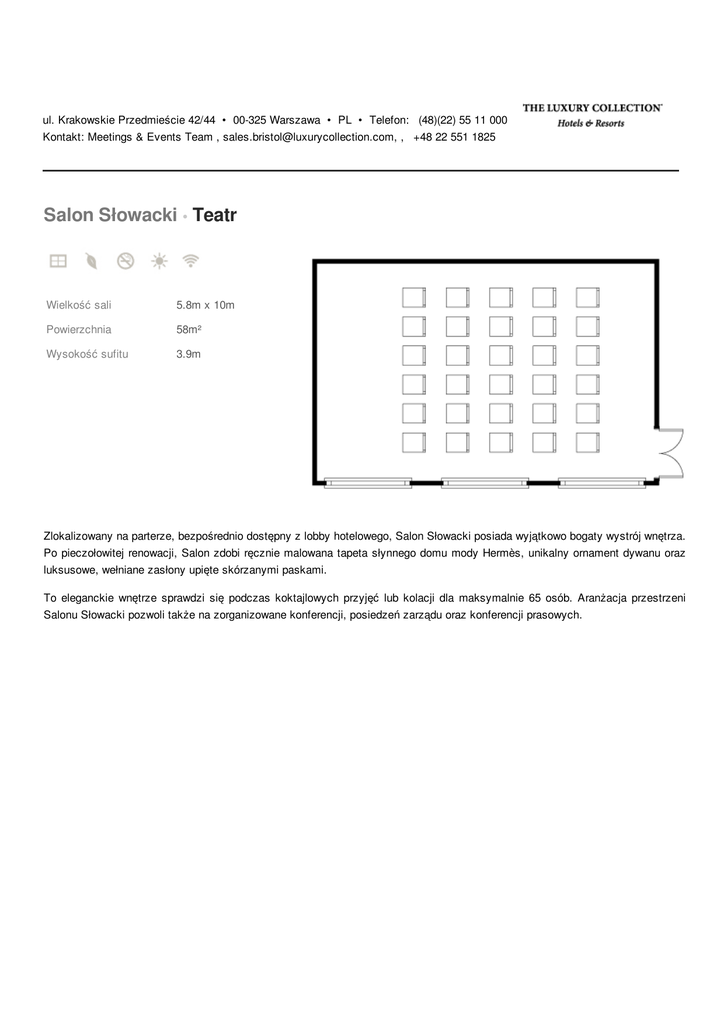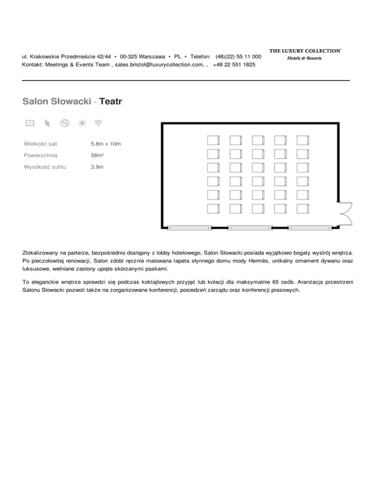 ul. Krakowskie Przedmieście 42/44 • 00-325 Warszawa • PL • Telefon: (48)(22) 55 11 000 Kontakt: Meetings & Events Team , [email protected], , +48 22 551 1825 Salon Słowacki • Teatr Wielkość sali 5.8m x 10m Powierzchnia 58m² Wysokość sufitu 3.9m Zlokalizowany na parterze, bezpośrednio dostępny z lobby hotelowego, Salon Słowacki posiada wyjątkowo bogaty wystrój wnętrza. Po pieczołowitej renowacji, Salon zdobi ręcznie malowana tapeta słynnego domu mody Hermès, unikalny ornament dywanu oraz luksusowe, wełniane zasłony upięte skórzanymi paskami. To eleganckie wnętrze sprawdzi się podczas koktajlowych przyjęć lub kolacji dla maksymalnie 65 osób. Aranżacja przestrzeni Salonu Słowacki pozwoli także na zorganizowane konferencji, posiedzeń zarządu oraz konferencji prasowych.