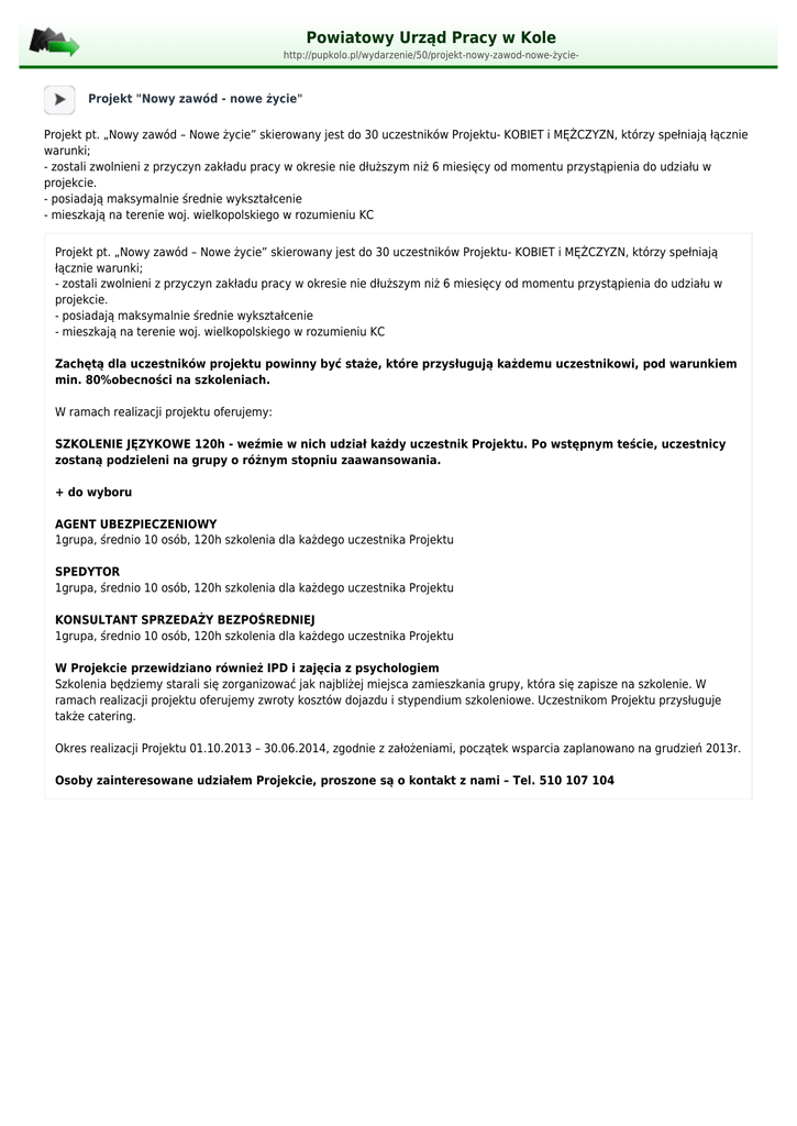 Powiatowy Urząd Pracy w Kole http://pupkolo.pl/wydarzenie/50/projekt-nowy-zawod-nowe-życie- Projekt "Nowy zawód - nowe życie" Projekt pt. „Nowy zawód – Nowe życie” skierowany jest do 30 uczestników Projektu- KOBIET i MĘŻCZYZN, którzy spełniają łącznie warunki; - zostali zwolnieni z przyczyn zakładu pracy w okresie nie dłuższym niż 6 miesięcy od momentu przystąpienia do udziału w projekcie. - posiadają maksymalnie średnie wykształcenie - mieszkają na terenie woj. wielkopolskiego w rozumieniu KC Projekt pt. „Nowy zawód – Nowe życie” skierowany jest do 30 uczestników Projektu- KOBIET i MĘŻCZYZN, którzy spełniają łącznie warunki; - zostali zwolnieni z przyczyn zakładu pracy w okresie nie dłuższym niż 6 miesięcy od momentu przystąpienia do udziału w projekcie. - posiadają maksymalnie średnie wykształcenie - mieszkają na terenie woj. wielkopolskiego w rozumieniu KC Zachętą dla uczestników projektu powinny być staże, które przysługują każdemu uczestnikowi, pod warunkiem min. 80%obecności na szkoleniach. W ramach realizacji projektu oferujemy: SZKOLENIE JĘZYKOWE 120h - weźmie w nich udział każdy uczestnik Projektu. Po wstępnym teście, uczestnicy zostaną podzieleni na grupy o różnym stopniu zaawansowania. + do wyboru AGENT UBEZPIECZENIOWY 1grupa, średnio 10 osób, 120h szkolenia dla każdego uczestnika Projektu SPEDYTOR 1grupa, średnio 10 osób, 120h szkolenia dla każdego uczestnika Projektu KONSULTANT SPRZEDAŻY BEZPOŚREDNIEJ 1grupa, średnio 10 osób, 120h szkolenia dla każdego uczestnika Projektu W Projekcie przewidziano również IPD i zajęcia z psychologiem Szkolenia będziemy starali się zorganizować jak najbliżej miejsca zamieszkania grupy, która się zapisze na szkolenie. W ramach realizacji projektu oferujemy zwroty kosztów dojazdu i stypendium szkoleniowe. Uczestnikom Projektu przysługuje także catering. Okres realizacji Projektu 01.10.2013 – 30.06.2014, zgodnie z założeniami, początek wsparcia zaplanowano na grudzień 2013r. Osoby zainteresowane udziałem Projekcie, proszone są o kontakt z nami – Tel. 510 107 104