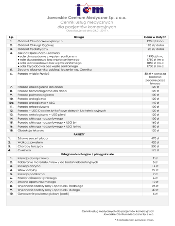 Jaworskie Centrum Medyczne Sp. z o.o. Cennik usług medycznych dla pacjentów komercyjnych Obowiązuje od dnia 24.01.2017 r. L.p. 1. 2. 3. 4. 5. 6. 7. 8. 9. 10. 10a. 11. 12. 13. 14. 15. 16. 18. 1. 2. 3. 4. 1. 2. 3. 4. 5. 6. 7. 8. 9. 10. Usługa Oddział Chorób Wewnętrznych Oddział Chirurgii Ogólnej Oddział Pediatryczny Zakład Opiekuńczo-Leczniczy ● sale dwuosobowe z węzłem sanitarnym ● sale dwuosobowa bez węzła sanitarnego ● sala jednoosobowa bez węzła sanitarnego ● sala trzyosobowa bez węzła sanitarnego Zlecona diagnostyka, zabiegi, leczenie wg. Cennika Porada w Izbie Przyjęć Porada onkologiczna dla dzieci Porada hematologiczna dla dzieci Porada pulmonologiczna Porada urologiczna Porada urologiczna + USG Porada ortopedyczna Porada + USG Doppler żył kończyn dolnych lub tętnic szyjnych Porada onkologiczna + USG piersi Porada chirurga naczyniowego Porada chirurga naczyniowego + USG żył Porada chirurga naczyniowego + USG tętnic Obdukcja lekarska PAKIETY Zdrowe serce i płuca Walka z zawałem Choroby tarczycy Cukrzyca Usługi ambulatoryjne / pielęgniarskie Iniekcja domięśniowa Pobieranie materiału / krew / do badań laboratoryjnych Iniekcja dożylna Wlew dożylny Iniekcja podskórna Pomiar ciśnienia tętniczego Zmiana opatrunku małego Wykonanie toalety rany i opatrunku średniego Wykonanie toalety rany i opatrunku dużego Oznaczenie poziomu glukozy (paski) Cena w złotych 120 zł/doba 120 zł/ doba 120 zł/ doba 1990 zł/m-c 1750 zł /m-c 1850 zł /m-c 1700 zł /m-c 80 zł + cena za badania zlecone przez lekarza 120 zł 120 zł 100 zł 120 zł 140 zł 100 zł 120 zł 120 zł 100 zł 160 zł 180 zł 120 zł 470 zł 420 zł 300 zł 175 zł 9 zł 5 zł 14 zł 27 zł 7 zł 6 zł 10 zł 25 zł 40 zł 6 zł Cennik usług medycznych dla pacjentów komercyjnych Jaworskie Centrum Medyczne Sp. z o.o. * Z zastrzeżeniem pomyłek i zmian. Usługi chirurgiczne i urologiczne 1. 2. 3. 4. 5. 6. 7. 8. 9. 10. 11. 12. Szycie rany do dwóch szwów Szycie rany od 2 - 10 szwów Szycie rany powyżej 10-ciu szwów Zdjęcie szwów wraz z opatrunkiem Nacięcie i drenaż ropnia lub czyraka w znieczuleniu miejscowym Nakłucie krwiaka, ropnia, czyraka Mały zabieg Założenie bandażowego opatrunku Dessoulta Usunięcie wrastającego paznokcia Ostrogi piętowe Cewnikowanie pęcherza moczowego Zabieg litotrypsji 30 zł 40 zł 50 zł 10 zł - 30 zł 46 zł 20 zł 50 zł 40 zł 92 zł 200 zł 30 zł Pierwszy 900zł Drugi 500zł 13. 14. 15. Biopsja prostaty Termoterapia gruczołu krokowego Cystoskopia przezcewkowa Opatrunki gipsowe i syntetyczne 650 zł 1300 zł 500 zł Założenie longety gipsowej małej Założenie longety gipsowej dużej Założenie gipsu małego pełnego Założenie gipsu dużego pełnego Zdjęcie gipsu - małego - kończyna górna Zdjęcie gipsu - dużego - kończyna dolna Korekta opatrunku gipsowego z kontrolą RTG Założenie opatrunku bandażowego na klatkę piersiową Zabiegi ambulatoryjne lekarskie Nastawienie złamania, zwichnięcia ( plus cena znieczulenia ) Podane leku dostawowo Punkcja stawu Odprowadzenie zwichnięcia (plus cena znieczulenia) Znieczulenie ogólne / np. przy repozycji złamania / Blokada nerwu obwodowego Znieczulenie przewodowe Znieczulenie miejscowe Usunięcie ciała obcego z otworów naturalnych Wszycie leku Esperal, Disulfiran Badania diagnostyki endoskopowej Gastroskopia Test urazowy (HP) Wycinki – gastroskopia i wycinki kolonoskopia (hist-pat) Polipektomia w żołądku Rektoskopia Kolonoskopia ze znieczuleniem miejscowym Kolonoskopia ze znieczuleniem ogólnym Polipektomia w jelicie grubym Konsultacja 30 zł 50 zł 50 zł 82 zł 15 zł 20 zł 110 zł 20 zł 1. 2. 3. 4. 5. 6. 7. 8. 1. 2. 3. 4. 5. 6. 7. 8. 9. 10. 1. 2. 3. 4. 5. 6. 7. 8. 9. 92 zł 50 zł 92 zł 60 zł 200 zł 40 zł 50 zł - 150 zł 30 zł 20 zł - 50 zł 100 zł 150 zł 40 zł 40 zł 200 zł 100 zł 350 zł 400 zł 320 zł 80 zł Cennik usług medycznych dla pacjentów komercyjnych Jaworskie Centrum Medyczne Sp. z o.o. * Z zastrzeżeniem pomyłek i zmian. Badania EKG 1. 2. 3. 4. 5. Badanie EKG HOLTER Badanie ciśnienia HOLTER Badanie EKG spoczynkowe Badanie EKG wysiłkowe Spirometria 100 zł + VAT 80 zł + VAT 20 zł 80 zł 20 zł Badania EEG 1. 2. 3. 4. 1. 2. 3. 4. 5. 6. 7. 8. 9. 10. 11. 12. 13. 14. 15. 16. 17. 18. 19. 20. 21. 22. 23. 24. 25. 26. 27. 28. 29. 30. 31. 32. 33. 34. 35. 36. Badanie EEG spoczynkowe Badanie EEG spoczynkowe nie związane z leczeniem i przywracaniem zdrowia (z VAT) Badanie EEG we śnie Badanie EEG we śnie nie związane z leczeniem i przywracaniem zdrowia (z VAT) Badań RTG palec a-p i bocznie dłoń a-p i bocznie dłoń porównawcze nadgarstek a-p i bocznie nadgarstek (wiek kostny) kość przedramienia a-p i bocznie staw łokciowy a-p i bocznie kość ramieniowa a-p kość ramieniowa bocznie staw barkowy lub obojczyk mostek a-p i bocznie łopatka a-p i bocznie klatka piersiowa p-a klatka piersiowa bocznie Żebra stopa a-p i bocznie stopy porównawcze (a-p i bocznie) kość piętowa staw skokowy a-p i bocznie podudzie a-p i bocznie staw kolanowy a-p i bocznie stawy kolanowe porównawcze (a-p i bocznie) osiowe rzepki kość udowa ze stawem biodrowym a-p i bocznie stawy biodrowe lub miednica jama brzuszna stawy krzyżowo - biodrowe p-a stawy krzyżowo biodrowy skośnie czaszka p-a i bocznie zatoki (twarzoczaszka) kość nosowa żuchwa p-a żuchwa skośna staw skroniowo - żuchwowy w zwarciu i rozwarciu zdjęcie uszu (prawe + lewe) kość jarzmowa 80 zł 73,80 zł 110 zł 135,30 zł 28,00 zł 28,00 zł 28,00 zł 28,00 zł 28,00 zł 34,00 zł 34,00 zł 39,00 zł 39,00 zł 34,00 zł 34,00 zł 34,00 zł 39,00 zł 39,00 zł 39,00 zł 34,00 zł 50,00 zł 34,00 zł 39,00 zł 45,00 zł 39,00 zł 50,00 zł 28,00 zł 45,00 zł 45,00 zł 45,00 zł 39,00 zł 39,00 zł 45,00 zł 28,00 zł 28,00 zł 28,00 zł 28,00 zł 45,00 zł 34,00 zł 28,00 zł Cennik usług medycznych dla pacjentów komercyjnych Jaworskie Centrum Medyczne Sp. z o.o. * Z zastrzeżeniem pomy
