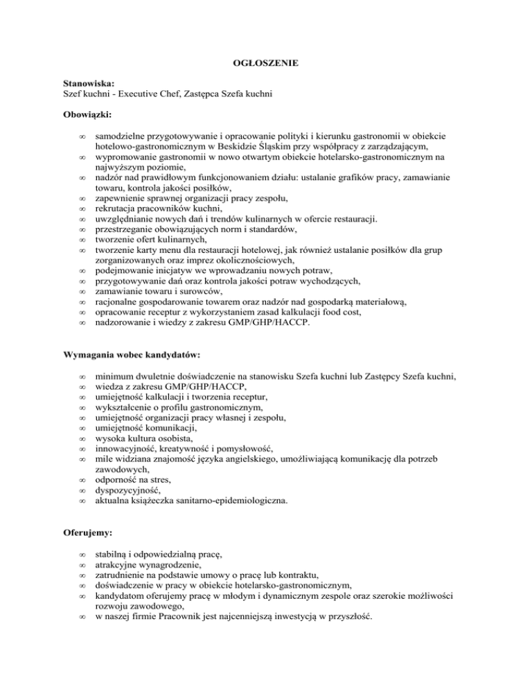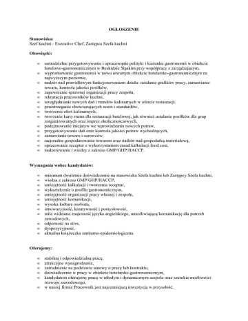OGŁOSZENIE Stanowiska: Szef kuchni - Executive Chef, Zastępca Szefa kuchni Obowiązki: • • • • • • • • • • • • • • • samodzielne przygotowywanie i opracowanie polityki i kierunku gastronomii w obiekcie hotelowo-gastronomicznym w Beskidzie Śląskim przy współpracy z zarządzającym, wypromowanie gastronomii w nowo otwartym obiekcie hotelarsko-gastronomicznym na najwyższym poziomie, nadzór nad prawidłowym funkcjonowaniem działu: ustalanie grafików pracy, zamawianie towaru, kontrola jakości posiłków, zapewnienie sprawnej organizacji pracy zespołu, rekrutacja pracowników kuchni, uwzględnianie nowych dań i trendów kulinarnych w ofercie restauracji. przestrzeganie obowiązujących norm i standardów, tworzenie ofert kulinarnych, tworzenie karty menu dla restauracji hotelowej, jak również ustalanie posiłków dla grup zorganizowanych oraz imprez okolicznościowych, podejmowanie inicjatyw we wprowadzaniu nowych potraw, przygotowywanie dań oraz kontrola jakości potraw wychodzących, zamawianie towaru i surowców, racjonalne gospodarowanie towarem oraz nadzór nad gospodarką materiałową, opracowanie receptur z wykorzystaniem zasad kalkulacji food cost, nadzorowanie i wiedzy z zakresu GMP/GHP/HACCP. Wymagania wobec kandydatów: • • • • • • • • • • • • minimum dwuletnie doświadczenie na stanowisku Szefa kuchni lub Zastępcy Szefa kuchni, wiedza z zakresu GMP/GHP/HACCP, umiejętność kalkulacji i tworzenia receptur, wykształcenie o profilu gastronomicznym, umiejętność organizacji pracy własnej i zespołu, umiejętność komunikacji, wysoka kultura osobista, innowacyjność, kreatywność i pomysłowość, mile widziana znajomość języka angielskiego, umożliwiającą komunikację dla potrzeb zawodowych, odporność na stres, dyspozycyjność, aktualna książeczka sanitarno-epidemiologiczna. Oferujemy: • • • • • • stabilną i odpowiedzialną pracę, atrakcyjne wynagrodzenie, zatrudnienie na podstawie umowy o pracę lub kontraktu, doświadczenie w pracy w obiekcie hotelarsko-gastronomicznym, kandydatom oferujemy pracę w młodym i dynamicznym zespole oraz szerokie możliwości rozwoju zawodowego, w naszej firmie Pracownik jest najcenniejszą inwestycją w przyszłość. Osoby zainteresowane prosimy o przesłanie CV ze zdjęciem w języku polskim lub angielskim wraz ze zgodą na przetwarzanie danych osobowych na adres [email protected], do dnia 6.10.2015r. Zastrzegamy sobie prawo do odpowiedzi tylko na wybrane oferty. Na aplikacji prosimy o dopisanie następującej klauzuli: "Wyrażam zgodę na przetwarzanie moich danych osobowych zawartych w mojej ofercie pracy dla potrzeb niezbędnych do realizacji procesu rekrutacji (zgodnie z ustawą z dn. 29.08.97 roku o Ochronie Danych Osobowych Dz. Ust Nr 133 poz. 883)". Informacje: Obiekt hotelarsko-gastronomiczny w Beskidzie Śląskim.