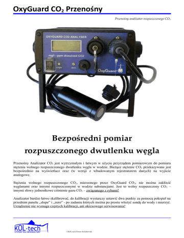 OxyGuard CO2 Przenośny Przenośny analizator rozpuszczonego CO2 Bezpośredni pomiar rozpuszczonego dwutlenku węgla Przenośny Analizator CO2 jest wytrzymałym i łatwym w użyciu przyrządem pomiarowym do pomiaru stężenia wolnego rozpuszczonego dwutlenku węgla w wodzie. Bieżące stężenie CO2 przekazywane jest bezpośrednio na wyświetlacz oraz (w wersji z wbudowanym rejestratorem danych) na wyjście analogowe. Stężenia wolnego rozpuszczonego CO2, mierzonego przez OxyGuard CO2, nie można zakłócić węglanami oraz innymi rozpuszczonymi w wodzie substancjami. Jest to wolny rozpuszczony CO 2 – innymi słowy jednostkowe ciśnienie gazu CO2 – związanego z rybami! Analizator bardzo łatwo skalibrować, do kalibracji wystarczy ustawić dwa punkty za pomocą pokręteł na przednim panelu „slope” i „zero” - po zadaniu których można po prostu włożyć sondę do wody i mierzyć. Urządzenie nie wymaga częstych kalibracji, ani okresowego serwisowania! . ©KOL-tech Tomasz Kolankowski Dane techniczne Szczegółowy opis: Przenośny analizator rozpuszczonego CO2 składa się z sondy i zasilanego z baterii przetwornika. Przetwornik posiada wyświetlacz, przycisk włącz/wyłącz, nastawy „slope” oraz „zero”. Dostarczany jest z ładowarką, oraz wyposażeniem do kalibracji: zlewka kalibracyjna z mieszadłem, roztwór kalibracyjny, kondycjoner kalibracyjny oraz strzykawka dozująca. Zasada działania: Sonda mierzy stężenie dwutlenku węgla w wodzie, poprzez detekcję ciśnienia jednostkowego dwutlenku węgla w wodzie. Należy pamiętać, że zasada działania NIE jest oparta o pomiar pH – NIE wykrywa zmiany pH którą wywołuje dwutlenek węgla. Nie wymaga pobierania żadnych próbek – wykrywa wolny rozpuszczony CO2 – ciśnienie jednostkowe dwutlenku węgla – w wodzie. Zakres pomiarowy urządzenia to 0...50mg/l. Przed użyciem system jest kalibrowany z wykorzystaniem roztworów wody oraz substancji kalibracyjnych w specjalnej zlewce kalibracyjnej z mieszadłem. Przenośny analizator rozpuszczonego CO2 można zamówić z lub bez rejestratora danych. Rejestrator może zapisać 15 000 wartości oraz posiada wyjście do podłączenia komputera, umożliwia zapis danych na komputerze oraz podgląd wartości bieżących. Specyfikacja: Wymiary: Sonda: 40 mm średnicy x 140 mm wysokości. Długość kabla 7m. Miernik: 120 x 120 x 58 mm. Zlewka kalibracyjna 65 mm średnicy x 260 mm. Waga: Około 6 kg z ładowarką, oraz zestawem do kalibracji. Zasilanie: (ładowarka) 230 VAC (115 VAC na zamówienie) Zakres: 0 – 50 mg/l rozpuszczonego dwutlenku węgla. Zakres kompensacji temperatury 3 – 35°C. Warunki otoczenia: Elektronika -10 do +60°C, bryzgoszczelne. Dokładność: Jest zależna od kalibracji. Praktyczna dokładność do ±1 mg/l. Czas odpowiedzi: Zazwyczaj 5 minut w 20°C zależne od przepływu wody przez sondę. W wodzie stojącej czas zwiększony do 15 minut. Wymagania przepływu: Urządzenie nie konsumuje dwutlenku węgla podczas pomiaru, lecz przepływ jest wymagany dla upewnienia się czy część pomiarowa jest w równowadze z otaczającą wodą, żeby uniknąć „miejscowych” pomiarów. Wyjście: Sygnał analogowy 0 – 1 VDC (z rejestracją danych) Czas działania: Około 50 godzin przy naładowanych bateriach. Informacje do zamówienia: G02C2P: Analizator rozpuszczonego CO2 – wersja przenośna z akumulatorami. Sonda z 3m kablem, wyposażenie kalibracyjne, ładowarka 230 VAC. G02C2PLOG: Jak wyżej z wbudowanym rejestratorem z pamięcią 15 000 komórek. Zapewnia zapis danych oraz podgląd on-line wartości na komputerze. G02C2CAL: Akcesoria kalibracyjne; Zlewka z mieszadłem i magnesem, 80 g odczynnika pH, 100 ml roztworu kalibracyjnego z pipetą. Można stosować do większej ilości analizatorów. G02XCS: 100 ml roztworu kalibracyjnego. G02XCT: 80 g odczynnika pH KOL-tech Tomasz Kolankowski ul. Wenus 18, 80-299 Gdańsk strona: www.tlenomierz.pl Tel: +48 607 24 81 84 fax: +4858 555 00 58 e-mail: [email protected]