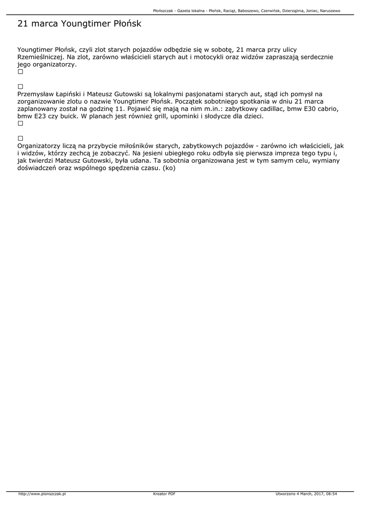 Płońszczak - Gazeta lokalna - Płońsk, Raciąż, Baboszewo, Czerwińsk, Dzierzążnia, Joniec, Naruszewo 21 marca Youngtimer Płońsk Youngtimer Płońsk, czyli zlot starych pojazdów odbędzie się w sobotę, 21 marca przy ulicy Rzemieślniczej. Na zlot, zarówno właścicieli starych aut i motocykli oraz widzów zapraszają serdecznie jego organizatorzy. Przemysław Łapiński i Mateusz Gutowski są lokalnymi pasjonatami starych aut, stąd ich pomysł na zorganizowanie zlotu o nazwie Youngtimer Płońsk. Początek sobotniego spotkania w dniu 21 marca zaplanowany został na godzinę 11. Pojawić się mają na nim m.in.: zabytkowy cadillac, bmw E30 cabrio, bmw E23 czy buick. W planach jest również grill, upominki i słodycze dla dzieci. Organizatorzy liczą na przybycie miłośników starych, zabytkowych pojazdów - zarówno ich właścicieli, jak i widzów, którzy zechcą je zobaczyć. Na jesieni ubiegłego roku odbyła się pierwsza impreza tego typu i, jak twierdzi Mateusz Gutowski, była udana. Ta sobotnia organizowana jest w tym samym celu, wymiany doświadczeń oraz wspólnego spędzenia czasu. (ko) http://www.plonszczak.pl Kreator PDF Utworzono 4 March, 2017, 08:54