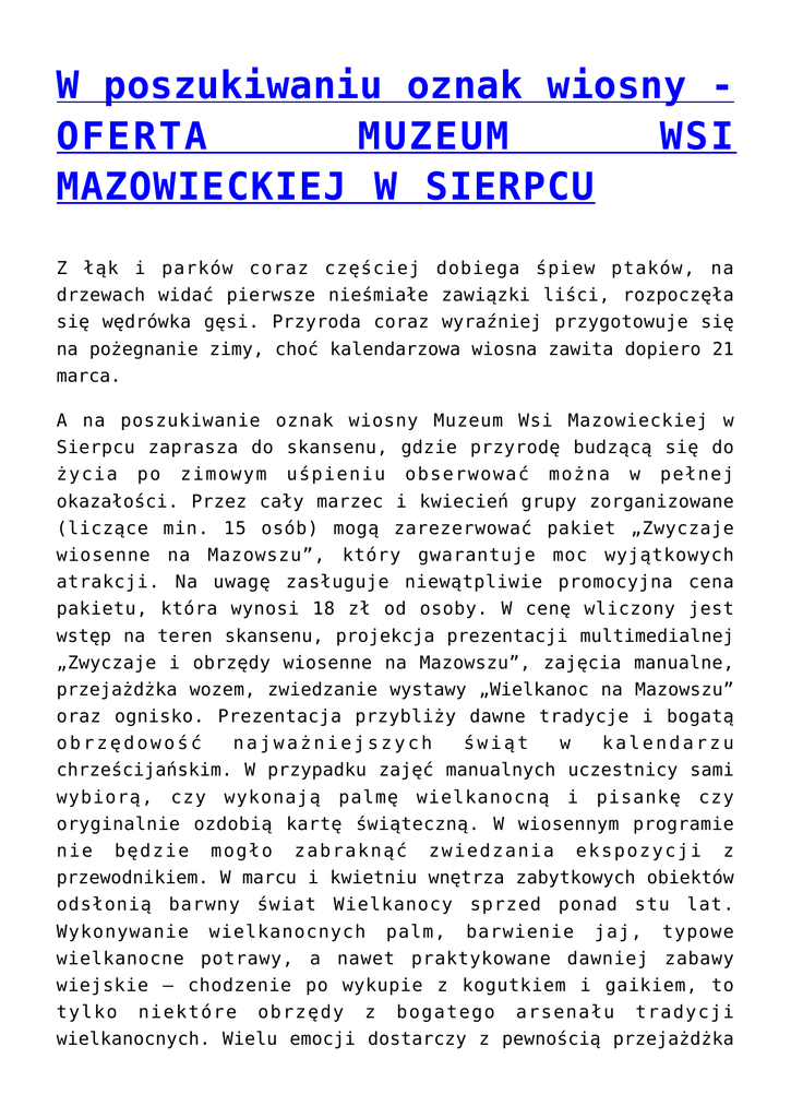 W poszukiwaniu oznak wiosny OFERTA MUZEUM WSI MAZOWIECKIEJ W SIERPCU Z łąk i parków coraz częściej dobiega śpiew ptaków, na drzewach widać pierwsze nieśmiałe zawiązki liści, rozpoczęła się wędrówka gęsi. Przyroda coraz wyraźniej przygotowuje się na pożegnanie zimy, choć kalendarzowa wiosna zawita dopiero 21 marca. A na poszukiwanie oznak wiosny Muzeum Wsi Mazowieckiej w Sierpcu zaprasza do skansenu, gdzie przyrodę budzącą się do życia po zimowym uśpieniu obserwować można w pełnej okazałości. Przez cały marzec i kwiecień grupy zorganizowane (liczące min. 15 osób) mogą zarezerwować pakiet „Zwyczaje wiosenne na Mazowszu”, który gwarantuje moc wyjątkowych atrakcji. Na uwagę zasługuje niewątpliwie promocyjna cena pakietu, która wynosi 18 zł od osoby. W cenę wliczony jest wstęp na teren skansenu, projekcja prezentacji multimedialnej „Zwyczaje i obrzędy wiosenne na Mazowszu”, zajęcia manualne, przejażdżka wozem, zwiedzanie wystawy „Wielkanoc na Mazowszu” oraz ognisko. Prezentacja przybliży dawne tradycje i bogatą obrzędowość najważniejszych świąt w kalendarzu chrześcijańskim. W przypadku zajęć manualnych uczestnicy sami wybiorą, czy wykonają palmę wielkanocną i pisankę czy oryginalnie ozdobią kartę świąteczną. W wiosennym programie nie będzie mogło zabraknąć zwiedzania ekspozycji z przewodnikiem. W marcu i kwietniu wnętrza zabytkowych obiektów odsłonią barwny świat Wielkanocy sprzed ponad stu lat. Wykonywanie wielkanocnych palm, barwienie jaj, typowe wielkanocne potrawy, a nawet praktykowane dawniej zabawy wiejskie – chodzenie po wykupie z kogutkiem i gaikiem, to tylko niektóre obrzędy z bogatego arsenału tradycji wielkanocnych. Wielu emocji dostarczy z pewnością przejażdżka wozem zaprzężonym w konie, a ognisko umożliwi upieczenie kiełbasek. Reasumując, program wiosenny w naturalny sposób połączy pobyt na świeżym powietrzu z poznawaniem dawnych tradycji wielkanocnych i zajęciami manualnymi. Zachęcamy zatem do dokonania rezerwacji pakietu wiosennego i przekonania się, że połączenie zajęć warsztatowych ze zwiedzaniem i integracją przy ognisku to bardzo atrakcyjna forma spędzenia czasu. Każdy uczestnik programu „Zwyczaje wiosenne na Mazowszu” powróci do domu nie tylko z wachlarzem wrażeń i wspomnień, ale także z wykonaną własnoręcznie palmą i pisanką lub kartą świąteczną. Wielkanocne pokazy proponuje także ratusz zachęcając do udziału w pokazach wykonywania palm i pisanek. Zajęcia poświęcone są tradycjom wielkanocnym: przybliżają zapomniane już dziś świętom. obrzędy i zwyczaje towarzyszące tym radosnym Łączą prezentację multimedialną „Wielkanoc na Mazowszu” z zajęciami praktycznymi, na które składają się: pokaz zdobienia jajek woskiem oraz samodzielne wykonanie palmy i pisanki przez uczestników zajęć. Podobnie jak w wypadku wiosennego programu w skansenie – wykonaną przez siebie palmę i pisankę uczestnicy zabierają do domu. Koszt udziału w zajęciach wynosi 6 zł od osoby. Aby wziąć udział w programie „Zwyczaje wiosenne na Mazowszu” realizowanym w skansenie, wystarczy dokonać rezerwacji: skansen – nr tel. 24 275 28 83 wew. 53, 36 lub 37, e-mail: [email protected] Rezerwacje pokazów wykonania palm i pisanek wielkanocnych przyjmuje ratusz: ratusz – nr tel. 24 275 28 26, e-mail: [email protected] Program edukacyjny „ZWYCZAJE WIOSENNE NA MAZOWSZU” Wariant I: Czas trwania: ok. 4 godzin Liczba osób: max 45 Cena – 18 zł/osoba Skład programu: Wstęp na teren skansenu Pokaz wykonania palmy wielkanocnej i pisanki* Projekcja prezentacji multimedialnej „Zwyczaje i obrzędy wiosenne na Mazowszu” Przejazd wozem po terenie ekspozycji Zwiedzanie ekspozycji z przewodnikiem Ognisko połączone z pieczeniem kiełbasek** * Prosimy, aby na pokaz wykonania pisanki każdy uczestnik miał 1 ugotowane jajko ** Kiełbaski można dostarczyć we własnym zakresie lub zamówić telefonicznie w skansenowskiej karczmie(na kilka dni przed planowanym przyjazdem). Kontakt: 603 063 545 Wariant II: Czas trwania: ok. 4 godzin Liczba osób: max 45 Cena – 18 zł/osoba Skład programu: Wstęp na teren skansenu Warsztaty zdobienia karty wielkanocnej Projekcja prezentacji multimedialnej „Zwyczaje i obrzędy wiosenne na Mazowszu” Przejazd wozem po terenie ekspozycji Zwiedzanie ekspozycji z przewodnikiem Ognisko połączone z pieczeniem kiełbasek* * Kiełbaski można dostarczyć we własnym zakresie lub zamówić telefonicznie w skansenowskiej karczmie (na kilka dni przed planowanym przyjazdem. Kontakt: 603 063 545 Agnieszka Jezierska – Chalicka