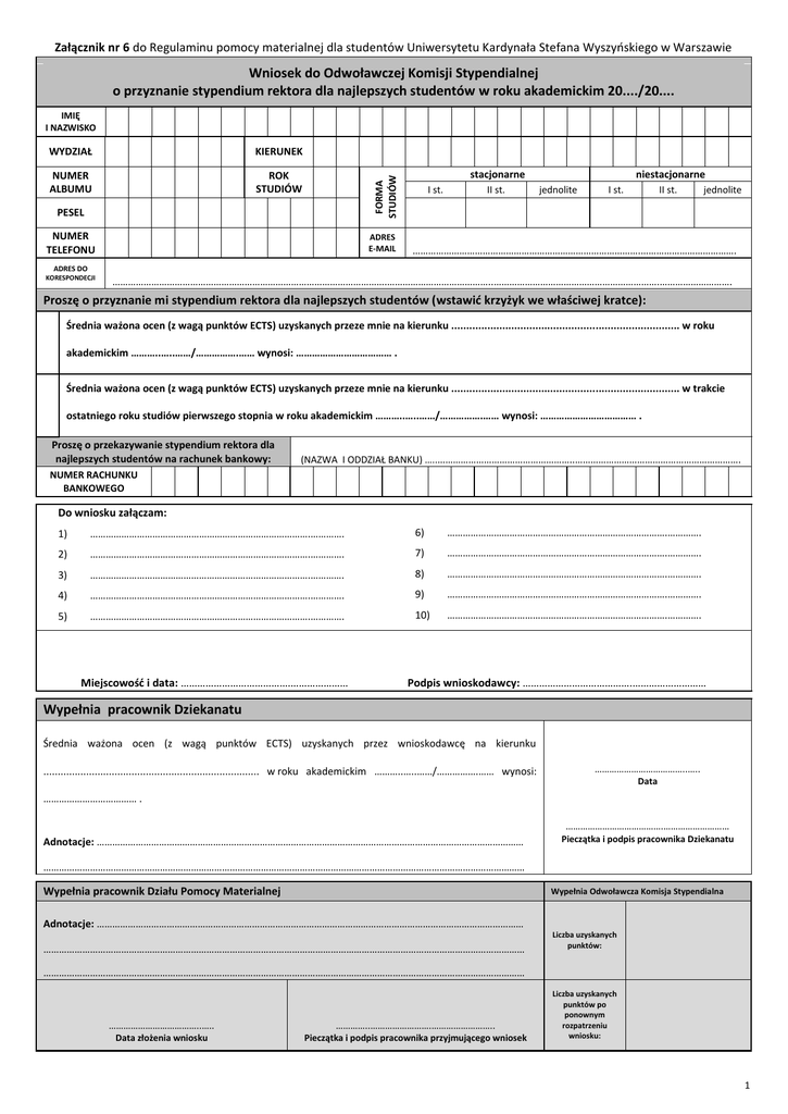 Załącznik nr 6 do Regulaminu pomocy materialnej dla studentów Uniwersytetu Kardynała Stefana Wyszyńskiego w Warszawie Wniosek do Odwoławczej Komisji Stypendialnej o przyznanie stypendium rektora dla najlepszych studentów w roku akademickim 20..../20.... IMIĘ I NAZWISKO KIERUNEK NUMER ALBUMU ROK STUDIÓW stacjonarne FORMA STUDIÓW WYDZIAŁ PESEL NUMER TELEFONU ADRES E-MAIL I st. II st. niestacjonarne jednolite I st. II st. jednolite …………………………………………………………………………….………………………………. ADRES DO KORESPONDECJI …………………………………………………………………………………………….…………………………………..……………………………………………………….………………………. Proszę o przyznanie mi stypendium rektora dla najlepszych studentów (wstawić krzyżyk we właściwej kratce): Średnia ważona ocen (z wagą punktów ECTS) uzyskanych przeze mnie na kierunku ............................................................................ w roku akademickim ………..…..……/…………….…… wynosi: ……………………………… . Średnia ważona ocen (z wagą punktów ECTS) uzyskanych przeze mnie na kierunku ............................................................................ w trakcie ostatniego roku studiów pierwszego stopnia w roku akademickim ………..…..……/…………….…… wynosi: ……………………………… . Proszę o przekazywanie stypendium rektora dla najlepszych studentów na rachunek bankowy: (NAZWA I ODDZIAŁ BANKU) …..……………………………………………..………………………………………………………. NUMER RACHUNKU BANKOWEGO Do wniosku załączam: 1) ………………………………………………………………………….…………. 6) ………………………………………………………………………….…………. 2) ………………………………………………………………………….…………. 7) ………………………………………………………………………….…………. 3) ………………………………………………………………………….…………. 8) ………………………………………………………………………….…………. 4) ………………………………………………………………………….…………. 9) ………………………………………………………………………….…………. ………………………………………………………………………….…………. 10) ………………………………………………………………………….…………. 5) Miejscowość i data: ………………………………….………………… Podpis wnioskodawcy: ………………………………….……………………… Wypełnia pracownik Dziekanatu Średnia ważona ocen (z wagą punktów ECTS) uzyskanych przez wnioskodawcę na kierunku ............................................................................ w roku akademickim ………..…..……/…………….…… wynosi: ………………………………..….. Data ……………………………… . ………………………………….……………………… Adnotacje: ………………………………………………………………………………………………………………………………………………… Pieczątka i podpis pracownika Dziekanatu …………………………………………………………………………………………………………………………………………………………………… Wypełnia pracownik Działu Pomocy Materialnej Wypełnia Odwoławcza Komisja Stypendialna Adnotacje: ………………………………………………………………………………………………………………………………………………… …………………………………………………………………………………………………………………………………………………………………… Liczba uzyskanych punktów: …………………………………………………………………………………………………………………………………………………………………… ………………………………..….. …………..…………………….…………………….. Data złożenia wniosku Pieczątka i podpis pracownika przyjmującego wniosek Liczba uzyskanych punktów po ponownym rozpatrzeniu wniosku: 1 OŚWIADCZENIE (należy je uzupełnić we właściwych miejscach i wstawić krzyżyk we właściwej kratce) Świadomy/a odpowiedzialności karnej1 oraz dyscyplinarnej2 za podanie nieprawdziwych danych, oświadczam, że: dokumenty dołączone do wniosku o przyznanie stypendium rektora dla najlepszych studentów stanowią komplet dokumentacji, a dane w nich zawarte są zgodne ze stanem faktycznym; posiadam tytuł Tak Nie licencjata/inżyniera data uzyskania tytułu/ów ….…….............................................................. posiadam tytuł zawodowy Tak Nie magistra lub równorzędny □ □ studiuję dodatkowo Tak □ □ □ Nie □ ……..………….................................................................................................... ……………………………...……………….……….…………………………………….……………….… (nazwa uczelni, rok i kierunek) jestem świadomy/a obowiązku złożenia do DPMS zał. nr 8 do Regulaminu w ciągu 14 dni od dnia doręczenia decyzji o przyznaniu stypendium rektora dla najlepszych studentów, jeśli ubiegam się o przyznanie tego stypendium na innym kierunku, bądź innej Uczelni, pod rygorem utraty 