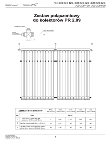 Nr.: 300 200 120, 300 200 220, 300 200 320, 300 200 420, 300 200 520 Zestaw połączeniowy do kolektorów PR 2.09 Tuleja zanurzeniowa Gniazdo czujnika temp. 3 2 1 3 2 kol. 1 kol. 300200120 300200220 3 kol. 300200320 4 kol. 300200420 5 kol. 300200520 Lp. Dwuzłączka pierścieniowa zaciskowa Ø18mm x Ø18mm Złączka kolankowa Ø18mm x Ø18mm - 4 szt. 1 szt. 1 szt. Złączka z tuleją zanurzeniową i odpowietrznikiem ręcznym Ø18 x Ø18mm ZP.PR_300200120 Nr. Exact: 300 200 120 Stan techniczny na: 16.02.11 Zastrzega się prawo do zmian 1 Nr.: 300 200 120, 300 200 220, 300 200 320, 300 200 420, 300 200 520 Sposób połączenie kolektorów. 1 4 2 3 6 5 ! Uwaga: Użycie zbyt dużej siły podczas dokręcania elementów zestawu połączeniowego może doprowadzić do uszkodzenia urządzenia. 3 2 ! Uwaga: Dwuzłączkę z odpowietrznikiem i tuleją zanurzeniową montować na zasilaniu, złączkę kolankową 2 montować na powrocie. Przez zasilanie rozumie się pkt. odprowadzenia gorącego czynnika z kolektora. ZP.PR_300200120 Nr. Exact: 300 200 120 Stan techniczny na: 16.02.11 Zastrzega się prawo do zmian 2 3