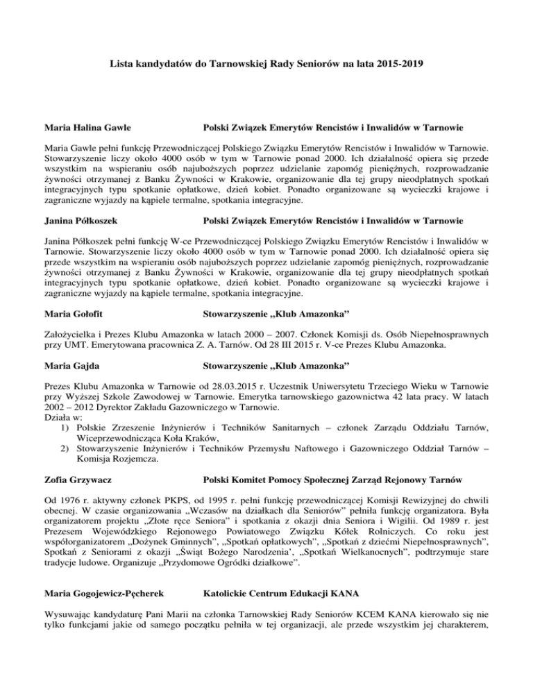 Lista kandydatów do Tarnowskiej Rady Seniorów na lata 2015-2019 Maria Halina Gawle Polski Związek Emerytów Rencistów i Inwalidów w Tarnowie Maria Gawle pełni funkcję Przewodniczącej Polskiego Związku Emerytów Rencistów i Inwalidów w Tarnowie. Stowarzyszenie liczy około 4000 osób w tym w Tarnowie ponad 2000. Ich działalność opiera się przede wszystkim na wspieraniu osób najuboższych poprzez udzielanie zapomóg pieniężnych, rozprowadzanie żywności otrzymanej z Banku Żywności w Krakowie, organizowanie dla tej grupy nieodpłatnych spotkań integracyjnych typu spotkanie opłatkowe, dzień kobiet. Ponadto organizowane są wycieczki krajowe i zagraniczne wyjazdy na kąpiele termalne, spotkania integracyjne. Janina Półkoszek Polski Związek Emerytów Rencistów i Inwalidów w Tarnowie Janina Półkoszek pełni funkcję W-ce Przewodniczącej Polskiego Związku Emerytów Rencistów i Inwalidów w Tarnowie. Stowarzyszenie liczy około 4000 osób w tym w Tarnowie ponad 2000. Ich działalność opiera się przede wszystkim na wspieraniu osób najuboższych poprzez udzielanie zapomóg pieniężnych, rozprowadzanie żywności otrzymanej z Banku Żywności w Krakowie, organizowanie dla tej grupy nieodpłatnych spotkań integracyjnych typu spotkanie opłatkowe, dzień kobiet. Ponadto organizowane są wycieczki krajowe i zagraniczne wyjazdy na kąpiele termalne, spotkania integracyjne. Maria Gołofit Stowarzyszenie „Klub Amazonka” Założycielka i Prezes Klubu Amazonka w latach 2000 – 2007. Członek Komisji ds. Osób Niepełnosprawnych przy UMT. Emerytowana pracownica Z. A. Tarnów. Od 28 III 2015 r. V-ce Prezes Klubu Amazonka. Maria Gajda Stowarzyszenie „Klub Amazonka” Prezes Klubu Amazonka w Tarnowie od 28.03.2015 r. Uczestnik Uniwersytetu Trzeciego Wieku w Tarnowie przy Wyższej Szkole Zawodowej w Tarnowie. Emerytka tarnowskiego gazownictwa 42 lata pracy. W latach 2002 – 2012 Dyrektor Zakładu Gazowniczego w Tarnowie. Działa w: 1) Polskie Zrzeszenie Inżynierów i Techników Sanitarnych – członek Zarządu Oddziału Tarnów, Wiceprzewodnicząca Koła Kraków, 2) Stowarzyszenie Inżynierów i Techników Przemysłu Naftowego i Gazowniczego Oddział Tarnów – Komisja Rozjemcza. Zofia Grzywacz Polski Komitet Pomocy Społecznej Zarząd Rejonowy Tarnów Od 1976 r. aktywny członek PKPS, od 1995 r. pełni funkcję przewodniczącej Komisji Rewizyjnej do chwili obecnej. W czasie organizowania „Wczasów na działkach dla Seniorów” pełniła funkcję organizatora. Była organizatorem projektu „Złote ręce Seniora” i spotkania z okazji dnia Seniora i Wigilii. Od 1989 r. jest Prezesem Wojewódzkiego Rejonowego Powiatowego Związku Kółek Rolniczych. Co roku jest współorganizatorem „Dożynek Gminnych”, „Spotkań opłatkowych”, „Spotkań z dziećmi Niepełnosprawnych”, Spotkań z Seniorami z okazji „Świąt Bożego Narodzenia’, „Spotkań Wielkanocnych”, podtrzymuje stare tradycje ludowe. Organizuje „Przydomowe Ogródki działkowe”. Maria Gogojewicz-Pęcherek Katolickie Centrum Edukacji KANA Wysuwając kandydaturę Pani Marii na członka Tarnowskiej Rady Seniorów KCEM KANA kierowało się nie tylko funkcjami jakie od samego początku pełniła w tej organizacji, ale przede wszystkim jej charakterem, mentalnością i postawą społeczną dzięki której zjednała sobie przychylność seniorów. Uczestniczyła w wielu projektach dotyczących działań seniorów, m.in. jest iAmbasadorem pomagając innym w korzystaniu z narzędzi multimedialnych. Bierze czynny udział w życiu kulturalnym miasta a w KANIE wykonuje swoją pasję tworząc materiały filmowe i fotograficzne. Kazimiera Legieć Katolickie Centrum Edukacji KANA Pani Kazimiera znana jest z działalności społecznej na polu pro zdrowotnych śledząc i informując pozostałych uczestników zajęć w KANIE o możliwościach jakie oferują programy dedykowane seniorom w kwestii zdrowia i samopoczucia. W KANIE realizuje się od początku istnienia Centrum. Pozytywnie usposobiona do innych oraz otwarta na nowe pomysły i generująca nowatorskie rozwiązywania. Uczestniczyła w wielu projektach dotyczących działań seniorów, m.in. jest i Ambasadorem pomagającym innym w korzystaniu z narzędzi multimedialnych. Bierze czynny udział w działaniach MCAS-ów. Danuta Kisielewska Senior Na Czasie Pani Danuta jest osobą bardzo aktywną od początku istnienia Klubu Seniora „Kolorowa Jesień”. Pełni funkcję przewodniczącej do chwili obecnej. Jest osobą angażującą się w wielorakie zadania promujące idee uczenia się w każdym wieku. Ponadto jest osobą oddaną rzetelną i wypełniającą swe obowiązki sumiennie. Zawsze kieruje się sercem i interes drugiego człowieka przedkłada nad swój. Marian Sarkowicz Rada Osiedla nr 2 Strusina Kandydat Marian Sarkowicz jest emerytowanym Komendantem Miejskim Policji w Tarnowie. Posiada wykształcenie prawnicze w stopniu inspektora. Pełni funkcję społeczną Prezesa Stowarzyszenia Emerytów i Rencistów Policyjnych oraz przewodzi emerytom służb mundurowych: wojska, straży pożarnej i więziennictwa. Aktywnie działa w Radzie Osiedla i w Zarządzie Osiedla od wielu lat jako Wiceprzewodniczący Zarządu. Od 25 lat pełni funkcje Prezesa Zarządu Rodzimego Ogrodu Działkowego „Szarotka N. str.” w Tarnowie oraz Przewodniczącego Kolegium Prezesów Ogrodów Działkowych w Okręgu Tarnowskim skupiającym 5000 członków – działkowców Seniorów. Prace wykonuje społecznie. Wspiera silnie Uniwersytet Trzeciego Wieku poprzez kierowanie tam podopiecznych seniorów. Maria Papuga Rada Osiedla nr 5 Rzędzin Wieloletnia członkini Rady Osiedla Nr 5 „Rzędzin” – od czterech kadencji. Aktywna i zaangażowana w sprawy osiedla. Obecnie pełni funkcję Zastępcy Przewodniczącego Zarządu Osiedla. Lucyna Kalemba Rada Osiedla nr 8 Mościce Przedstawiciel Rady Osiedla. Pielęgniarka, długoletni pracownik Oddziału Szpitalnego Chorób Wewn