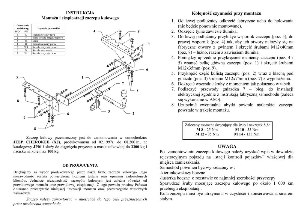INSTRUKCJA MontaŜu i eksploatacji zaczepu kulowego Oznaczenie zacisku wg ISO PN 1 L 2 + 3 31 4 R 5 58R 6 54 7 58L Kolejność czynności przy montaŜu Łączenie przewodów 4 8 Kierunkowskazy lewe Tylne światła przeciwmgłowe Masa Kierunkowskazy prawe Światła pozycyjne prawe Światła hamowania Światła pozycyjne lewe 9 6 5 1 7 8 8 6 3 2 1. Od lewej podłuŜnicy odkręcić fabryczne ucho do holowania (nie będzie ponownie montowane). 2. Odkręcić tylne zawiesie tłumika. 3. Do lewej podłuŜnicy przyłoŜyć wspornik zaczepu (poz. 5), do prawej wspornik (poz. 4) tak, aby ich otwory nałoŜyły się na fabryczne otwory z gwintem i skręcić śrubami M12x40mm (poz. 8) – luźno, razem z zawiesiem tłumika. 4. Pomiędzy uprzednio przykręcone elementy zaczepu (poz. 4 i 5) wsunąć belkę główną zaczepu (poz. 1) i skręcić śrubami M12x35mm (poz. 9). 5. Przykręcić część kulistą zaczepu (poz. 2) wraz z blachą pod gniazdo (poz. 3) śrubami M12x75mm (poz. 7) z wyposaŜenia. 6. Dokręcić wszystkie śruby z momentem jak pokazano w tabeli. 7. Podłączyć przewody gniazdka 7 – bieg. do instalacji elektrycznej zgodnie z instrukcją fabryczną samochodu (zaleca się wykonanie w ASO). 8. Uzupełnić ewentualne ubytki powłoki malarskiej zaczepu powstałe w trakcie montaŜu. 9 8 Zaczep kulowy przeznaczony jest do zamontowania w samochodzie: JEEP CHEROKEE (XJ), produkowanym od 02.1997r. do 08.2001r., nr katalogowy JP01 i słuŜy do ciągnięcia przyczep o masie całkowitej do 3300 kg i nacisku na kulę max 100 kg. OD PRODUCENTA Dziękujemy za wybór produkowanego przez naszą firmę zaczepu kulowego. Jego niezawodność została potwierdzona licznymi testami oraz opiniami zadowolonych klientów. JednakŜe niezawodność zaczepów kulowych jest zaleŜna równieŜ od prawidłowego montaŜu oraz prawidłowej eksploatacji. Z tego powodu prosimy Państwa o staranne przeczytanie niniejszej instrukcji montaŜu oraz przestrzeganie właściwych wskazówek. Zaczep naleŜy zamontować w miejscach do tego celu przeznaczonych przez producenta samochodu. Zalecany moment skręcający dla śrub i nakrętek 8,8: M 8 - 25 Nm M 10 - 55 Nm M 12 - 85 Nm M 14 - 135 Nm UWAGA Po zamontowaniu zaczepu kulowego naleŜy uzyskać wpis w dowodzie rejestracyjnym pojazdu na „stacji kontroli pojazdów” właściwej dla miejsca zamieszkania. Samochód powinien być wyposaŜony w : -kierunkowskazy boczne -lusterka boczne o rozstawie co najmniej szerokości przyczepy Sprawdzać śruby mocujące zaczepu kulowego po około 1 000 km przebiegu eksploatacji. Kula zaczepu musi być utrzymana w czystości i konserwowana smarem stałym. PPUH AUTO-HAK S.J. WyposaŜenie zaczepu: Produkcja Zaczepów Kulowych Henryk & Zbigniew Nejman 76-200 SŁUPSK ul. Słoneczna 16K tel/fax (059) 8-414-414; 8-414-413 E-mail: [email protected] www. autohak.com.pl Zaczep kulowy bez wyposaŜenia elektrycznego Klasa: A50-X Nr kat. JP01 Przeznaczony do zamontowania w samochodzie: Producent: JEEP Model: CHEROKEE (XJ) produkowanym od 02.1997r. do 08.2001r. Dane techniczne: wartość siły D: 13,0 kN maksymalna masa przyczepy: 3300 kg maksymalny nacisk na kulę: 100 kg Numer homologacji zgodnie z dyrektywą 94/20/WE: e20*94/20*0323*00 KARTA GWARANCYJNA Producent udziela gwarancji niniejszą kartą gwarancyjną na okres 24 miesięcy licząc od dnia zakupu zaczepu kulowego do samochodu: INFORMACJA WSTĘPNA JEEP CHEROKEE (XJ) produkowanego od 02.1997r. do 08.2001r. Data produkcji .............................. Data zakupu............................................. Zakres gwarancji obejmuje wyłącznie wady jakościowe wynikające z winy producenta. Gwarancja nie obejmuje natomiast uszkodzeń zawinionych przez nabywcę, wynikających z niewłaściwego montaŜu, uŜytkowania lub konserwacji, uszkodzeń mechanicznych, normalnego zuŜycia podczas eksploatacji itp. Gwarancja udzielona na zakupiony towar nie wyłącza, nie ogranicza ani nie zawiesza uprawnień kupującego wynikających z niezgodności towaru z umową. Reklamacje naleŜy zgłaszać w punkcie sprzedaŜy, składając jednocześnie kartę gwarancyjną. Usunięcie "wady" następuje po stwierdzeniu przez punkt sprzedaŜy wspólnie z producentem słuszności złoŜonej reklamacji. Reklamacja powinna być załatwiona w ciągu 14 dni od dnia uznania reklamacji. Karta gwarancyjna jest niewaŜna jeŜeli nie jest wypełniona i podpisana. Data zgłoszenia reklamacji: ................................................................... Zaczep kulowy jest skonstruowany zgodnie z zasadami bezpieczeństwa ruchu drogowego. Zaczep kulowy jest elementem wpływającym na bezpieczeństwo jazdy i moŜe zostać zainstalowany wyłącznie przez personel wyspecjalizowany. Niedopuszczalne jest dokonywanie jakichkolwiek zmian w konstrukcji zaczepu. Powoduje to wygaśniecie dopuszczenia do stosowania. W przypadku obecności masy izolacyjnej lub osłony podwozia w miejscu przylegania zaczepu, naleŜy ją usunąć. Nieosłonięte miejsca karoserii oraz wywiercone otwory naleŜy pomalować farbą antykorozyjną. Informacjami wiąŜącymi odnośnie wartości obciąŜeń są dane podawane przez producenta samochodu, względnie wartości maksymalnej masy przyczepy oraz maksymalnego nacisku na kulę, przy czym wartości parametrów zaczepu kulowego nie mogą być przekroczone. Wzór do obliczania wartości siły D: Maks. masa przyczepy [kg] x Maks. masa samochodu [kg] Maks. masa przyczepy [kg] + Maks. masa samochodu [kg] X 9,81 = 1000 D [kN]