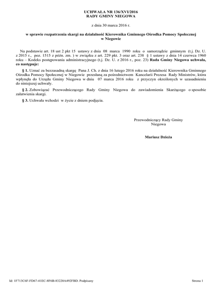 UCHWAŁA NR 136/XVI/2016 RADY GMINY NIEGOWA z dnia 30 marca 2016 r. w sprawie rozpatrzenia skargi na działalność Kierownika Gminnego Ośrodka Pomocy Społecznej w Niegowie Na podstawie art. 18 ust 2 pkt 15 ustawy z dnia 08 marca 1990 roku o samorządzie gminnym (t.j. Dz. U. z 2015 r., poz. 1515 z późn. zm. ) w związku z art. 229 pkt. 3 oraz art. 238 § 1 ustawy z dnia 14 czerwca 1960 roku – Kodeks postępowania administracyjnego (t.j. Dz. U. z 2016 r., poz. 23) Rada Gminy Niegowa uchwala, co następuje: § 1. Uznać za bezzasadną skargę Pana J. Ch. z dnia 16 lutego 2016 roku na działalność Kierownika Gminnego Ośrodka Pomocy Społecznej w Niegowie przesłaną za pośrednictwem Kancelarii Prezesa Rady Ministrów, która wpłynęła do Urzędu Gminy Niegowa w dniu 07 marca 2016 roku z przyczyn określonych w uzasadnieniu do niniejszej uchwały. § 2. Zobowiązać Przewodniczącego Rady Gminy Niegowa do zawiadomienia Skarżącego o sposobie załatwienia skargi. § 3. Uchwała wchodzi w życie z dniem podjęcia. Przewodniczący Rady Gminy Niegowa Mariusz Dzieża Id: 1F713C6F-FD67-41EC-8F6B-83220A492FBD. Podpisany Strona 1 Uzasadnienie W dniu 07 marca 2016 roku wpłynęła do Urzędu Gminy Niegowa skarga Pana J. Ch. z dnia 16 lutego 2016 roku przesłana za pośrednictwem Kancelarii Prezesa Rady Ministrów wraz z pismem z dnia 26 lutego 2016 roku Nr DSO.SWA.5710.268.2016.EZ. Zgodnie z kompetencjami skarga została przekazana do rozpatrzenia przez Komisję Rewizyjną. Komisja Rewizyjna na posiedzeniu w dniu 22 marca 2016 roku dokonała analizy i rozpatrzenia skargi Pana J. Ch. na działalność Kierownika Gminnego Ośrodka Pomocy Społecznej w Niegowie. Skarżący stawia zarzuty dotyczące opieszałości rozpatrzenia spraw dotyczących: 1) przyznania stypendium szkolnego za okres od września 2015 roku do grudnia 2015 roku, 2) dożywiania dzieci w szkole, 3) zasiłku opiekuńczego dla żony z tytułu opieki nad skarżącym, 4) niestosownego zachowania w kontaktach osobistych. pracowników Gminnego Ośrodka Pomocy Społecznej w Niegowie Odpowiedzi na postawione zarzuty udzieliły pod nieobecność (z powodu choroby) Pani Renaty MędrekOciepka Kierownika GOPS w Niegowie obecne na posiedzeniu Komisji pracownice GOPS w Niegowie: Pani Iwona Madej - Specjalista pracy socjalnej oraz Pani Katarzyna Siwek – pracownik socjalny. Odpowiedź została również przekazana Komisji w formie pisemnej dokumentem z dnia 14 marca 2016 roku. Wyjaśniono, że w sprawach objętych skargą, tj.: w sprawie przyznania stypendium szkolnego za okres od września 2015 roku do grudnia 2015 roku, dożywiania dzieci w szkole jak również zasiłku opiekuńczego dla żony z tytułu opieki nad skarżącym – Skarżący nie złożył stosownych wniosków, które byłyby podstawą do wydania decyzji administracyjnych i ewentualnie umożliwiłyby wypłatę świadczeń. W sprawie o stypendium szkolne Skarżący był w GOPS w miesiącu październiku 2015 roku. Wniosek o przyznanie stypendium szkolnego na rok szkolny należy składać w nieprzekraczalnym terminie do 15 września. W październiku 2015 roku złożenie wniosku o stypendium szkolne na rok szkolny 2015-2016 było nie możliwe. Natomiast w każdej chwili zainteresowany może złożyć wniosek o dożywianie lub inne świadczenie, które przysługują zgodnie z obowiązującymi przepisami. Ponadto Pani Iwona Madej wyjaśnia, że Pan J. Ch. od wielu lat jest beneficjentem GOPS i pobierał świadczenia socjalne i rodzinne. Od miesiąca lipca 2015 roku GOPS zaprzestał wypłacania zasiłku stałego z uwagi na przekroczenie przez Rodzinę Skarżącego kryterium dochodowego (Pan J. Ch. sprzedał część gospodarstwa rolnego oraz przyznana została mu renta z KRUS - tego faktu nie zgłosił, – pomimo takiego obowiązku - pracownikom GOPS). W świetle przepisów stanowi to dochód uzyskany zgodnie z art. 8 ust. 11 pkt 2 oraz ust. 12 ustawy o pomocy społecznej, dlatego Skarżący musiał zwrócić zasiłek stały jako świadczenie nienależnie pobrane. Na rok 2015-2016 ma przyznane i pobiera zasiłki rodzinne. Zgodnie z deklaracją Pracowników GOPS - jeśli Rodzina Pana J. Ch. znajdzie się w trudnej sytuacji, zawsze może zwrócić się do GOPS o pomoc. Musi jednak spełniać wymogi określone przepisami prawa w tym zakresie, a szczególnie w zakresie kryterium dochodowego. W części dotyczącej niestosownego zachowania pracowników Gminnego Ośrodka Pomocy Społecznej w Niegowie w kontaktach osobistych, Pani Iwona Madej wyjaśniła, że Pracownicy GOPS dokładają wszelkich starań, aby powierzone im zadania realizowane były prawidłowo. Według Wyjaśniającej, za niestosowne zachowanie może zostać uznana np. odmowa przyznania beneficjentowi pomocy lub wniosek ze strony Ośrodka Pomocy Społecznej dotyczący przedstawienia okoliczności mogących niekorzystnie wpłynąć na przyznanie świadczenia. Często w takich sytuacjach osoby korzystające z pomocy społecznej zaczynają unikać pracowników socjalnych, mimo, że do takiej współpracy są zobowiązane– zgodnie z art. 11 ust 2 ustawy o pomocy społecznej. Brak współdziałania stron może stanowić podstawę do odmowy przyznania świadczenia, uchylenia decyzji o przyznaniu świadczenia lub wstrzymania świadczeń pieniężnych z pomocy społecznej. Komisja Rewizyjna po zapoznaniu się z dostarczonymi dokumentami i przedstawionym wyjaśnieniem stwierdziła, co następuje: Skarżący stawia zarzuty dotyczące opieszałości rozpatrzenia spraw dotyczących: przyznania stypendium szkolnego za okres od września 2015 roku do grudnia 2015 roku, dożywiania dzieci w szkole i zasiłku opiekuńczego dla żony z tytułu opieki nad skarżącym. Pracownice Gminnego Ośrodka Pomocy Społecznej w Niegowie stwierdziły, że Skarżący korzysta praktycznie z wszystkich możliwych form pomocy. Nie może natomiast otrzymać świadczeń, o które nie wnioskował. Komisja Rewizyjna uznała, iż nie dysponuje żadnym