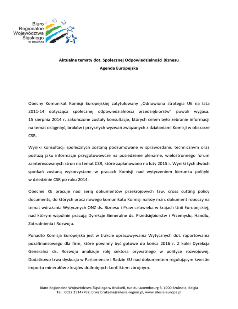 Aktualne tematy dot. Społecznej Odpowiedzialności Biznesu Agenda Europejska Obecny Komunikat Komisji Europejskiej zatytułowany „Odnowiona strategia UE na lata 2011-14 dotycząca społecznej odpowiedzialności przedsiębiorstw” powoli wygasa. 15 sierpnia 2014 r. zakończone zostały konsultacje, których celem było zebranie informacji na temat osiągnięć, braków i przyszłych wyzwań związanych z działaniami Komisji w obszarze CSR. Wyniki konsultacji społecznych zostaną podsumowane w sprawozdaniu technicznym oraz posłużą jako informacje przygotowawcze na posiedzenie plenarne, wielostronnego forum zainteresowanych stron na temat CSR, które zaplanowano na luty 2015 r. Wyniki tych dwóch spotkań zostaną wykorzystane w pracach Komisji nad wytyczeniem kierunku polityki w dziedzinie CSR po roku 2014. Obecnie KE pracuje nad serią dokumentów przekrojowych tzw. cross cutting policy documents, do których prócz nowego komunikatu Komisji należy m.in. dokument roboczy na temat wdrażania Wytycznych ONZ ds. Biznesu i Praw człowieka w krajach Unii Europejskiej, nad którym wspólnie pracują Dyrekcje Generalne ds. Przedsiębiorstw i Przemysłu, Handlu, Zatrudnienia i Rozwoju. Ponadto Komisja Europejska jest w trakcie opracowywania Wytycznych dot. raportowania pozafinansowego dla firm, które powinny być gotowe do końca 2016 r. Z kolei Dyrekcja Generalna ds. Rozwoju analizuje rolę sektora prywatnego w polityce rozwojowej. Dodatkowo trwa dyskusja w Parlamencie i Radzie EU nad dokumentem regulującym kwestie importu minerałów z krajów dotkniętych konfliktem zbrojnym. Biuro Regionalne Województwa Śląskiego w Brukseli, rue du Luxembourg 3, 1000 Bruksela, Belgia Tel.: 0032 25147767, [email protected], www.silesia-europa.pl Co więcej, CSR jest jednym z priorytetów podkomisji ds. Praw Człowieka Parlamentu Europejskiego, która obecnie pracuje nad raportem w sprawie Europejskiego Funduszu na rzecz Demokracji (European Endowment for Democracy - EED). EED jest inicjatywą polskiej prezydencji, której misją jest wspieranie przemian demokratycznych w południowym i wschodnim sąsiedztwie Unii Europejskiej. Swoje działania Fundusz kieruje głównie do młodych liderów prowadzących działania prodemokratyczne, niezależnych mediów, dziennikarzy, blogerów, instytucji pozarządowych. Z kolei Komisja Ochrony Środowiska, Zdrowia i Praw Konsumentów PE pracuje nad raportem w sprawie dyrektywy dot. ograniczenia emisji niektórych zanieczyszczeń do powietrza ze średnich obiektów energetycznego spalania (MCP). Opracowanie: Karolina Dutkiewicz Biuro Regionalne Województwa Śląskiego w Brukseli, rue du Luxembourg 3, 1000 Bruksela, Belgia Tel.: 0032 25147767, [email protected], www.silesia-europa.pl