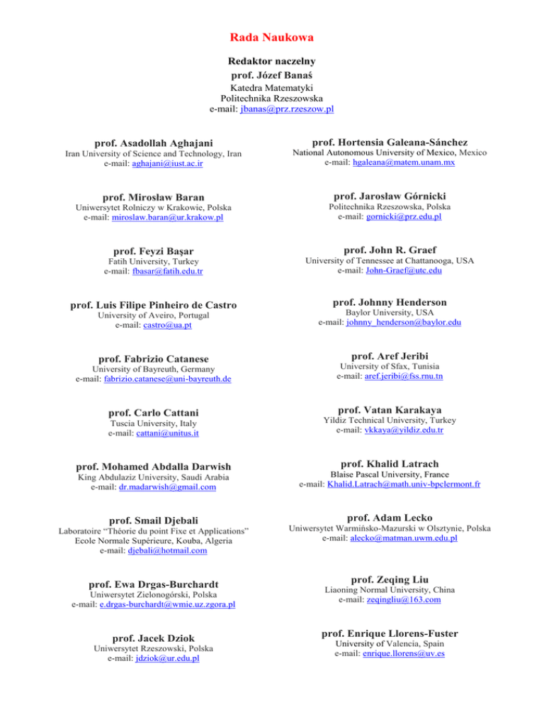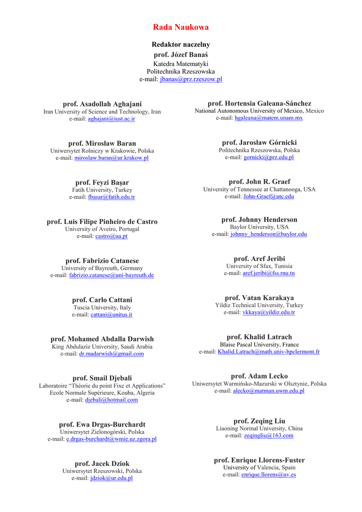 Rada Naukowa Redaktor naczelny prof. Józef Banaś Katedra Matematyki Politechnika Rzeszowska e-mail: [email protected] prof. Asadollah Aghajani prof. Hortensia Galeana-Sánchez Iran University of Science and Technology, Iran e-mail: [email protected] National Autonomous University of Mexico, Mexico e-mail: [email protected] prof. Mirosław Baran prof. Jarosław Górnicki Uniwersytet Rolniczy w Krakowie, Polska e-mail: [email protected] Politechnika Rzeszowska, Polska e-mail: [email protected] prof. Feyzi Başar prof. John R. Graef Fatih University, Turkey e-mail: [email protected] University of Tennessee at Chattanooga, USA e-mail: [email protected] prof. Luis Filipe Pinheiro de Castro prof. Johnny Henderson University of Aveiro, Portugal e-mail: [email protected] prof. Fabrizio Catanese University of Bayreuth, Germany e-mail: [email protected] prof. Carlo Cattani Tuscia University, Italy e-mail: [email protected] prof. Mohamed Abdalla Darwish King Abdulaziz University, Saudi Arabia e-mail: [email protected] prof. Smail Djebali Laboratoire “Théorie du point Fixe et Applications” Ecole Normale Supérieure, Kouba, Algeria e-mail: [email protected] prof. Ewa Drgas-Burchardt Uniwersytet Zielonogórski, Polska e-mail: [email protected] prof. Jacek Dziok Uniwersytet Rzeszowski, Polska e-mail: [email protected] Baylor University, USA e-mail: [email protected] prof. Aref Jeribi University of Sfax, Tunisia e-mail: [email protected] prof. Vatan Karakaya Yildiz Technical University, Turkey e-mail: [email protected] prof. Khalid Latrach Blaise Pascal University, France e-mail: [email protected] prof. Adam Lecko Uniwersytet Warmińsko-Mazurski w Olsztynie, Polska e-mail: [email protected] prof. Zeqing Liu Liaoning Normal University, China e-mail: [email protected] prof. Enrique Llorens-Fuster University of Valencia, Spain e-mail: [email protected] prof. Mohamed-Aziz Taoudi prof. Tomas Madaras Cadi Ayyad University, Morocco e-mail: [email protected] Pavol Jozef Šafárik University in Košice, Slovakia e-mail: [email protected] prof. Eberhard Malkowsky prof. Paweł Traczyk Fatih University, Turkey e-mail: [email protected] Uniwersytet Warszawski, Polska e-mail: [email protected] prof. Mohammad Mursaleen prof. Cemil Tunc Aligarh Muslim University, India e-mail: [email protected] Yuzuncu Yil University, Turkey e-mail: [email protected] prof. Leszek Olszowy prof. Dov Bronisław Wajnryb Politechnika Rzeszowska, Polska e-mail: [email protected] Politechnika Rzeszowska, Polska e-mail: [email protected] prof. Franciszek Prus-Wiśniowski Uniwersytet Szczeciński, Polska e-mail: [email protected] prof. Andrzej Walendziak Uniwersytet Przyrodniczo-Humanistyczny w Siedlcach, Polska e-mail: [email protected] prof. Andrzej Wiśnicki prof. Vicentiu Radulescu Politechnika Rzeszowska, Polska e-mail: [email protected] Romanian Academy, Romania e-mail: [email protected] prof. Andrzej Włoch prof. Dušan Repovš Politechnika Rzeszowska, Polska e-mail: [email protected] University of Ljubljana, Slovenia e-mail: [email protected] prof. Iwona Włoch prof. Kishin Sadarangani Politechnika Rzeszowska, Polska e-mail: [email protected] University of Las Palmas de Gran Canaria, Spain e-mail: [email protected] prof. Janusz Sokół Politechnika Rzeszowska, Polska e-mail: [email protected] prof. Mariusz Woźniak Akademia Górniczo-Hutnicza w Krakowie, Polska e-mail: [email protected] prof. Xiao-Jun Yang China University of Mining and Technology, China e-mail: [email protected]