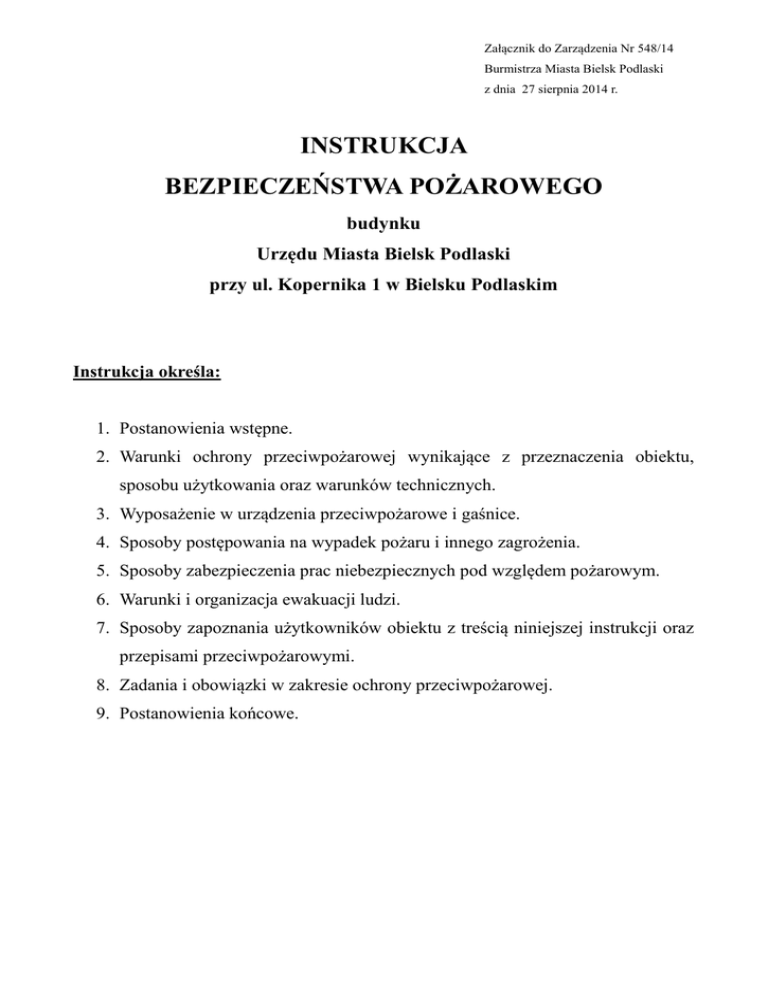 Załącznik do Zarządzenia Nr 548/14 Burmistrza Miasta Bielsk Podlaski z dnia 27 sierpnia 2014 r. INSTRUKCJA BEZPIECZEŃSTWA POŻAROWEGO budynku Urzędu Miasta Bielsk Podlaski przy ul. Kopernika 1 w Bielsku Podlaskim Instrukcja określa: 1. Postanowienia wstępne. 2. Warunki ochrony przeciwpożarowej wynikające z przeznaczenia obiektu, sposobu użytkowania oraz warunków technicznych. 3. Wyposażenie w urządzenia przeciwpożarowe i gaśnice. 4. Sposoby postępowania na wypadek pożaru i innego zagrożenia. 5. Sposoby zabezpieczenia prac niebezpiecznych pod względem pożarowym. 6. Warunki i organizacja ewakuacji ludzi. 7. Sposoby zapoznania użytkowników obiektu z treścią niniejszej instrukcji oraz przepisami przeciwpożarowymi. 8. Zadania i obowiązki w zakresie ochrony przeciwpożarowej. 9. Postanowienia końcowe. PODSTAWA PRAWNA OPRACOWANIA: 1. Ustawa z dnia 24 sierpnia 1991 r. o ochronie przeciwpożarowej (Dz. U. nr 178, poz. 1380 z 2009 r.) 2. Rozporządzenie Ministra Infrastruktury z dnia 12 kwietnia 2002 r. w sprawie warunków technicznych jakim powinny odpowiadać budynki i ich usytuowanie (Dz. U. nr 75, poz. 690 z 2002 r.) 3. Rozporządzenie Ministra Spraw Wewnętrznych i Administracji z dnia 7 czerwca 2010 r. w sprawie ochrony przeciwpożarowej budynków, innych obiektów budowlanych i terenów (Dz. U. nr 109, poz. 719 z 2010 r.) 4. Ustawa z dnia 26 kwietnia 2007 r. o zarządzaniu kryzysowym (Dz. U. nr 89, poz. 590 z 2007 r.) 5. Dyrektywa 92/58/EWG w sprawie minimalnych wymagań dla zapewnienia znaków bezpieczeństwa i/lub higieny pracy. 2 SPIS TREŚCI Tytuł rozdziału Numer Numer rozdziału strony 1 Postanowienia wstępne 2 Warunki ochrony 4 przeciwpożarowej wynikające 6 z przeznaczenia obiektu, sposobu użytkowania oraz warunków technicznych 3 Wyposażenie w urządzenia przeciwpożarowe 14 Sposoby postępowania na wypadek pożaru i innego 18 i gaśnice 4 zagrożenia 5 Sposoby zabezpieczania prac niebezpiecznych pod 24 względem pożarowym 6 Warunki i organizacja ewakuacji ludzi 27 7 Sposoby zapoznania użytkowników obiektu z treścią 31 niniejszej instrukcji oraz przepisami przeciwpożarowymi 8 Zadania i obowiązki w zakresie ochrony 33 przeciwpożarowej 9 Postanowienia końcowe 36 10 Karta aktualizacji Instrukcji oraz zmian i uzupełnień 39 3 Rozdział 1 POSTANOWIENIA WSTĘPNE Zgodnie z Ustawą z dnia 24 sierpnia 1991 r. opublikowaną w Dz. U. nr 178, poz. 1380 z 2009 r. ochrona przeciwpożarowa polega na realizacji przedsięwzięć mających na celu ochronę życia, zdrowia, mienia lub środowiska przed pożarem, klęską żywiołową lub innym miejscowym zagrożeniem poprzez: 1. zapobieganie powstawaniu i rozprzestrzenianie się pożaru, klęski żywiołowej lub innego miejscowego zagrożenia, 2. zapewnienie sił i środków do zwalczania pożaru, klęski żywiołowej lub innego miejscowego zagrożenia, 3. prowadzenie działań ratowniczych. Odpowiedzialność za realizację obowiązków wynikających z wyżej wymienionej ustawy w budynku Urzędu Miasta Bielsk Podlaski oraz na terenie przynależnym Urzędowi ponosi ich zarządca, czyli Burmistrz Miasta Bielsk Podlaski. Celem zapewnienia ochrony przeciwpożarowej zobowiązany jest on w szczególności: 1. przestrzegać przeciwpożarowych wymagań techniczno – budowlanych, instalacyjnych i technologicznych, 2. wyposażyć budynek, obiekt budowlany lub teren w wymagane urządzenia przeciwpożarowe i gaśnice, 3. zapewnić konserwację oraz naprawy urządzeń przeciwpożarowych i gaśnic w sposób gwarantujący ich sprawne i niezawodne funkcjonowanie, 4. zapewnić osobom przebywającym w budynku, obiekcie budowlanym lub na terenie bezpieczeństwo i możliwość ewakuacji, 4 5. przygotować budynek, obiekt budowlany lub teren do prowadzenia akcji ratowniczej, 6. zapoznać pracowników z przepisami przeciwpożarowymi, 7. ustalić sposoby postępowania na wypadek pożaru, klęski żywiołowej lub innego miejscowego zagrożenia. Rozporządzenie Ministra Spraw Wewnętrznych i Administracji z dnia 7 czerwca 2010 r. w sprawie ochrony przeciwpożarowej budynków, innych obiektów budowlanych i terenów (Dz. U. nr 109, poz. 719 z 2010 r.) zobowiązuje Burmistrza Miasta Bielsk Podlaski, jako zarządcę budynku Urzędu Miasta, do zapewnienia i wdrożenia Instrukcji bezpieczeństwa pożarowego. Ustalenia niniejszej Instrukcji w całości obowiązują wszystkich pracowników Urzędu a także w ograniczonym zakresie obowiązują wszystkich użytkowników obiektu oraz pracowników firm zewnętrznych, wykonujących zlecone im na terenie obiektu prace. 5 Rozdział 2 WARUNKI OCHRONY PRZECIWOŻAROWEJ WYNIKAJĄCE Z PRZEZNACZENIA OBIEKTU, SPOSOBU UŻYTKOWANIA ORAZ WARUNKÓW TECHNICZNYCH 2.1. Dane informacyjne i techniczne budynku. Nazwa Urząd Miasta Bielsk Podlaski Adres ul. Kopernika 1, 17-100 Bielsk Podlaski Właściciel Gmina Miejska Bielsk Podlaski Pow. użytkowa 1678,80 m2 Pow. całkowita 2480,00 m2 Pow. zabudowy 629,00 m2 Kubatura 6539,00 m2 Budynek Urzędu Miasta Bielsk Podlaski jest obiektem użyteczności publicznej, gdzie odbywa się praca administracyjno – biurowa. Jest to budynek wolnostojący, murowany, częściowo podpiwniczony, składa się z parteru, 2 pięter oraz poddasza. Posiada 2 klatki schodowe prowadzące bezpośrednio do wyjść ewakuacyjnych oraz dźwig osobowy, jak również łącznik prowadzący do budynku Urzędu Gminy oraz Starostwa Powiatowego w Bielsku Podlaskim. Dach budynku pokryty jest blachą dachówkową. Teren wokół budynku utwardzony jest kostką brukową oraz asfaltem. Wjazd na plac wewnętrzny odbywa się bezpośrednio z ul. Kopernika. Ze względu na wysokość, budynek kwalifikowany jest jako niski „N”. (Budynki niskie - są to budynki których wysokość nie przekracza 12 metrów nad poziomem terenu 6 lub inaczej mówiąc liczba kondygnacji nadziemnych takiego budynku jest mniejsza bądź równa czterem (4). 2.2. Dane konstrukcyjno – materiałowe. Parter: posadzki – gres, wyko