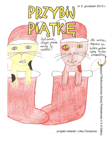 Przybij piątkę nr 2 W tym numerze: CO SŁYCHAĆ W SP NR 5 2. Wywiad z Panią ze sklepiku Apel do Mikołaja Sportowe laury i andrzejkowe wygibasy 3. Najazd misiów na bibliotekę PSTRYK 4. Misie w obiektywie KĄCIK HUMANISTY i ARTYSTY 5. Nieznane mitologiczne historie Szkicuję, bo lubię.... 6. Słowo stało się obrazem. „Opisy” przyrody, które nie są nudne ROZRYWKA 7. Krzyżówki, komiksy Kupon zwalniający z odpowiedzi ustnej PRZEZ DZIURKĘ OD KLUCZA 8. Mikołajkowe nastroje Tajemni Mo Marek Andrzejkowa dżampreza Weronika Pigóra 21 listopada odbyła się w szkole dyskoteka. Zorganizowana została z okazji zbliżających się andrzejek. Program był bardzo ciekawy. Wśród atrakcji nie zabrakło poczęstunku, tańca i wróżb.Było jak na prawdziwej dyskotece. Nawet chłopcy nie bali się prosić dziewczyny do tańca- podsumowuje Joasia Świątek, uczennica klasy V „c”. Obsypani złotem Marianna Skiba Gofr - młodszy brat naleśnika W szkolnym sklepiku gofry cieszą się niesłabnącą popularnością. Jedzone o każdej porze, przed obiadem i tuż po, zawsze znajdzie się na nie jeszcze trochę miejsca w żołądku. Czy jest w szkole ktoś, kto nigdy nie kupił gofra. Wątpliwa sprawa... Unihokejowe drużyny ze szkoły podstawowej nr.5 w Dębicy zawalczyły o złote medale. 23 października dla drużyn chłopców i dziewcząt był wspaniałym dniem. Trzeba przyznać, że zawodnicy grali bardzo dobrze, co zaowocowało złotymi medalami. Obu drużynom gratulujemy!!! Bardzo typowy o tej porze apel Drogi Mikołaju! fot. źródło: internet Z Panią ze sklepiku o gofrach i gofromaniakach rozmawiają dziennikarze SP5. Dziennikarze SP 5: Skąd wziął się pomysł na gofry w sklepiku szkolnym? Pani ze sklepiku: Bo wszystkie dzieci lubią gofry... Jaka jest tajemnica smaku gofrów? Jak Pani robi ciasto? Kiedy? Zawsze są świeże, a ciasto robię rano. Około ilu sztuk gofrów sprzedaje Pani dziennie? Różnie, raz więcej, raz mniej. Czy Pan Dyrektor kupuje gofry? (Jeśli tak, to z jakimi dodatkami?) Kupuje gofry z bitą śmietaną i z posypką. A Pani, jakie dodatki do gofrów lubi najbardziej? Z polewą toffi i z cukrem. Czy możemy liczyć na przepis na ciasto? Ciasto jest akie samo jak na naleśniki, tylko gęściejsze. 2 Piszemy do Ciebie, chyba wiesz dlaczego… Pewnie mógłbyś się obrazić, że pamiętamy o Tobie raz do roku, ale jesteś święty, czyli w porzo i wybaczysz. A teraz konkrety - uczniowie potrzebują: - 5 ton cierpliwości dla nauczycieli, - żeby lekcje trwały tyle, co przerwy, a przerwy tyle, co lekcje, - żeby zeszyty zmieniły się w tablety, - żeby nauczyciele zapominali zadawać zadań domowych, - żeby gubili kartkówki, które nam źle pójdą, - żeby za gofry można było płacić uśmiechem…. Życzenia mamy w 90% niematerialne, na wyprzedaży tych cacek nie znajdziemy. Cała nadzieja w Tobie! Przybij piątkę nr 2 Misie chodzą na golasa* albo noszą sukienki Szkolna biblioteka przez kilka tygodni zamieniła się w bardzo przytulną gawrę dla 111 misiów. Aż dziw, że zgodzili się na to wszyscy bohaterowie książek mieszkający tam na stałe....Nie doniesiono o awanturze, nikt misiom nie podbił oka, ani nie oberwał uszka....Cóż w tym jednak dziwnego. Przecież misie można tylko kochać...i przytulać oczywiście... Z Panią Magdaleną Bielatowicz o dużych tajemnicach misiaczków i małych sekretach miśków rozmawiają dziennikarze SP5. Dziennikarze SP5: Dlaczego misie pojawiły się w bibliotece? Magdalena Bielatowicz: 25 listopada obchodzony jest Światowy Dzień Pluszowego Misia. To z tej okazji zaprosiliśmy do biblioteki te sympatyczne pluszami. Jeśli nic nie stanie na przeszkodzie również w przyszłym roku misie nas odwiedzą. Jakiego koloru sierść mają najczęściej pluszowe misie? W naszym zbiorze przeważał niedźwiedź brunatny, ale można też było zobaczyć koalę, pandę i misia polarnego. Na jakie misie zwróciła Pani szczególną uwagę? Niewątpliwie wzrok każdego przyciągał Baloo – ogromny, czarny, nie sposób było go nie zauważyć! Także Miś Uszatek robił furorę! Wykonali go Czesław Janczarski i Zbigniew Rychlicki. Ten miś nie jest przeciętnym produktem wyprodukowanym przez maszynę w 10000 egzemplarzy. To unikat...Oprócz tych dwóch misiów nietypowe były jeszcze dwa świąteczne niedźwiadki, miśniemowlak z grzechotką i śpioch (naprawdę chrapał...). Wspomniała Pani o tym, że niektóre miski były naprawdę wielkie...Ile wzrostu mógł mieć najwyższy? Był równy ze mną.... Miś jest rodzaju męskiego. A czy w zbiorze pojawiły się panie misiowe? Jeśli tak, proszę powiedzieć, w jaki sposób producenci wskazują na płeć? Tak, na 111 misiów mieliśmy jedną panią misiową. Ubrana była w sukienkę, a przy uszkach nosiła kokardki... Dziękujemy za rozmowę i gratulujemy realizacji bardzo sympatycznego projektu. Mamy nadzieję, że za rok znów spotkamy Baloo i Misia Uszatka. *Wyjątkiem jest Miś Uszatek ale on w ogóle jest bardzo wyjątkowy, o czym przekonacie się, czytając wywiad. Garść misiowych faktów Magdalena Bielatowicz Światowy Dzień Pluszowego Misia ustanowiono dokładnie w setną rocznicę powstania maskotki – w 2002 roku. Wszystko zaczęło się jednak dużo wcześniej. W 1902 roku prezydent Stanów Zjednoczonych Teodor Roosvelt, wybrał się na polowanie. Po kilku godzinach bezskutecznych łowów, jeden z towarzyszy prezydenta postrzelił małego niedźwiadka i zaprowadził go do Roosvelta. Prezydent ujrzawszy przerażone zwierzątko, kazał je natychmiast uwolnić. Jeden ze świadków tego zdarzenia uwiecznił historię niedźwiadka na rysunku w waszyngtońskiej gazecie, którą czytał producent zabawek… Od tego momentu zaczęto wykorzystywać zdrobniałe imię prezydenta i sprzedawać maskotki pod nazwą Teddy Bear, która dziś w języku angielskim jest określeniem wszystkich pluszowych misiów. fot. B. Kmiecik-Niedziela MisiaUszatka wypożycz