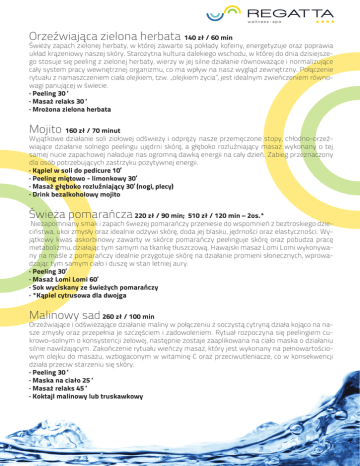 Orzeźwiająca zielona herbata 140 zł / 60 min Świeży zapach zielonej herbaty, w której zawarte są pokłady kofeiny, energetyzuje oraz poprawia układ krążeniowy naszej skóry. Starożytna kultura dalekiego wschodu, w której do dnia dzisiejszego stosuje się peeling z zielonej herbaty, wierzy w jej silne działanie równoważące i normalizujące cały system pracy wewnętrznej organizmu, co ma wpływ na nasz wygląd zewnętrzny. Połączenie rytuału z namaszczeniem ciała olejkiem, tzw. „olejkiem życia”, jest idealnym zwieńczeniem równowagi panującej w świecie. · Peeling 30 ‘ · Masaż relaks 30 ‘ · Mrożona zielona herbata Mojito 160 zł / 70 minut Wyjątkowe działanie soli ziołowej odświeży i odpręży nasze przemęczone stopy, chłodno-orzeźwiające działanie solnego peelingu ujędrni skórę, a głęboko rozluźniający masaż wykonany o tej samej nucie zapachowej naładuje nas ogromną dawką energii na cały dzień. Zabieg przeznaczony dla osób potrzebujących zastrzyku pozytywnej energii. · Kąpiel w soli do pedicure 10’ · Peeling miętowo - limonkowy 30’ · Masaż głęboko rozluźniający 30’ (nogi, plecy) · Drink bezalkoholowy mojito Świeża pomarańcza 220 zł / 90 min; 510 zł / 120 min – 2os.* Niezapomniany smak i zapach świeżej pomarańczy przeniesie do wspomnień z beztroskiego dzieciństwa, ukoi zmysły oraz idealnie odżywi skórę, doda jej blasku, jędrności oraz elastyczności. Wyjątkowy kwas askorbinowy zawarty w skórce pomarańczy peelinguje skórę oraz pobudza pracę metabolizmu, działając tym samym na tkankę tłuszczową. Hawajski masaż Lomi Lomi wykonywany na maśle z pomarańczy idealnie przygotuje skórę na działanie promieni słonecznych, wprowadzając tym samym ciało i duszę w stan letniej aury. · Peeling 30’ · Masaż Lomi Lomi 60’ · Sok wyciskany ze świeżych pomarańczy · *Kąpiel cytrusowa dla dwojga Malinowy sad 260 zł / 100 min Orzeźwiające i odświeżające działanie maliny w połączeniu z soczystą cytryną działa kojąco na nasze zmysły oraz przepełnia je szczęściem i zadowoleniem. Rytuał rozpoczyna się peelingiem cukrowo–solnym o konsystencji żelowej, następnie zostaje zaaplikowana na ciało maska o działaniu silnie nawilżającym. Zakończenie rytuału wieńczy masaż, który jest wykonany na pełnowartościowym olejku do masażu, wzbogaconym w witaminę C oraz przeciwutleniacze, co w konsekwencji działa przeciw starzeniu się skóry. · Peeling 30 ‘ · Maska na ciało 25 ‘ · Masaż relaks 45 ‘ · Koktajl malinowy lub truskawkowy