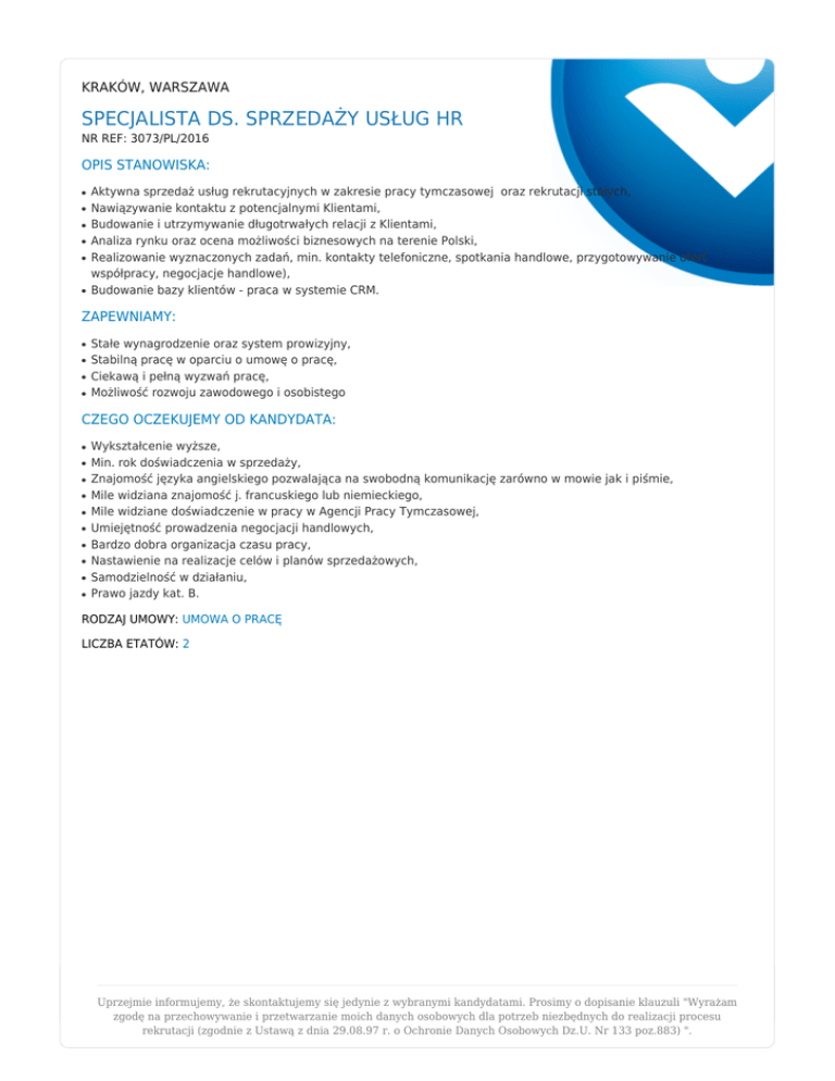 KRAKÓW, WARSZAWA SPECJALISTA DS. SPRZEDAŻY USŁUG HR NR REF: 3073/PL/2016 OPIS STANOWISKA: ● ● ● ● ● ● Aktywna sprzedaż usług rekrutacyjnych w zakresie pracy tymczasowej oraz rekrutacji stałych, Nawiązywanie kontaktu z potencjalnymi Klientami, Budowanie i utrzymywanie długotrwałych relacji z Klientami, Analiza rynku oraz ocena możliwości biznesowych na terenie Polski, Realizowanie wyznaczonych zadań, min. kontakty telefoniczne, spotkania handlowe, przygotowywanie ofert współpracy, negocjacje handlowe), Budowanie bazy klientów - praca w systemie CRM. ZAPEWNIAMY: ● ● ● ● Stałe wynagrodzenie oraz system prowizyjny, Stabilną pracę w oparciu o umowę o pracę, Ciekawą i pełną wyzwań pracę, Możliwość rozwoju zawodowego i osobistego CZEGO OCZEKUJEMY OD KANDYDATA: ● ● ● ● ● ● ● ● ● ● Wykształcenie wyższe, Min. rok doświadczenia w sprzedaży, Znajomość języka angielskiego pozwalająca na swobodną komunikację zarówno w mowie jak i piśmie, Mile widziana znajomość j. francuskiego lub niemieckiego, Mile widziane doświadczenie w pracy w Agencji Pracy Tymczasowej, Umiejętność prowadzenia negocjacji handlowych, Bardzo dobra organizacja czasu pracy, Nastawienie na realizacje celów i planów sprzedażowych, Samodzielność w działaniu, Prawo jazdy kat. B. RODZAJ UMOWY: UMOWA O PRACĘ LICZBA ETATÓW: 2 Uprzejmie informujemy, że skontaktujemy się jedynie z wybranymi kandydatami. Prosimy o dopisanie klauzuli "Wyrażam zgodę na przechowywanie i przetwarzanie moich danych osobowych dla potrzeb niezbędnych do realizacji procesu rekrutacji (zgodnie z Ustawą z dnia 29.08.97 r. o Ochronie Danych Osobowych Dz.U. Nr 133 poz.883) ".