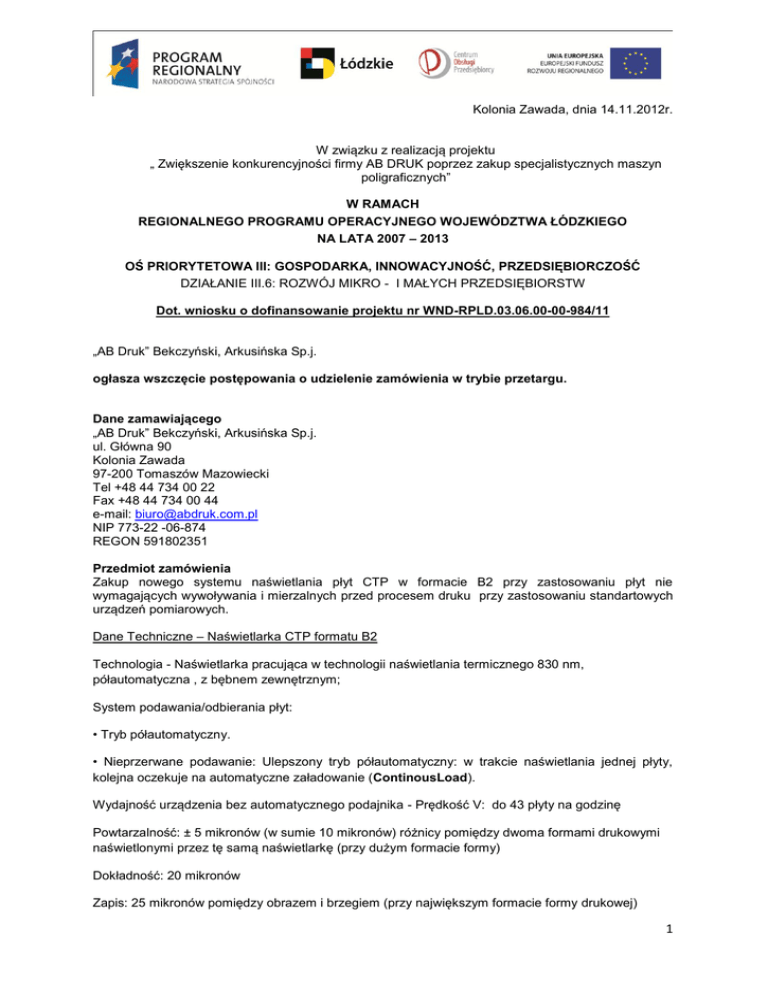 Kolonia Zawada, dnia 14.11.2012r. W związku z realizacją projektu „ Zwiększenie konkurencyjności firmy AB DRUK poprzez zakup specjalistycznych maszyn poligraficznych” W RAMACH REGIONALNEGO PROGRAMU OPERACYJNEGO WOJEWÓDZTWA ŁÓDZKIEGO NA LATA 2007 – 2013 OŚ PRIORYTETOWA III: GOSPODARKA, INNOWACYJNOŚĆ, PRZEDSIĘBIORCZOŚĆ DZIAŁANIE III.6: ROZWÓJ MIKRO - I MAŁYCH PRZEDSIĘBIORSTW Dot. wniosku o dofinansowanie projektu nr WND-RPLD.03.06.00-00-984/11 „AB Druk” Bekczyński, Arkusińska Sp.j. ogłasza wszczęcie postępowania o udzielenie zamówienia w trybie przetargu. Dane zamawiającego „AB Druk” Bekczyński, Arkusińska Sp.j. ul. Główna 90 Kolonia Zawada 97-200 Tomaszów Mazowiecki Tel +48 44 734 00 22 Fax +48 44 734 00 44 e-mail: [email protected] NIP 773-22 -06-874 REGON 591802351 Przedmiot zamówienia Zakup nowego systemu naświetlania płyt CTP w formacie B2 przy zastosowaniu płyt nie wymagających wywoływania i mierzalnych przed procesem druku przy zastosowaniu standartowych urządzeń pomiarowych. Dane Techniczne – Naświetlarka CTP formatu B2 Technologia - Naświetlarka pracująca w technologii naświetlania termicznego 830 nm, półautomatyczna , z bębnem zewnętrznym; System podawania/odbierania płyt: • Tryb półautomatyczny. • Nieprzerwane podawanie: Ulepszony tryb półautomatyczny: w trakcie naświetlania jednej płyty, kolejna oczekuje na automatyczne załadowanie (ContinousLoad). Wydajność urządzenia bez automatycznego podajnika - Prędkość V: do 43 płyty na godzinę Powtarzalność: ± 5 mikronów (w sumie 10 mikronów) różnicy pomiędzy dwoma formami drukowymi naświetlonymi przez tę samą naświetlarkę (przy dużym formacie formy) Dokładność: 20 mikronów Zapis: 25 mikronów pomiędzy obrazem i brzegiem (przy największym formacie formy drukowej) 1 System zarządzania CTP umożliwiający - sprawdzanie poprawności plików - impozycja - trapinng - proofing - CIP4 Specyfikacja naświetlania Rozdzielczość: 96 dpmm (2400 dpi) Rastrowanie: Max liniatura do 450 lp, Rastrowanie Hybrydowe o plamce rastrowej o wielkości 20 mikronów. Maksymalny format płyt wokół x wzdłuż bębna: 838mm/990mm Naświetlarka musi mieć zainstalowany wewnątrz maszyny systemu perforacji płyt Bacher o rozstawie 425 mm. ( koszt niekwalifikowany - w ofercie proszę podać jako oddzielną kwotę, która nie będzie brana pod uwagę w przetargu) Maksymalny termin realizacji 30.12.2012 Kryteria wyboru najkorzystniejszej oferty oraz sposób dokonywania oceny Lp. 1. Nazwa kryterium Cena Punktacja 0-60 pkt. 2. Okres gwarancji na diody laserowe i zdalnego serwisu 0-40 pkt. Sposób oceny Stosunek ceny netto w ofercie z najniższą ceną do ceny netto badanej oferty mnożony przez 60 Stosunek okresu gwarancji w badanej ofercie do okresu gwarancji w ofercie z najdłuższą gwarancją mnożony przez 40 Maksymalna liczba punktów możliwych do uzyskania: 100 pkt. Wybrana zostanie oferta, która uzyska największą liczbę punktów. Oferta musi być sporządzona w języku polskim i zawierać: - datę jej sporządzenia, - cenę netto i brutto przedmiotu zamówienia, - okres gwarancji - szczegółową specyfikację przedmiotu zamówienia. 2 Oferta musi być podpisana przez osoby upoważnione do reprezentowania Wykonawcy. Wykonawcy będą związani ofertą przez okres 30 dni, licząc od daty upływu terminu składania ofert. Termin składania ofert upływa dnia 28 listopada 2012 roku Oferty należy składać osobiście lub listownie na adres: „AB Druk” Bekczyński, Arkusińska Sp.j. Kolonia Zawada, ul. Główna 90, 97-200 Tomaszów Mazowiecki lub pocztą elektroniczną na adres [email protected] Oferty składane listownie lub osobiście prosimy złożyć w zamkniętej kopercie, opisanej: „Oferta na naświetlarkę CTP” w ramach projektu „ Zwiększenie konkurencyjności firmy AB DRUK poprzez zakup specjalistycznych maszyn poligraficznych” Nie otwierać przed 29.11.2012 W przypadku podania wartości przedmiotu zamówienia w walucie obcej, przeliczanie na złote dokonane zostanie według średniego kursu NBP z dnia otwarcia ofert. Zamawiający zastrzega sobie prawo do zmiany treści ogłoszenia oraz do unieważnienia postępowania. Jeżeli Wykonawca, którego oferta została wybrana zrezygnuje z realizacji zamówienia, Zamawiający może wybrać ofertę najkorzystniejszą spośród pozostałych ofert. Otwarcie ofert nastąpi w dniu 29.11.2012 w siedzibie firmy AB DRUK Kolonia Zawada, ul. Główna 90, 97-200 Tomaszów Mazowiecki Opis warunków udziału w postępowaniu O zamówienie mogą się ubiegać Wykonawcy, którzy: 1) dysponują niezbędnym potencjałem technicznym do wykonywania, 2) znajdują się w sytuacji ekonomicznej i finansowej zapewniającej wykonanie zamówienia, 3) nie podlegają wykluczeniu z postępowania o udzielenie zamówienia (art. 24 ust.1 i 2 ustawy) Pozostałe informacje Ogłoszenie o zamówieniu zostało wywieszone i jest dostępne w siedzibie Zamawiającego oraz na stronie www.abdruk.com.pl Osoba uprawniona do kontaktu z Wykonawcami i udzielania wyjaśnień dotyczących postępowania: Jarosław Bekczyński tel +48 44 734 00 22 , e-mail: [email protected] 3