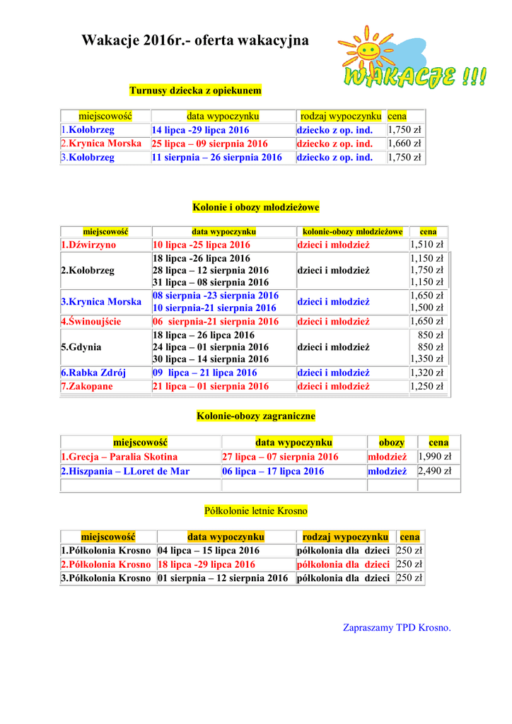 Wakacje 2016r.- oferta wakacyjna Turnusy dziecka z opiekunem miejscowość data wypoczynku 1.Kołobrzeg 14 lipca -29 lipca 2016 2.Krynica Morska 25 lipca – 09 sierpnia 2016 3.Kołobrzeg 11 sierpnia – 26 sierpnia 2016 rodzaj wypoczynku dziecko z op. ind. dziecko z op. ind. dziecko z op. ind. cena 1,750 zł 1,660 zł 1,750 zł Kolonie i obozy młodzieżowe miejscowość 1.Dźwirzyno 2.Kołobrzeg 3.Krynica Morska 4.Świnoujście 5.Gdynia 6.Rabka Zdrój 7.Zakopane data wypoczynku 10 lipca -25 lipca 2016 18 lipca -26 lipca 2016 28 lipca – 12 sierpnia 2016 31 lipca – 08 sierpnia 2016 08 sierpnia -23 sierpnia 2016 10 sierpnia-21 sierpnia 2016 06 sierpnia-21 sierpnia 2016 18 lipca – 26 lipca 2016 24 lipca – 01 sierpnia 2016 30 lipca – 14 sierpnia 2016 09 lipca – 21 lipca 2016 21 lipca – 01 sierpnia 2016 kolonie-obozy młodzieżowe cena 1,510 zł 1,150 zł 1,750 zł 1,150 zł 1,650 zł 1,500 zł 1,650 zł 850 zł 850 zł 1,350 zł 1,320 zł 1,250 zł dzieci i młodzież dzieci i młodzież dzieci i młodzież dzieci i młodzież dzieci i młodzież dzieci i młodzież dzieci i młodzież Kolonie-obozy zagraniczne miejscowość 1.Grecja – Paralia Skotina 2.Hiszpania – LLoret de Mar data wypoczynku 27 lipca – 07 sierpnia 2016 06 lipca – 17 lipca 2016 obozy młodzież młodzież cena 1,990 zł 2,490 zł Półkolonie letnie Krosno miejscowość data wypoczynku rodzaj wypoczynku 1.Półkolonia Krosno 04 lipca – 15 lipca 2016 półkolonia dla dzieci 2.Półkolonia Krosno 18 lipca -29 lipca 2016 półkolonia dla dzieci 3.Półkolonia Krosno 01 sierpnia – 12 sierpnia 2016 półkolonia dla dzieci cena 250 zł 250 zł 250 zł Zapraszamy TPD Krosno.