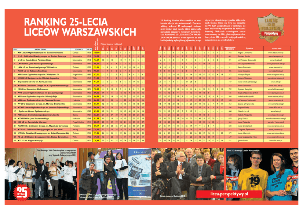 rok zał. WSKAŹNIK RANKINGOWY RANKING 25-LECIA LICEÓW WARSZAWSKICH Ochota 1906 100,00 II LO z Oddziałami Dwujęzycznymi im. Stefana Batorego Śródmieście 1918 98,29 4 5 3 V LO im. Księcia Józefa Poniatowskiego Śródmieście 1918 96,57 10 13 12 4 LXVII LO im. Jana Nowaka-Jeziorańskiego Śródmieście 1991 96,57 7 3 5 202 2001 1992 2003 1993 2004 1994 2005 1995 2006 1996 2007 1997 2008 1998 2009 1999 2010 2000 2011 3 2012 2 2013 XIV Liceum Ogólnokształcące im. Stanisława Staszica Miejsca liceum w rankingach 2014 1 DZIELNICA 2015 NAZWA SZKOŁY 2016 2016 cję w tym okresie (w przypadku kilku młodych liceów, które nie były na początku lat 90. tych uwzględniane w rankingu, lat tych nie braliśmy oczywiście do wyliczania średniej. Wskaźnik rankingowy został unormowany do 100, gdzie najlepsza szkoła uzyskała 100, a wyniki kolejnych szkół są odniesieniem do wyniku lidera. 25 Ranking Liceów Warszawskich to znakomita okazja do podsumowań. Postanowiliśmy wskazać 25 najlepszych stołecznych liceów, czyli takich, które zajmowały najwyższe pozycje w minionym ćwierćwieczu. RANKING 25-LECIA LICEÓW WARSZAWSKICH powstał w ten sposób, że dla każdej szkoły wyliczyliśmy jej średnią pozy- liczba uczniów 2015/2016 1 1 1 1 1 2 1 2 1 1 1 1 1 6 3 1 2 7 3 2 2 1 5 1 2 542 Regina Lewkowicz www.staszic.waw.pl 2 5 4 2 3 4 10 5 4 3 4 6 2 3 2 1 4 5 5 1 3 2 601 Barbara Kordas www.batory.edu.pl 11 10 9 7 6 5 4 6 7 2 3 4 4 4 1 2 3 3 2 2 3 1 491 dr Mirosław Sosnowski www.vlo.edu.pl 4 7 3 3 1 3 2 2 3 5 2 1 5 1 4 16 6 16 19 – – – 232 dr Krzysztof Mirowski www.jezioranski.edu.pl Dyrektor strona www 5 LXIV LO im. Stanisława Ignacego Witkiewicza Żoliborz 1990 95,96 5 8 6 5 2 11 10 14 6 5 4 14 4 1 2 3 5 9 4 1 1 11 – – – 311 Beata Zdanowicz www.liceum64.pl 6 XXVII LO im. Tadeusza Czackiego Śródmieście 1876 95,51 6 4 8 6 3 7 5 7 8 7 3 8 11 5 7 6 8 5 9 5 4 7 6 10 5 485 Anna Koszycka www.czacki.edu.pl 7 VIII Liceum Ogólnokształcące im. Władysława IV Praga-Północ 1885 92,00 3 2 7 3 8 1 4 4 7 6 7 2 6 10 15 27 16 14 23 15 17 15 12 4 18 377 Grażyna Filipiak www.wladyslaw.edu.pl 8 XXXIII LO Dwujęzyczne im. Mikołaja Kopernika Wola 1949 91,84 9 7 4 8 4 5 6 5 2 11 16 22 12 11 22 8 7 10 13 13 11 10 11 13 – 603 Justyna Matejczyk www.kopernik.edu.pl 9 2 Społeczne LO STO im. Pawła Jasienicy Śródmieście 1989 91,57 2 6 2 7 6 6 15 17 10 3 20 11 7 9 5 13 20 28 8 – – – – – – 147 Anna Sobala-Zbroszczyk 10 XVII LO z Oddziałami Dwujęz. im. A. Frycza Modrzewskiego Śródmieście 1960 91,39 15 15 17 15 13 12 13 11 12 7 8 13 8 13 8 10 6 3 7 7 7 12 8 – – 553 Piotr Golinowski 11 IX LO im. Klementyny Hoffmanowej Śródmieście 1874 90,29 8 9 10 9 9 8 8 8 9 12 9 12 13 19 12 18 10 11 6 8 30 21 9 5 15 709 Ryszard Raczyński www.hoffmanowa.pl 12 XVIII Liceum Ogólnokształcące im. Jana Zamoyskiego Śródmieście 1905 89,66 14 16 11 12 12 13 9 10 11 10 11 16 10 8 9 14 14 13 14 19 15 6 – – – 645 Edyta Ołdakowska-Dębek www.zamoyski.edu.pl 13 XI Liceum Ogólnokształcące im. Mikołaja Reja Śródmieście 1906 86,94 23 21 18 19 23 23 11 12 15 15 12 23 17 22 18 9 12 6 10 16 9 18 6 8 4 584 Arkadiusz Krużyński www.web.rej.edu.pl 14 VI Liceum Ogólnokształcące im. Tadeusza Reytana Mokotów 1905 86,53 13 11 20 16 11 22 16 21 14 16 19 5 15 12 14 12 15 17 17 30 23 9 10 5 17 548 dr Seweryn Szatkowski www.reytan.edu.pl 15 XV LO z Oddziałami Dwujęz. im. Narcyzy Żmichowskiej Śródmieście 1919 86,49 12 18 15 13 14 10 31 13 18 19 15 19 18 28 13 16 13 25 20 11 10 3 7 9 11 363 Joanna Chrapkowska www.zmichowska.pl 16 XXXVII Liceum Ogólnokształcące im. Jarosława Dąbrowskiego Śródmieście 1949 86,04 24 19 16 22 24 17 17 25 26 17 14 9 25 21 23 11 17 18 15 12 6 4 3 3 4 596 Bogdan Madej 17 I Społeczne Liceum Ogólnokształcące Śródmieście 1989 85,02 19 20 21 17 20 19 40 19 16 14 31 21 10 7 10 7 9 12 5 – – – – – – 468 Wanda Łuczak 18 XLI Liceum Ogólnokształcące Joachima Lelewela Bielany 1951 83,21 21 26 27 20 19 18 20 23 21 20 17 15 21 16 20 24 18 8 12 19 15 6 – – – 550 Izabela Muszyńska 19 XXVIII LO im. Jana Kochanowskiego Mokotów 1948 81,99 11 12 13 23 16 15 12 22 13 18 10 30 23 15 19 20 34 20 25 46 8 27 20 – – 678 Jerzy Kunicki 20 XIX LO im. Powstańców Warszawy Praga-Południe 1944 80,17 28 25 29 29 28 21 18 29 17 27 18 18 20 20 28 17 11 16 11 10 37 16 20 – – 563 Anna Piekarska www.lo19.waw.ids.pl 21 XXXIV LO z Oddziałami Dwujęz. im. Miguela de Cervantesa Mokotów 1946 80,17 29 28 28 25 27 33 32 33 34 29 24 25 14 14 11 15 25 19 19 9 5 8 7 – – 602 Anita Omelańczuk www.cervantes.edu.pl 22 XXII LO z Oddziałami Dwujęzycznymi im. Jose Marti Bielany 1945 79,85 20 22 26 24 18 25 26 24 19 20 30 27 19 17 17 19 19 29 22 27 12 32 12 16 – 615 Zbigniew Ślęzakowski 23 XVI LO z Oddziałami Dwujęzycznymi im. Stefanii Sempołowskiej Żoliborz 1935 79,84 26 24 25 21 29 26 14 16 22 22 22 6 27 24 25 21 32 22 26 25 19 25 13 12 20 379 Anna Adamczyk www.sempolowska.eu 24 XL LO z Oddziałami Dwujęzycznymi im. Stefana Żeromskiego Wola 1952 79,10 16 17 22 18 15 14 19 18 24 19 13 20 37 18 34 37 31 35 33 18 12 28 19 – – 639 Anna Szczepańska-Filipp www.zeromski.waw.pl 25 XXI LO im. Hugona Kołłątaja Ochota 1920 76,98 27 31 31 27 33 28 23 28 20 28 21 29 26 29 21 23 21 24 27 32 22 14 17 16 16 531 Janina Stocka Finał Rankingu 2000. Tak cieszyli się ze zwycięstwa uczniowie LXVII LO przy Wydziale Pedagogicznym UW. 25 EDYCJA Finał XIX Rankingu Liceów Warszawskich Młodzież LXVII LO im. Nowaka-Jeziorańskiego cieszy się z I-go miejsca w Rankingu 2009 Goście honorowi Rankingu 2010 licea.perspektywy.pl www.2slo.pl www.frycz.edu.pl www.37lo.edu.pl www.bdnr.pl www.lelewel.waw.pl www.kochanowski.waw.pl www.josemarti.pl www.2lo.waw.pl