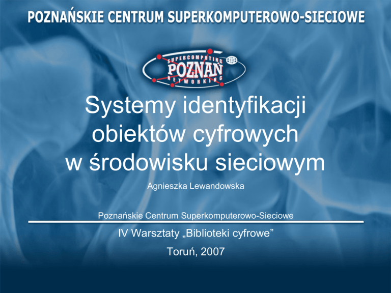 Systemy identyfikacji obiektów cyfrowych w środowisku sieciowym Agnieszka Lewandowska Poznańskie Centrum Superkomputerowo-Sieciowe IV Warsztaty „Biblioteki cyfrowe” Toruń, 2007 URL • • • • ang. Unified Resource Locator Tradycyjne podejście Określa położenie w sieci Problem: “broken links” – przenoszenie zawartości do innej lokalizacji • Skutek: – nietrwałe identyfikatory obiektów – prace nad alternatywnymi systemami identyfikacji obiektów Istniejące systemy • • • • • • • URNs – Uniform Resource Names (URNs) NBNs – National Bibliography Numbers Handles DOIs – Digital Object Identifiers OAI Identifier ARK – Archival Resource Key PURLs – Persistent Unifrom Resource Locators URN • ang. Uniform Resource Names • Przestrzenie nazw dla różnych rodzajów identyfikatorów (np.: dla ISBN, ISSN) • Przestrzenie nazw są standaryzowane • Identyfikatory są: unikalne, trwałe, skalowalne • Każda istniejąca przestrzeń nazw musi posiadać system rozwiązywania identyfikatorów (mechanizmy mogą być różne) URN – składnia urn:<NID>:<NSS> • NID – identyfikator przestrzeni nazw • NSS – specyficzny dla przestrzeni identyfikator zasobu (łańcuch znaków) • Przykład: urn:isbn:3-938616-59-8 NBN • ang. National Bibliographic Number • Identyfikator przestrzeni nazw URN • Wyłącznie dla bibliotek narodowych (rozwiązywanie identyfikatorów w ich zakresie) • Identyfikatory zasobów elektronicznych, jak i papierowych • Dostosowuje istniejące systemy identyfikatorów NBN – składnia urn:NBN:<ICC>[:SNS]-NBNstring • ICC - dwuliterowy kod kraju wg ISO 3166 • SNS – podprzestrzeń nazw • NBNstring – identyfikator w podanej przestrzeni nazw • Przykład: urn:NBN:de:kobv:23-2312 Handles • Identyfikator Handle System • Handle System – zbiór protokołów, przestrzeń nazw oraz istniejące oprogramowanie • Kodowanie UTF-8 – wszelkie istniejące znaki • Autoryzacja wybranych operacji • Rozproszony system usług • Centralna usługa do rozwiązywania identyfikatorów – Global Handle System Handles - składnia <HNA>/<HNL> • HNA - sufiks nadawany przez Global Handle Service – liczba dziesiętna nadawana sekwencyjnie – hierarchiczna składnia • HNL - lokalny identyfikator – może skłdadać się z własnych przestrzeni nazw • Przykład: 145.34/jan2005-rk32315453 DOI • Korzysta z Handle System do nadawania oraz rozwiązywania identyfikatorów • HNA = 10 • indecs Data Dictionary (iDD) - ontologia wspierająca semantyczną analizę oraz interoperacyjność metadanych • Możliwość grupowania i kategoryzowania usług • Wymaga wysokich opłat OAI Identifier • URN • Trwały identyfikator dla repozytoriów implementujących OAI-PMH • Identyfikator wskazuje zasób będący metadanymi o obiekcie! • Brak serwisu rejestrującego przestrzenie nazw – wykorzystanie nazw domenowych • Brak opłat OAI Identifier - składnia <SCH>:<NI>:<LI> • SCH – schemat, zawsze “oai” • NI – identyfikator przestrzeni nazw, nazwa domenowa • LI – lokalny identyfikator w przestrzeni nazw • Przykład: oai:www.wbc.poznan.pl:8711 ARK • ang. Archival Resource Key • Trwałość zapewniana przez usługodawcę, a nie składnię nazwy • Wskazuje metadane o obiekcie • Nie gwarantuje trwałości identyfikatora • Zezwala na integrację innych schematów, jak i zintegrowanie jego w inne schematy ARK - składnia [http://<NMAH>/]ark:/<NAAN>/<Name> • NMAH – usługa rozwiązująca identyfikator (część nietrwała) • NAAN – nadawca części <Name> • Name – nazwa przydzielona do zasobu, zezwala na określenie wariantów • Przykład: http://zaf.org/ark:/13030/654xz321/s3/f8.05v.tiff PURL • ang. Persistent Unified Resource Locator • Uzyskanie trwałego odnośnika do zasobu (trwałego URLa) • Zamiast wskazywać na zasób, wskazuje na usługę przekierowującą do zasobu • Korzysta ze standardowych usług i protokołów • Zezwala na dostęp do historii położenia w sieci danego zasobu PURL - składnia <Protocol><RA><Name> • Protocol – standardowy protokół, np: http • RA – adres usługi przekierowującej do wybranego zasobu • Name – nazwa wskazująca na określony zasób • Przykład: http://purl.oclc.org/net/digi/digizeit.ppn Podsumowanie • • • • Rezygnacja z określenia położenia w sieci (URL) Trwałość Koncepcja przestrzeni nazw Usługi nadające (lub akceptujące) przestrzenie nazw • Usługi nadające identyfikatory w danej przestrzeni • Rozwiązywanie identyfikatorów przez określone usługi Na podstawie raportu ECPA “Implementing Persistent Identifiers: overview of concepts, guidelines and recommendations” Hansa-Wernera Hilse i Jochena Kothe Pytania? Dziękuję za uwagę!