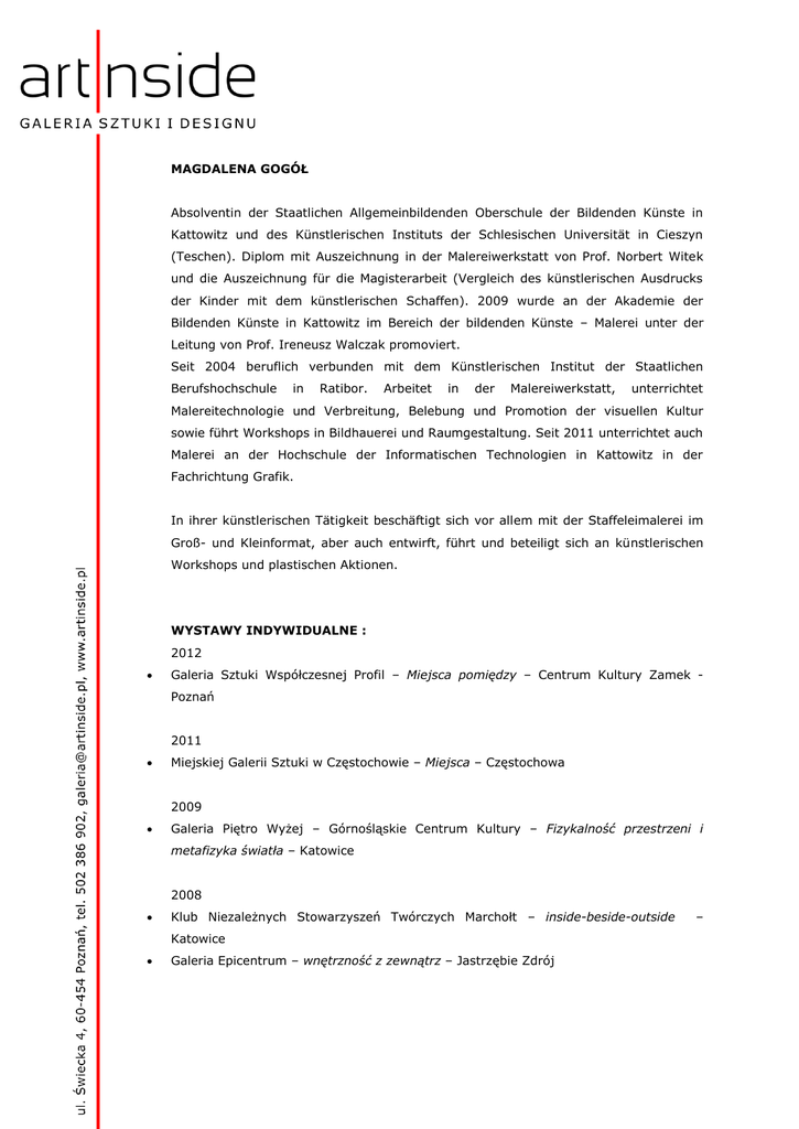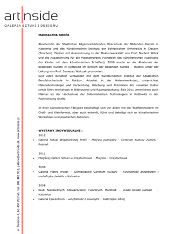 MAGDALENA GOGÓŁ Absolventin der Staatlichen Allgemeinbildenden Oberschule der Bildenden Künste in Kattowitz und des Künstlerischen Instituts der Schlesischen Universität in Cieszyn (Teschen). Diplom mit Auszeichnung in der Malereiwerkstatt von Prof. Norbert Witek und die Auszeichnung für die Magisterarbeit (Vergleich des künstlerischen Ausdrucks der Kinder mit dem künstlerischen Schaffen). 2009 wurde an der Akademie der Bildenden Künste in Kattowitz im Bereich der bildenden Künste – Malerei unter der Leitung von Prof. Ireneusz Walczak promoviert. Seit 2004 beruflich verbunden mit dem Künstlerischen Institut der Staatlichen Berufshochschule in Ratibor. Arbeitet in der Malereiwerkstatt, unterrichtet Malereitechnologie und Verbreitung, Belebung und Promotion der visuellen Kultur sowie führt Workshops in Bildhauerei und Raumgestaltung. Seit 2011 unterrichtet auch Malerei an der Hochschule der Informatischen Technologien in Kattowitz in der Fachrichtung Grafik. In ihrer künstlerischen Tätigkeit beschäftigt sich vor allem mit der Staffeleimalerei im Groß- und Kleinformat, aber auch entwirft, führt und beteiligt sich an künstlerischen Workshops und plastischen Aktionen. WYSTAWY INDYWIDUALNE : 2012 Galeria Sztuki Współczesnej Profil – Miejsca pomiędzy – Centrum Kultury Zamek Poznań 2011 Miejskiej Galerii Sztuki w Częstochowie – Miejsca – Częstochowa 2009 Galeria Piętro Wyżej – Górnośląskie Centrum Kultury – Fizykalność przestrzeni i metafizyka światła – Katowice 2008 Klub Niezależnych Stowarzyszeń Twórczych Marchołt – inside-beside-outside Katowice Galeria Epicentrum – wnętrzność z zewnątrz – Jastrzębie Zdrój – 2007 Galeria 3 2 0 (z Prof. Kazimierzem Cieślikiem)- Festiwal Nauki i Sztuki – wnętrzność– Bielsko Biała Galeria Fundacji Elektrowni Rybnik - wnętrzność - Rybnik Galeria Forma – malarstwo – wystawa z okazji XV Finału WOŚP – Kuźnia Raciborska 2006 Galeria Klubu Akademickiego – malarstwo – Uniwersytet Opolski – Opole Galeria MDK – z perspektywy przyziemnej” – Mikołów 2005 Galeria Na Sali – malarstwo – DK Olza Galeria sztuki – malarstwo – Rybnickie Centrum Kultury– Rybnik Galeria Panorama – malarstwo - GCK – Jastrzębie Zdrój Galeria Sikornik – ego-kolor – Gliwice Mĕstská Galerie – malarstwo – Odry – Czechy 2004 Galeria Plamy- perspektywa egocentryczna – Rybnik 2001 Galeria TPZR – designed by … MAGDA GOGÓŁ” – Racibórz Galeria Epicentrum – TO JA – Jastrzębie Zdrój Galeria Stalowe Anioły – Sielsko- anielskie – Bytom 1999 Galeria MOK – pamiętam, wiem, przypuszczam… – instalacja i malarstwo – Powiatowa Inauguracja Roku Kulturalnego – Kuźnia Raciborska 1998 Galeria Antresola– malarstwo – Tarnowskie Góry Galeria Plenerowa Sorrento – malarstwo– Zabrze 1997 Galeria Przewiązka – malarstwo - Instytut Sztuki – Cieszyn Galeria Rotunda – malarstwo– Bytom WAŻNIEJSZE PROJEKTY I WYSTAWY ZBIOROWE : 2012 7 Międzynarodowe Biennale Miniatury – Częstochowa 2012 Wystawa miniatury malarskiej studentów IS PWSZ z pracowni Magdaleny GogółPeszke – małe obrazy o większym znaczeniu – Galeria RCI – Racibórz wystawa artystów-pedagogów I S PWSZ w Raciborzu oraz studentów i absolwentów kierunku: edukacja artystyczna w zakresie sztuk plastycznych - PRZEGLĄDARKA 1/1 Powiatowe Muzeum Ziemi Głubczyckiej Wystawa studentów i wykładowców Instytutu Sztuki PWSZ Racibórz – … w czasie - Galeria RCK – Racibórz 2011 VI Międzynarodowe Biennale Malarstwa i Tkaniny – Barwy i Faktury – Gdynia 2011 III Międzynarodowym Biennale Obrazu "QUADRO-ART" 2011 – Łódź 2011 CZAS-TIME-ZEIT – Wystawa międzynarodowa - Zamek Piastowski – Racibórz zdarzenia-zderzenia – cykl wystaw zbiorowych pedagogów IS PWSZ w Raciborzu – Zabrze, Racibórz, Wodzisław Jesienne Konfrontacje II Triennale Polskiego Malarstwa Współczesnego Rzeszów 2010 Galeria Umelcov Spisa w Novej Spisskiej Vsi - Słowacja 2010 II Międzynarodowy Konkurs Malarski - Przestrzeń Publiczna - Konteksty – Poznań 2010 Jesienne Konfrontacje II Triennale Polskiego Malarstwa Współczesnego Rzeszów 2010 VII Triennale Sztuki SACRUM – Dom -droga istnienia – Miejska Galeria Sztuki – Częstochowa II Międzynarodowe Biennale Obrazu Quadro-Art , Łódź 2009 8 Triennale Małych Form Malarskich –Galeria Sztuki Wozownia – Toruń 2010 Sen na jawie – Muzeum Miejskie w Siemianowicach XI Festiwal Sztuki Wysokiej –… od …do i pomiędzy – Bytom 2010 2009 I Międzynarodowy Konkurs Malarski - Obraz przestrzeni Publicznej – Poznań 2009 II Rybnik Art. Festiwal – Rybnik 2009 Z jawy – Galeria Marchołt - Katowice Wystawa twórczości artystów - pedagogów Instytutu Sztuki PWSZ w Raciborzu – Galeria Student – Ostrawa - Czechy Postawy 2009 - BWA Leszno Z bliska - Galeria Znad Wiliji – Wilno – Litwa X Festiwal Sztuki Wysokiej – Ciepłem skojarzeni – Bytom 2009 Plener Malarski Polsko-Czeski – Tworków 2009 2008 Festiwal Polskiego Malarstwa Współczesnego– Zamek Książąt Pomorskich – Szczecin 2008 Rybnik Art Festiwal 2008 I Międzynarodowe Biennale Obrazu – Quadro-art. - Łódź, 2007 IV Ogólnopolskie Biennale Malarstwa i Tkaniny Unikatowej - Trójmiasto '2007 Jesienne Konfrontacje Triennale Polskiego Malarstwa Współczesnego Rzeszów 2007 – najlepsze obrazy - Galeria Umelcov Spisa w Novej Spisskiej Vsi - Słowacja ze snu – Galeria Na II P – Gliwice 2007 udział w IV Wodzisławskim Przeglądzie Kina Uffowego – w kat. animacja, eksperyment - reż. animacja Podryw - Prezentacje Filmu Artystycznego Video-Art. Projekt Experimentart – Rybnik 2007 Jesienne Konfrontacje Triennale Polskiego Malarstwa Współczesnego - Rzeszów 2007 7 Triennale Małej Formy Malarskiej –Galeria Sztuki Wozownia - Toruń 2007- Wystawa -15 lat Ogólnopolskiego Konkursu Sztuki im. Vincenta Van Gogha – Muzeum Śląskie – Katowice Wystawa Absolwentó