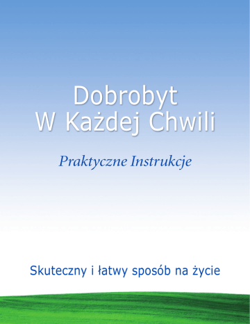 Dobrobyt W Każdej Chwili Praktyczne Instrukcje Skuteczny i łatwy sposób na życie Dobrobyt w Każdej Chwili Praktyczne Instrukcje Skuteczny i łatwy sposób na życie Dobrobyt w Każdej Chwili z mediów Balanced View jest licencjonowane pod Creative Commons Attributions – Użycie niekomercyjne – Bez utworów zależnych 3.0 United States License. Oparte na pracy przez www.greatfreedom.org/wellbeingbook.html. Dla Korzyści Wszystkich PRZEJRZYSTOŚĆ ŚWIADOMOŚCI ____________________________________________ Przejrzystość świadomości objawia ogromny skarb korzyści dla ludzkiego istnienia. Dostarcza największego z bogactw. Bogactwo to jest zawarte we frazie: „Krótkie chwile klarowności, powtarzane wiele razy, stają się ciągłe”. Takie proste swierdzenie rzeczywiście ma moc przyniesienia serdecznej, odwartej jasności, współpracy i pokoju dla kultury ludzkiej na skalę globalną. Czym jest ten krótki moment klarowności? Aby to rozpoznać, przestań myśleć – tylko przez chwilę. Co pozostaje? Poczucie raźności, obecności i przejrzystości. To właśnie świadomość: przejrzystość i czujność jak bezchmurne niebo. Ta klarowność, która jest obecna kiedy nie myślimy, jest też obecna kiedy myślimy. Wszystkie myśli pojawiają się i znikają naturalnie, tak jak droga lotu ptaka na niebie. W momencie kiedy punkty widzenia (myśli, emocje, uczucia, nastroje czy inne doświadczenia) się formują – rozpoznaj przestrzenną świadomość, która świeci przez każdy punkt widzenia. W tej właśnie chwili spójrz na siebie, na swoje doświadczenie i zobacz czy tak jest, czy też nie. Punkt widzenia to wszystko co zachodzi we wszechogarniającym widzeniu świadomości. To może być myśl, uczucie, emocja, czy inne doświadczenie i może odwoływać się do zdarzenia wewnętrznego lub zewnętrznego. Punkty widzenia można porównać do wiatru wiejącego przez powietrze. Wiatru i powietrza nie można odzielić. Oba są powietrzem. To tak jak kolor niebieski jest nieodłączny od nieba, podobnie punkty widzenia są nieodłączne od świadomości. Zaczynamy realizować, że punkty widzenia nie mają odrębnej natury od świadomości. Nie ma znaczenia jekiego rodzaju punkty widzenia powstają. Same się rozwiązują w świadomości, nie zostawiając śladu. To tak jakby pociągnąć ręką w powietrzu. Odprężona i pełna mocy 4 świadomość jest źródłem mentalnej i uczuciowej równowagi, wglądu w naturę stworzenia, zaradnych cech oraz sprawnego działania. Poprzez moc instynktownego rozpoznania świadomości, więcej i więcej postrzegamy wszystko jako pełne i oczywiste. Po prostu, niech umysł i ciało odpoczywają naturalnie, bez odpychania czy szukania czegokolwiek. To wszystko czego potrzeba. Czy sytuacja jest naprężona, intensywna, spokojna czy pośrednia – rozluźnij się. Co pozostaje to przejrzystość, raźność i otwartość, tak jak przejrzyste niebo. To właśnie świadomość! Kiedy następne myśli, uczucia czy emocje biorą miejsce, objawiają się one z powodu i poprzez klarowność i raźność świadomości. Jest to podobne do niezmiernego nieba, które jest zawsze obecne, niezależnie co się w nim i na nim pojawia. Bezwzględnie, czy jest uwaga i postrzeganie obecności myśli czy jej też nie ma – oba stany nie mają istnienia bez świadomości. Jasność świadomości w bezpośrednim biegu myśli, uczuć, emocji jest źródłem niesamowitej intuicji, doskonałej klarowności, całkowitej mentalnej i emocjonalnej równowagi oraz współczucia i zaradności we wszystkich sytuacjach. Wrodzona zdolność bycia rozluźnionym, zrównoważonym, mądrym, współczującym jest naturalnie rozpoznana w świadomości. Ze względu na nasz nawyk podkreślania punktów widzenia, te pierwsze chwile przejrzystości nie będą może trwałe. Innymi słowy, początkowo może nie być prawdziwej stabilności. To zupełnie w porządku. Dlatego polegamy na krótkich chwilach, wiele razy, aż przejrzystość jest ciągła. To jest kluczowe w nabywaniu pewności w klarowność. Klarowność może być dla nas oczywista i to od nas zależy. Klarowność z chwili na chwilę jest dla nas najważniejszym wyborem. Już za pierwszym razem, przez 5 wybór polegania na świadomości, zamiast podkreślania punktów widzenia, mamy poczucie wielkiej siły i pełnej ulgi. Poprzez powracanie do tego prostego wyboru, widzimy korzyść już od samego początku. Nurt punktów widzenia nie jest zmieniony. Wszystko jest po prostu zostawione takie jakim jest. Poprzez moc świadomości i jej rozpoznawanie, jest ona bardziej i bardziej oczywista. Pierwsza chwila świadomości zawiera już rezultat całkowitej ulgi, mentalnej i uczuciowej równowagi, klarowności, intuicji, współczucia i korzyści dla siebie i innych. Przez poleganie na świadomości raz za razem, staje się ona automatyczna. Krótkie chwile, wiele razy, stają się ciągłe. Owa szczególnie efektywna metoda, daje nam zasięg do pełnej inteligencji i przejrzystości, która jest niepostrzegalna, gdy podkreślamy opisy czy punkty widzenia. A więc trzymaj się krótkich chwil przejrzystości, pozostawiając wszystko tak jak jest, kiedykolwiek o tym pamiętasz, aż przejrzystość będzie zawsze ciągła. 6 UWIERDZENIE W KLAROWNOŚCI _____________________________________________ Klarowność jest już naturalnie obecna. To nie jest tak, że my jej nie posiadamy i mamy nadzieję jej uzyskania gdzieś w przyszłości. My już jesteśmy świadomi, klarowni. Chwilowo potwierdzaj klarowność, raz za razem i stanie się ona zawsze oczywista. Możemy radować się kryształowo czystą klarownością, ponieważ jest już ona zawsze obecna. Nie musimy jej szukać i dlatego możemy zawsze na niej polegać. Radować się przejrzystością przez krótkie chwile to tak jakby zakończyć ciężki dzień pracy, czy też odprężenie po gorącej kąpieli. Jesteśmy całkowicie rozluźnieni bez niczego już do zrobien