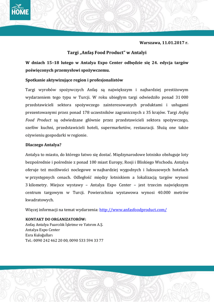 Warszawa, 11.01.2017 r. Targi „Anfaş Food Product” w Antalyi W dniach 15–18 lutego w Antalya Expo Center odbędzie się 24. edycja targów poświęconych przemysłowi spożywczemu. Spotkanie aktywizujące region i profesjonalistów Targi wyrobów spożywczych Anfaş są największym i najbardziej prestiżowym wydarzeniem tego typu w Turcji. W roku ubiegłym targi odwiedziło ponad 31 000 przedstawicieli sektora spożywczego zainteresowanych produktami i usługami prezentowanymi przez ponad 178 uczestników zagranicznych z 35 krajów. Targi Anfaş Food Product są odwiedzane głównie przez przedstawicieli sektora spożywczego, szefów kuchni, przedstawicieli hoteli, supermarketów, restauracji. Służą one także ożywieniu gospodarki w regionie. Dlaczego Antalya? Antalya to miasto, do którego łatwo się dostać. Międzynarodowe lotnisko obsługuje loty bezpośrednie i pośrednie z ponad 100 miast Europy, Rosji i Bliskiego Wschodu. Antalya oferuje też możliwości noclegowe w najbardziej wygodnych i luksusowych hotelach w przystępnych cenach. Odległość między lotniskiem a lokalizacją targów wynosi 3 kilometry. Miejsce wystawy – Antalya Expo Center – jest trzecim największym centrum targowym w Turcji. Powierzchnia wystawowa wynosi 40.000 metrów kwadratowych. Więcej informacji na temat wydarzenia: http://www.anfasfoodproduct.com/ KONTAKT DO ORGANIZATORÓW: Anfaş Antalya Fuarcılık İşletme ve Yatırım A.Ş. Antalya Expo Center Esra Kuloğulları Tel.: 0090 242 462 20 00, 0090 533 594 33 77 KONTAKT DLA MEDIÓW: Żaneta Hiszpańska [email protected] 22 544 05 12