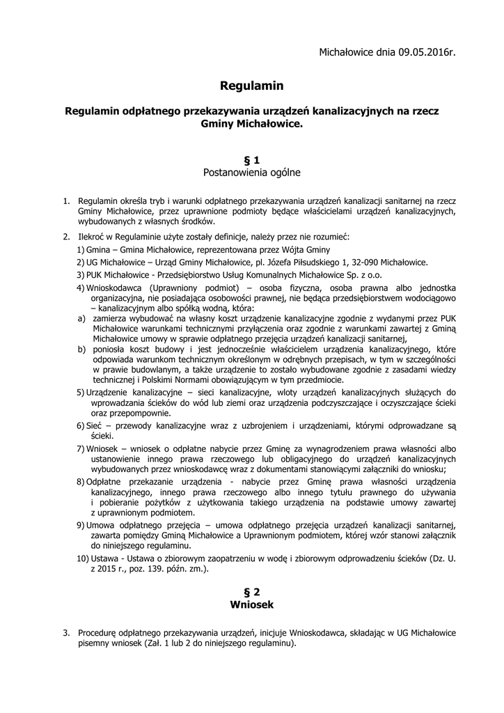 Michałowice dnia 09.05.2016r. Regulamin Regulamin odpłatnego przekazywania urządzeń kanalizacyjnych na rzecz Gminy Michałowice. §1 Postanowienia ogólne 1. Regulamin określa tryb i warunki odpłatnego przekazywania urządzeń kanalizacji sanitarnej na rzecz Gminy Michałowice, przez uprawnione podmioty będące właścicielami urządzeń kanalizacyjnych, wybudowanych z własnych środków. 2. Ilekroć w Regulaminie użyte zostały definicje, należy przez nie rozumieć: 1) Gmina – Gmina Michałowice, reprezentowana przez Wójta Gminy 2) UG Michałowice – Urząd Gminy Michałowice, pl. Józefa Piłsudskiego 1, 32-090 Michałowice. 3) PUK Michałowice - Przedsiębiorstwo Usług Komunalnych Michałowice Sp. z o.o. 4) Wnioskodawca (Uprawniony podmiot) – osoba fizyczna, osoba prawna albo jednostka organizacyjna, nie posiadająca osobowości prawnej, nie będąca przedsiębiorstwem wodociągowo – kanalizacyjnym albo spółką wodną, która: a) zamierza wybudować na własny koszt urządzenie kanalizacyjne zgodnie z wydanymi przez PUK Michałowice warunkami technicznymi przyłączenia oraz zgodnie z warunkami zawartej z Gminą Michałowice umowy w sprawie odpłatnego przejęcia urządzeń kanalizacji sanitarnej, b) poniosła koszt budowy i jest jednocześnie właścicielem urządzenia kanalizacyjnego, które odpowiada warunkom technicznym określonym w odrębnych przepisach, w tym w szczególności w prawie budowlanym, a także urządzenie to zostało wybudowane zgodnie z zasadami wiedzy technicznej i Polskimi Normami obowiązującym w tym przedmiocie. 5) Urządzenie kanalizacyjne – sieci kanalizacyjne, wloty urządzeń kanalizacyjnych służących do wprowadzania ścieków do wód lub ziemi oraz urządzenia podczyszczające i oczyszczające ścieki oraz przepompownie. 6) Sieć – przewody kanalizacyjne wraz z uzbrojeniem i urządzeniami, którymi odprowadzane są ścieki. 7) Wniosek – wniosek o odpłatne nabycie przez Gminę za wynagrodzeniem prawa własności albo ustanowienie innego prawa rzeczowego lub obligacyjnego do urządzeń kanalizacyjnych wybudowanych przez wnioskodawcę wraz z dokumentami stanowiącymi załączniki do wniosku; 8) Odpłatne przekazanie urządzenia - nabycie przez Gminę prawa własności urządzenia kanalizacyjnego, innego prawa rzeczowego albo innego tytułu prawnego do używania i pobieranie pożytków z użytkowania takiego urządzenia na podstawie umowy zawartej z uprawnionym podmiotem. 9) Umowa odpłatnego przejęcia – umowa odpłatnego przejęcia urządzeń kanalizacji sanitarnej, zawarta pomiędzy Gminą Michałowice a Uprawnionym podmiotem, której wzór stanowi załącznik do niniejszego regulaminu. 10) Ustawa - Ustawa o zbiorowym zaopatrzeniu w wodę i zbiorowym odprowadzeniu ścieków (Dz. U. z 2015 r., poz. 139. późn. zm.). §2 Wniosek 3. Procedurę odpłatnego przekazywania urządzeń, inicjuje Wnioskodawca, składając w UG Michałowice pisemny wniosek (Zał. 1 lub 2 do niniejszego regulaminu). 4. Jeżeli urządzenie stanowi współwłasność kilku podmiotów, składają one jeden wniosek, do którego załączają pełnomocnictwo wskazujące osobę, która będzie je reprezentować w postępowaniu i zawrze w ich imieniu umowę odpłatnego przejęcia. 5. Do wniosku należy załączyć wszystkie wymagane dokumenty określone we wzorze wniosku o zawarcie umowy odpłatnego przejęcia sieci kanalizacyjnych. W przypadku braków lub niejasności, Gmina terminie 14 dni od złożenia wniosku, wezwie Wnioskodawcę do uzupełnienia dokumentacji. W szczególnych przypadkach Gmina może wymagać innych dokumentów niż wymienione we wniosku. W przypadku braku uzupełnienia wniosku w wymaganym terminie wniosek pozostawia się bez rozpoznania. 6. Wszelkie koszty związane z pozyskaniem dokumentów, oświadczeń jak również ewentualnej dokumentacji uzupełniającej, ponosi Wnioskodawca. 7. Rozpatrzenie wniosku nastąpi w ciągu 30 dni od dostarczenia wszystkich wymaganych dokumentów. Wnioski będą rozpatrywane według kolejności ich wpływu. W przypadku wniosków, które wymagały uzupełnienia, za datę wpływu uznaje się datę dostarczenia brakujących dokumentów. 8. W przypadku przejmowania istniejących urządzeń, w ramach rozpatrzenia wniosku, wykonana zostanie ocena techniczna, która ma na celu sprawdzenie czy urządzenie zostało wykonane zgodnie z warunkami technicznymi/umową o przyłączenie, dokumentacją projektową, decyzją o pozwoleniu na budowę, zasadami sztuki budowlanej oraz oddane do użytkowania zgodnie z prawem. Oceniony zostanie również stan techniczny urządzenia. W ocenie technicznej biorą udział przedstawiciele PUK Michałowice. 9. W trakcie rozpatrywania wniosku, na podstawie złożonych dokumentów oraz w przypadku przejmowania urządzeń istniejących – oceny technicznej, sporządzona zostanie wycena wartości przejmowanych urządzeń. Wycena, wraz z projektem umowy zostanie wysłana do Wnioskodawcy. §3 Obliczenia wysokość wynagrodzenia z tytułu odpłatnego przekazania urządzenia 1. Wysokość wynagrodzenia z tytułu odpłatnego przekazania urządzeń kanalizacyjnych na rzecz Gminy Michałowice, określana jest na podstawie uproszczonego kosztorysu, współczynnika możliwości rozbudowy sieci oraz w przypadku sieci wybudowanych przed podpisaniem umowy i starszych niż 1 rok, z uwzględnieniem amortyzacji środków trwałych oraz wartości koniecznych prac remontowych związanych z przywróceniem pełnej sprawności sieci a określonych w ocenie technicznej wymienionej w § 2 ust. 8 niniejszego regulaminu. 2. Uproszczony kosztorys, sporządzany jest z użyciem średnich cen ustalonych na podstawie 3 inwestycji realizowanych ostatnio przez Gminę Michałowice (zał. Nr 6). 3. Współczynnik możliwości rozbudowy sieci wynosi od 0,7 dla kanałów bez możliwością rozbudowy (obsługa tylko jednej działki), 0,9 dla kanałów zbiorczych z możliwością rozbudowy do 0,5 km i 1,0 dla kanałów zbi