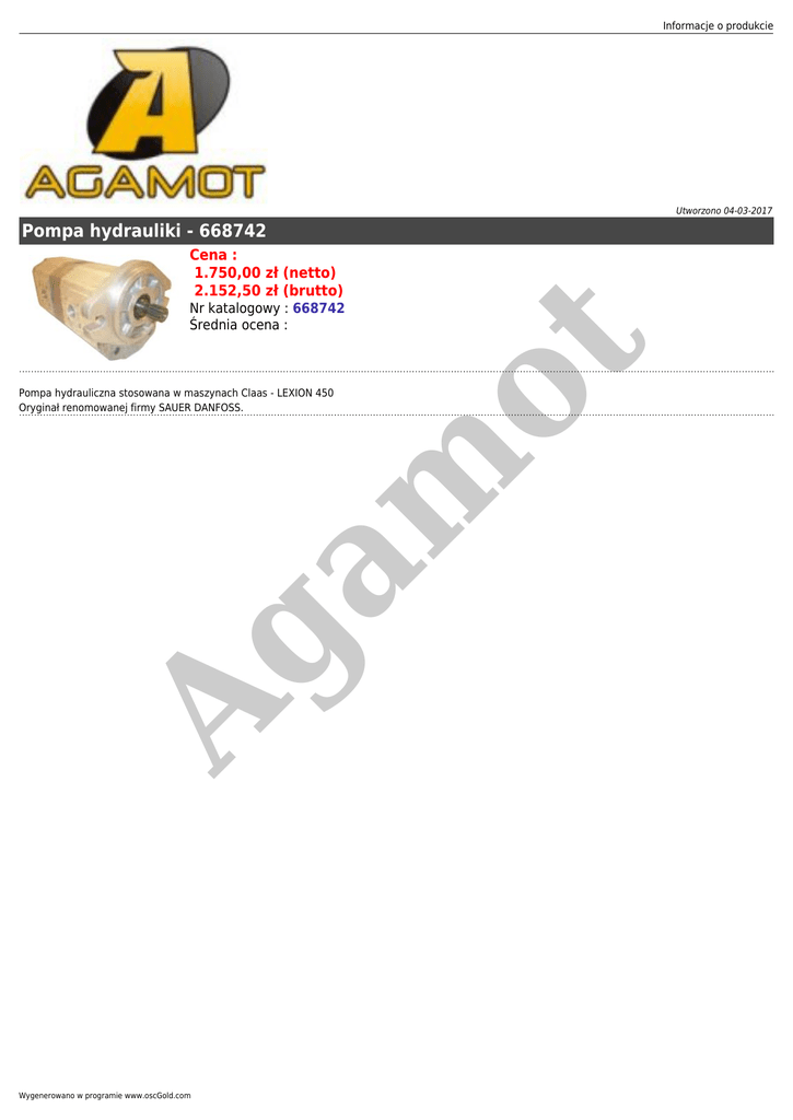 Informacje o produkcie Utworzono 04-03-2017 Pompa hydrauliki - 668742 Cena : 1.750,00 zł (netto) 2.152,50 zł (brutto) Ag am Pompa hydrauliczna stosowana w maszynach Claas - LEXION 450 Oryginał renomowanej firmy SAUER DANFOSS. ot Nr katalogowy : 668742 Średnia ocena : Wygenerowano w programie www.oscGold.com