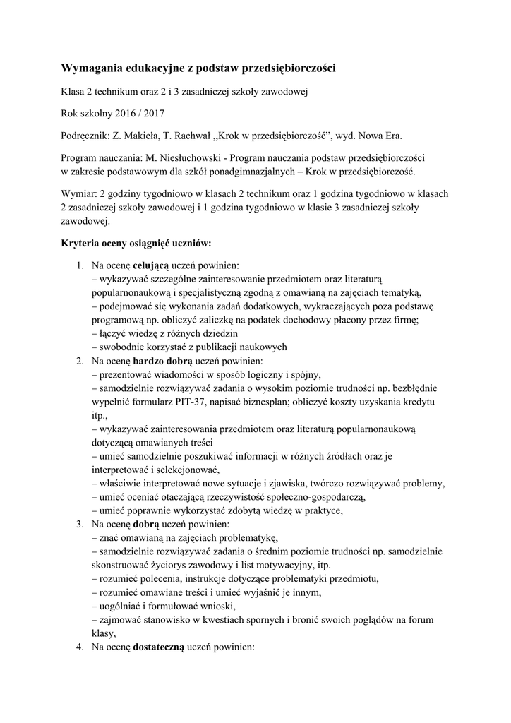 WYMAGANIA EDUKACYJNE Z PODSTAW PRZEDSIĘBIORCZOŚCI