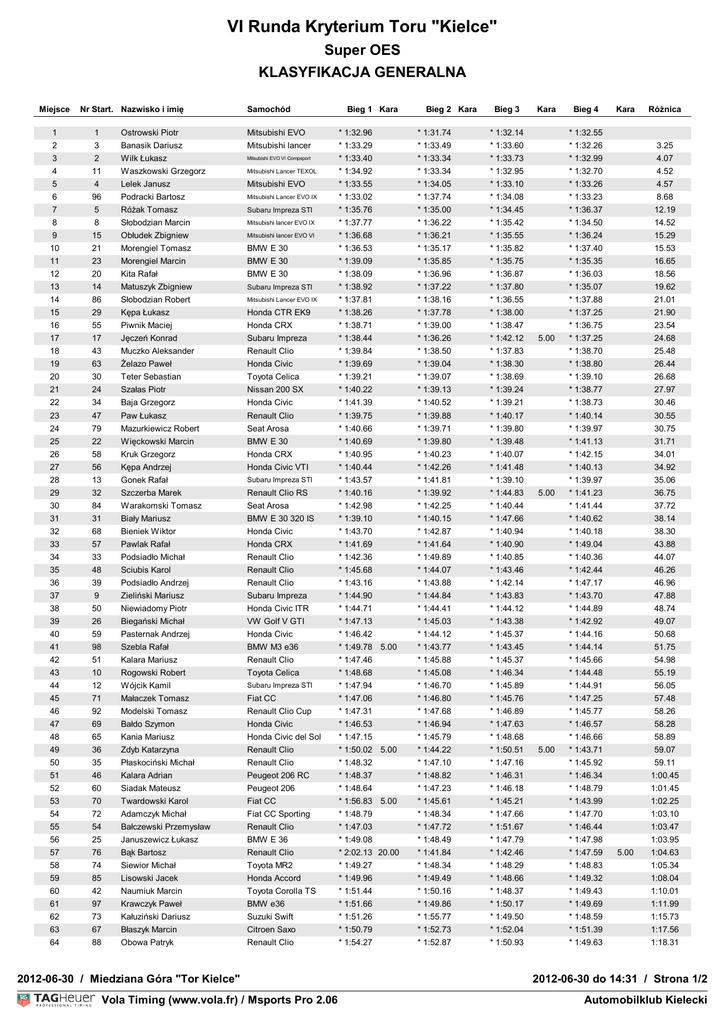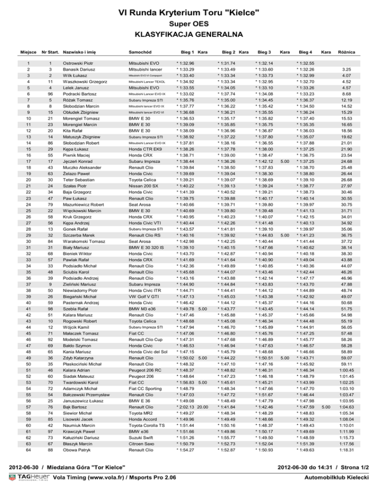 VI Runda Kryterium Toru "Kielce" Super OES KLASYFIKACJA GENERALNA Miejsce Nr Start. Nazwisko i imię Samochód Bieg 1 Kara Bieg 2 Kara Bieg 3 Kara Bieg 4 Kara Różnica 1 1 Ostrowski Piotr Mitsubishi EVO * 1:32.96 * 1:31.74 * 1:32.14 * 1:32.55 2 3 Banasik Dariusz Mitsubishi lancer * 1:33.29 * 1:33.49 * 1:33.60 * 1:32.26 3.25 3 2 Wilk Łukasz Mitsubishi EVO VI Compsport * 1:33.40 * 1:33.34 * 1:33.73 * 1:32.99 4.07 4 11 Waszkowski Grzegorz Mitsubishi Lancer TEXOL * 1:34.92 * 1:33.34 * 1:32.95 * 1:32.70 4.52 5 4 Lelek Janusz Mitsubishi EVO * 1:33.55 * 1:34.05 * 1:33.10 * 1:33.26 4.57 6 96 Podracki Bartosz Mitsubishi Lancer EVO IX * 1:33.02 * 1:37.74 * 1:34.08 * 1:33.23 8.68 7 5 Różak Tomasz Subaru Impreza STI * 1:35.76 * 1:35.00 * 1:34.45 * 1:36.37 12.19 8 8 Słobodzian Marcin Mitsubishi lancer EVO IX * 1:37.77 * 1:36.22 * 1:35.42 * 1:34.50 14.52 9 15 Obłudek Zbigniew Mitsubishi lancer EVO VI * 1:36.68 * 1:36.21 * 1:35.55 * 1:36.24 15.29 10 21 Morengiel Tomasz BMW E 30 * 1:36.53 * 1:35.17 * 1:35.82 * 1:37.40 15.53 11 23 Morengiel Marcin BMW E 30 * 1:39.09 * 1:35.85 * 1:35.75 * 1:35.35 16.65 12 20 Kita Rafał BMW E 30 * 1:38.09 * 1:36.96 * 1:36.87 * 1:36.03 18.56 13 14 Matuszyk Zbigniew Subaru Impreza STI * 1:38.92 * 1:37.22 * 1:37.80 * 1:35.07 19.62 14 86 Słobodzian Robert Mitsubishi Lancer EVO IX * 1:37.81 * 1:38.16 * 1:36.55 * 1:37.88 21.01 15 29 Kępa Łukasz Honda CTR EK9 * 1:38.26 * 1:37.78 * 1:38.00 * 1:37.25 21.90 16 55 Piwnik Maciej Honda CRX * 1:38.71 * 1:39.00 * 1:38.47 * 1:36.75 23.54 17 17 Jęczeń Konrad Subaru Impreza * 1:38.44 * 1:36.26 * 1:42.12 * 1:37.25 24.68 18 43 Muczko Aleksander Renault Clio * 1:39.84 * 1:38.50 * 1:37.83 * 1:38.70 25.48 19 63 Żelazo Paweł Honda Civic * 1:39.69 * 1:39.04 * 1:38.30 * 1:38.80 26.44 20 30 Teter Sebastian Toyota Celica * 1:39.21 * 1:39.07 * 1:38.69 * 1:39.10 26.68 21 24 Szałas Piotr Nissan 200 SX * 1:40.22 * 1:39.13 * 1:39.24 * 1:38.77 27.97 22 34 Baja Grzegorz Honda Civic * 1:41.39 * 1:40.52 * 1:39.21 * 1:38.73 30.46 23 47 Paw Łukasz Renault Clio * 1:39.75 * 1:39.88 * 1:40.17 * 1:40.14 30.55 24 79 Mazurkiewicz Robert Seat Arosa * 1:40.66 * 1:39.71 * 1:39.80 * 1:39.97 30.75 25 22 Więckowski Marcin BMW E 30 * 1:40.69 * 1:39.80 * 1:39.48 * 1:41.13 31.71 26 58 Kruk Grzegorz Honda CRX * 1:40.95 * 1:40.23 * 1:40.07 * 1:42.15 34.01 27 56 Kępa Andrzej Honda Civic VTI * 1:40.44 * 1:42.26 * 1:41.48 * 1:40.13 34.92 28 13 Gonek Rafał Subaru Impreza STI * 1:43.57 * 1:41.81 * 1:39.10 * 1:39.97 35.06 29 32 Szczerba Marek Renault Clio RS * 1:40.16 * 1:39.92 * 1:44.83 * 1:41.23 36.75 30 84 Warakomski Tomasz Seat Arosa * 1:42.98 * 1:42.25 * 1:40.44 * 1:41.44 37.72 31 31 Biały Mariusz BMW E 30 320 IS * 1:39.10 * 1:40.15 * 1:47.66 * 1:40.62 38.14 32 68 Bieniek Wiktor Honda Civic * 1:43.70 * 1:42.87 * 1:40.94 * 1:40.18 38.30 33 57 Pawlak Rafał Honda CRX * 1:41.69 * 1:41.64 * 1:40.90 * 1:49.04 43.88 34 33 Podsiadło Michał Renault Clio * 1:42.36 * 1:49.89 * 1:40.85 * 1:40.36 44.07 35 48 Sciubis Karol Renault Clio * 1:45.68 * 1:44.07 * 1:43.46 * 1:42.44 46.26 36 39 Podsiadło Andrzej Renault Clio * 1:43.16 * 1:43.88 * 1:42.14 * 1:47.17 46.96 37 9 Zieliński Mariusz Subaru Impreza * 1:44.90 * 1:44.84 * 1:43.83 * 1:43.70 47.88 38 50 Niewiadomy Piotr Honda Civic ITR * 1:44.71 * 1:44.41 * 1:44.12 * 1:44.89 48.74 39 26 Biegański Michał VW Golf V GTI * 1:47.13 * 1:45.03 * 1:43.38 * 1:42.92 49.07 40 59 Pasternak Andrzej Honda Civic * 1:46.42 * 1:44.12 * 1:45.37 * 1:44.16 50.68 41 98 Szebla Rafał BMW M3 e36 * 1:49.78 5.00 * 1:43.77 * 1:43.45 * 1:44.14 51.75 42 51 Kalara Mariusz Renault Clio * 1:47.46 * 1:45.88 * 1:45.37 * 1:45.66 54.98 43 10 Rogowski Robert Toyota Celica * 1:48.68 * 1:45.08 * 1:46.34 * 1:44.48 55.19 44 12 Wójcik Kamil Subaru Impreza STI * 1:47.94 * 1:46.70 * 1:45.89 * 1:44.91 56.05 45 71 Małaczek Tomasz Fiat CC * 1:47.06 * 1:46.80 * 1:45.76 * 1:47.25 57.48 46 92 Modelski Tomasz Renault Clio Cup * 1:47.31 * 1:47.68 * 1:46.89 * 1:45.77 58.26 47 69 Bałdo Szymon Honda Civic * 1:46.53 * 1:46.94 * 1:47.63 * 1:46.57 58.28 48 65 Kania Mariusz Honda Civic del Sol * 1:47.15 * 1:45.79 * 1:48.68 * 1:46.66 58.89 49 36 Zdyb Katarzyna Renault Clio * 1:50.02 5.00 * 1:44.22 * 1:50.51 * 1:43.71 59.07 50 35 Płaskociński Michał Renault Clio * 1:48.32 * 1:47.10 * 1:47.16 * 1:45.92 59.11 51 46 Kalara Adrian Peugeot 206 RC * 1:48.37 * 1:48.82 * 1:46.31 * 1:46.34 1:00.45 52 60 Siadak Mateusz Peugeot 206 * 1:48.64 * 1:47.23 * 1:46.18 * 1:48.79 1:01.45 53 70 Twardowski Karol Fiat CC * 1:56.83 5.00 * 1:45.61 * 1:45.21 * 1:43.99 1:02.25 54 72 Adamczyk Michał Fiat CC Sporting * 1:48.79 * 1:48.34 * 1:47.66 * 1:47.70 1:03.10 55 54 Bałczewski Przemysław Renault Clio * 1:47.03 * 1:47.72 * 1:51.67 * 1:46.44 1:03.47 56 25 Januszewicz Łukasz BMW E 36 * 1:49.08 * 1:48.49 * 1:47.79 * 1:47.98 57 76 Bąk Bartosz Renault Clio * 2:02.13 20.00 * 1:41.84 * 1:42.46 * 1:47.59 58 74 Siewior Michał Toyota MR2 * 1:49.27 * 1:48.34 * 1:48.29 * 1:48.83 1:05.34 59 85 Lisowski Jacek Honda Accord * 1:49.96 * 1:49.49 * 1:48.66 * 1:49.32 1:08.04 60 42 Naumiuk Marcin Toyota Corolla TS * 1:51.44 * 1:50.16 * 1:48.37 * 1:49.43 1:10.01 61 97 Krawczyk Paweł BMW e36 * 1:51.66 * 1:49.86 * 1:50.17 * 1:49.69 1:11.99 62 73 Kałuziński Dariusz Suzuki Swift * 1:51.26 * 1:55.77 * 1:49.50 * 1:48.59 1:15.73 63 67 Błaszyk Marcin Citroen Saxo * 1:50.79 * 1:52.73 * 1:52.04 * 1:51.39 1:17.56 64 88 Obowa Patryk Renault Clio * 1:54.27 * 1:52.87 * 1:50.93 * 1:49.63 1:18.31 2012-06-30 / Miedziana Góra "Tor Kielce" Vola Timing (www.vola.fr) / Msports Pro 2.06 5.00 5.00 5.00 1:03.95 5.00 1:04.63 2012-06-30 do 14:31 / Strona 1/2 VolaSoftControlPdf Automobilklub Kielecki VI Runda Kryterium Toru "Kielce" Super OES KLASYFIKACJA GENERALNA Miejsce Nr Start. Nazwisko i imię Samochód Bieg 1 Kara Bieg 2 Kara Bieg 3 Kara Bieg 4 Kara Różnica 65 64 Jachymczak Mateusz Polonez Caro * 1:52.33 * 1:52.11 * 1:51.81 * 1:51.53 1:18.39 66 49 Matachowski Filip Fiat Bravo 2.0 HGT * 1:53.35 * 1:52.55 * 1:50.14 * 1:52.19 1: