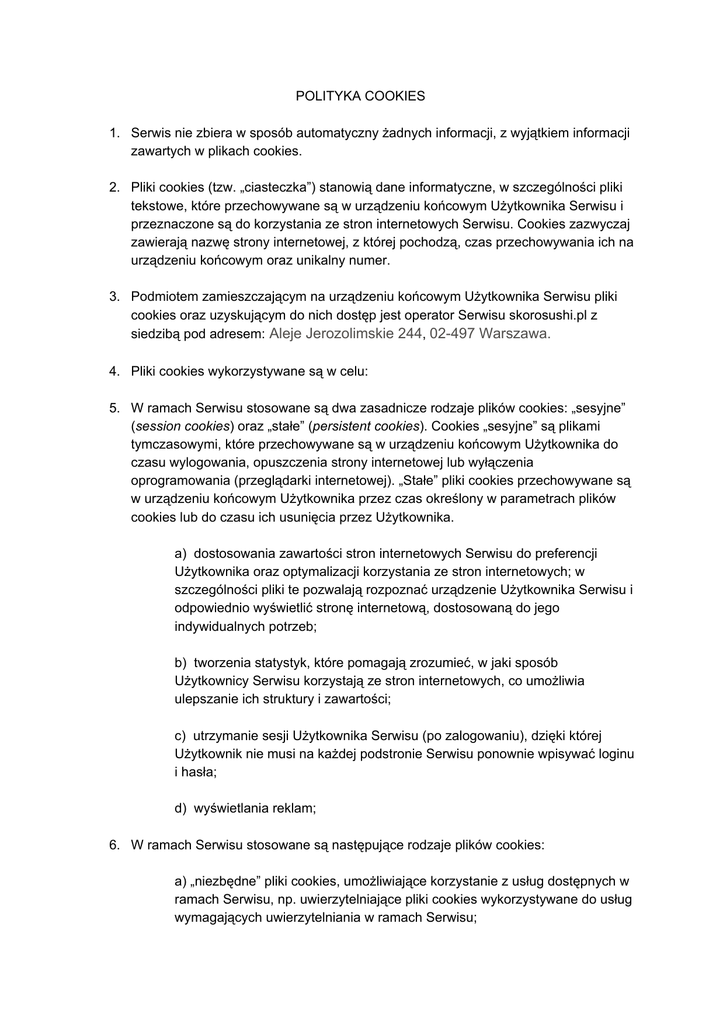 POLITYKA COOKIES 1. Serwis nie zbiera w sposób automatyczny żadnych informacji, z wyjątkiem informacji zawartych w plikach cookies. 2. Pliki cookies (tzw. „ciasteczka”) stanowią dane informatyczne, w szczególności pliki tekstowe, które przechowywane są w urządzeniu końcowym Użytkownika Serwisu i przeznaczone są do korzystania ze stron internetowych Serwisu. Cookies zazwyczaj zawierają nazwę strony internetowej, z której pochodzą, czas przechowywania ich na urządzeniu końcowym oraz unikalny numer. 3. Podmiotem zamieszczającym na urządzeniu końcowym Użytkownika Serwisu pliki cookies oraz uzyskującym do nich dostęp jest operator Serwisu skorosushi.pl z siedzibą pod adresem: Aleje Jerozolimskie 244 , 02497 Warszawa. 4. Pliki cookies wykorzystywane są w celu: 5. W ramach Serwisu stosowane są dwa zasadnicze rodzaje plików cookies: „sesyjne” ( session cookies ) oraz „stałe” ( persistent cookies) . Cookies „sesyjne” są plikami tymczasowymi, które przechowywane są w urządzeniu końcowym Użytkownika do czasu wylogowania, opuszczenia strony internetowej lub wyłączenia oprogramowania (przeglądarki internetowej). „Stałe” pliki cookies przechowywane są w urządzeniu końcowym Użytkownika przez czas określony w parametrach plików cookies lub do czasu ich usunięcia przez Użytkownika. a) dostosowania zawartości stron internetowych Serwisu do preferencji Użytkownika oraz optymalizacji korzystania ze stron internetowych; w szczególności pliki te pozwalają rozpoznać urządzenie Użytkownika Serwisu i odpowiednio wyświetlić stronę internetową, dostosowaną do jego indywidualnych potrzeb; b) tworzenia statystyk, które pomagają zrozumieć, w jaki sposób Użytkownicy Serwisu korzystają ze stron internetowych, co umożliwia ulepszanie ich struktury i zawartości; c) utrzymanie sesji Użytkownika Serwisu (po zalogowaniu), dzięki której Użytkownik nie musi na każdej podstronie Serwisu ponownie wpisywać loginu i hasła; d) wyświetlania reklam; 6. W ramach Serwisu stosowane są następujące rodzaje plików cookies: a) „niezbędne” pliki cookies, umożliwiające korzystanie z usług dostępnych w ramach Serwisu, np. uwierzytelniające pliki cookies wykorzystywane do usług wymagających uwierzytelniania w ramach Serwisu; b) pliki cookies służące do zapewnienia bezpieczeństwa, np. wykorzystywane do wykrywania nadużyć w zakresie uwierzytelniania w ramach Serwisu; c) „wydajnościowe” pliki cookies, umożliwiające zbieranie informacji o sposobie korzystania ze stron internetowych Serwisu; d) „funkcjonalne” pliki cookies, umożliwiające „zapamiętanie” wybranych przez Użytkownika ustawień i personalizację interfejsu Użytkownika, np. w zakresie wybranego języka lub regionu, z którego pochodzi Użytkownik, rozmiaru czcionki, wyglądu strony internetowej itp.; e) „reklamowe” pliki cookies, umożliwiające dostarczanie Użytkownikom treści reklamowych bardziej dostosowanych do ich zainteresowań. 7. W wielu przypadkach oprogramowanie służące do przeglądania stron internetowych (przeglądarka internetowa) domyślnie dopuszcza przechowywanie plików cookies w urządzeniu końcowym Użytkownika. Użytkownicy Serwisu mogą dokonać w każdym czasie zmiany ustawień dotyczących plików cookies. Ustawienia te mogą zostać zmienione w szczególności w taki sposób, aby blokować automatyczną obsługę plików cookies w ustawieniach przeglądarki internetowej bądź informować o ich każdorazowym zamieszczeniu w urządzeniu Użytkownika Serwisu. Szczegółowe informacje o możliwości i sposobach obsługi plików cookies dostępne są w ustawieniach oprogramowania (przeglądarki internetowej). 8. Operator Serwisu informuje, że ograniczenia stosowania plików cookies mogą wpłynąć na niektóre funkcjonalności dostępne na stronach internetowych Serwisu. 9. Pliki cookies zamieszczane w urządzeniu końcowym Użytkownika Serwisu i wykorzystywane mogą być również przez współpracujących z operatorem Serwisu reklamodawców oraz partnerów.