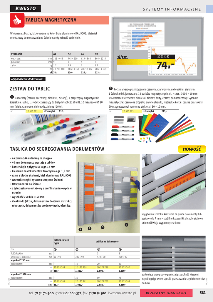 SYSTEMY INFORMACYJNE TABLICA MAGNETYCZNA Wykonana z blachy, lakierowana na kolor biały aluminiowy RAL 9006. Materiał montażowy do mocowania na ścianie należy zakupić oddzielnie. wykonanie wys. × szer. głębokość ciężar mm mm kg nr zł A3 A2 A1 A0 322 × 445 9 1.7 2D 213 360 74,- 445 × 619 9 2.8 2D 213 361 110,- 619 × 866 9 5 2D 213 362 125,- 866 × 1214 9 9.5 2D 213 363 223,- zł/szt. 2D 213 360 74,- Wyposażenie dodatkowe: ➋ Po 1 markerze planistycznym czarnym, czerwonym, niebieskim i zielonym, ZESTAW DO TABLIC ➊ 4 markery (czarny, czerwony, niebieski, zielony), 1 przyczepny magnetycznie ścierak na sucho, 1 środek czyszczący do białych tablic (250 ml), 10 magnesów Ø 20 mm (białe, czerwone, niebieskie, zielone i żółte). nr 2D 510 621 zł/komplet 132,- 1 ścierak mini, jasnoszary, 12 pasków magnetycznych, dł. × szer.: 1000 × 10 mm w 6 kolorach: czerwony, niebieski, zielony, żółty, czarny, pomarańczowy. Symbole magnetyczne: czerwone trójkąty, zielone strzałki, niebieskie kółka i czarne prostokąty. 20 magnetycznych ramek na etykietki, 50 × 10 mm. nr 2D 510 625 zł/komplet 243,- nowość TABLICA DO SEGREGOWANIA DOKUMENTÓW •na format A4 układany na stojąco •40 mm dokumentu wystaje z tablicy •konstrukcja z płyty MDF o gr. 12 mm •kieszenie na dokumenty z tworzywa o gr. 1,5 mm •rama z blachy stalowej, biel aluminiowa RAL 9006 •wszystkie części systemu skręcane śrubami •łatwy montaż na ścianie •z tyłu zestaw montażowy z profili aluminiowych w osłonie •wysokość 750 lub 1350 mm •idealny do faktur, dokumentów dostawy, instrukcji roboczych, dokumentów produkcyjnych, ofert itp. ➊ tablica ewidencyjna PP_19263 ilość słupków szerokość × głębokość wysokość 750 mm ilość kieszeni wysokość 1350 mm ilość kieszeni tablica na dokumenty ➁ ➂ ➃ szt. mm 90 × 90 1 240 × 90 2 470 × 90 3 700 × 90 szt. nr 2D 175 764 zł 268,- 10 2D 175 758 1.280,- 20 2D 175 759 1.900,- 30 2D 175 760 2.890,- szt. nr 2D 175 765 szt. 462,- 25 2D 175 761 1.940,- 50 2D 175 762 2.980,- 75 2D 175 763 4.360,- tel.: 71 78 76 900, gsm: 606 106 372, fax: 71 78 76 910, [email protected] zasłonięte przegrody ograniczają szerokość kieszeni, zapobiegając w ten sposób przesuwaniu się dokumentów na boki BEZPŁATNY TRANSPORT PP_19263 ➀ typ ➍ ➌ ➋ wyjątkowo szerokie kieszenie na grube dokumenty lub zestawy do 7 mm – stabilne kątowniki z blachy stalowej uniemożliwiają wypadnięcie z boku 581