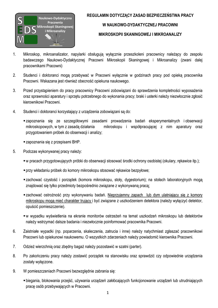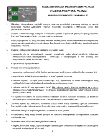 REGULAMIN DOTYCZĄCY ZASAD BEZPIECZEŃSTWA PRACY W NAUKOWO-DYDAKTYCZNEJ PRACOWNI MIKROSKOPII SKANINGOWEJ I MIKROANALIZY 1. Mikroskop, mikroanalizator, napylarki obsługują wyłącznie przeszkoleni pracownicy naleŜący do zespołu badawczego Naukowo-Dydaktycznej Pracowni Mikroskopii Skaningowej i Mikroanalizy (zwani dalej pracownikami Pracowni) 2. Studenci i doktoranci mogą przebywać w Pracowni wyłącznie w godzinach pracy pod opieką pracownika Pracowni. Wskazana jest równieŜ obecność opiekuna naukowego. 3. Przed przystąpieniem do pracy pracownicy Pracowni zobowiązani do sprawdzenia kompletności wyposaŜenia oraz sprawności aparatury i sprzętu potrzebnego do wykonania pracy; braki i usterki naleŜy niezwłocznie zgłosić kierownikowi Pracowni. 4. Studenci i doktoranci korzystający z urządzenia zobowiązani są do: zapoznania się ze szczegółowymi zasadami prowadzenia badań eksperymentalnych i obserwacji mikroskopowych, w tym z zasadą działania mikroskopu i współpracującej z nim aparatury oraz przygotowaniem próbek do obserwacji i analizy; zapoznania się z przepisami BHP. 5. Podczas wykonywanej pracy naleŜy: w pracach przygotowujących próbki do obserwacji stosować środki ochrony osobistej (okulary, rękawice itp.); przy wkładaniu próbek do komory mikroskopu stosować rękawice bezpyłowe; zachować czystość i porządek (komora mikroskopu, stoły, dygestorium); na stołach laboratoryjnych mogą znajdować się tylko przedmioty bezpośrednio związane z wykonywaną pracą; zachować ostroŜność przy wykonywaniu badań. Nieprzyjemny zapach lub dym ulatniający się z komory mikroskopu mogą mieć charakter trujący i być związane z uszkodzeniem detektora (naleŜy wyłączyć detektor, opuścić pomieszczenie). w wypadku wyświetlenia na ekranie monitorów ostrzeŜeń na temat uszkodzeń mikroskopu lub detektorów naleŜy wstrzymać dalsze badania i niezwłocznie poinformować pracownika Pracowni. 6. Zaistniałe wypadki (np. poparzenia, skaleczenia, zatrucia i inne) naleŜy natychmiast zgłaszać pracownikowi Pracowni lub opiekunowi naukowemu. O wszystkich zdarzeniach naleŜy powiadomić kierownika Pracowni. 7. OdzieŜ wierzchnią oraz zbędny bagaŜ naleŜy pozostawić w szatni (parter). 8. Po zakończeniu pracy naleŜy zostawić porządek na stanowisku oraz sprawdzić czy odpowiednie urządzenia zostały wyłączone. 9. W pomieszczeniach Pracowni bezwzględnie zabrania się: biegania, blokowania przejść, uŜywania urządzeń zakłócających funkcjonowanie urządzeń lub utrudniających pracę osób przebywających w Pracowni. 1 przebywania pod wpływem alkoholu lub środków odurzających palenia tytoniu Ze względu na bezpieczeństwo własne i innych osób przebywających w Pracowni konieczne jest stosowanie się do powyŜszego regulaminu! Studenci i inne osoby korzystające z Pracowni zobowiązane są równieŜ do przestrzegania ogólnych zasad prawnych (w tym dotyczących np. ochrony praw autorskich). I. 1. Instrukcja BHP dla osób korzystających z Pracowni ZagroŜenia: poraŜenie prądem elektrycznym (gniazda elektryczne oraz urządzenia elektryczne); naraŜenie na działanie promieniowania RTG; skaŜenie, zatrucie odczynnikami chemicznymi; skaleczenie szkłem laboratoryjnym i ostrymi narzędziami (np. specjalistyczne noŜe, Ŝyletki, skalpele itp.); wysoka temperatura (napylarka). zatrucie związkami berylu w wypadku zniszczenia detektora 2. NaleŜy stosować się do regulaminu Pracowni i zasad bezpieczeństwa pracy. 3. Apteczka pierwszej pomocy znajduje się w oznaczonym miejscu w Pracowni (pokój L203). 4. Gaśnica proszkowa oraz hydrant znajdują się na korytarzu 5. UŜywanie odczynników szkodliwych dla zdrowia dozwolone jest tylko przy uŜyciu wszystkich zalecanych środków ochrony osobistej. 6. W pokoju znajdują się rękawiczki ochronne. 7. Karty charakterystyk substancji szkodliwych znajdują się na terenie Pracowni. 8. O wszelkich awariach i nieprawidłowościach w działaniu sprzętu i aparatury naleŜy niezwłocznie powiadomić pracownika Pracowni. 9. Telefony alarmowe: Pogotowie Ratunkowe: 999 lub tel. komórkowy 112 StraŜ PoŜarna: 998 lub tel. komórkowy 112 Ośrodek Zatruć Toksykologicznych: 061 847-69-46 Kierownik N-DPMSiM Jacek Michniewicz aktualizacja 20.05.2009r. 2