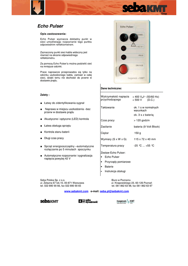 Echo Pulser Opis zastosowania: Echo Pulser wyznacza dokładny punkt w sieci umo liwiaj c rozpoznanie tego punktu odpowiednim reflektometrem. Zaznaczony punkt sieci kabla widoczny jest równie na ekranie odpowiedniego reflektometru. Za pomoc Echo Pulser’a mo na podzieli sie na mniejsze odcinki. Prace naprawcze przeprowadza si tylko na odcinku uszkodzonego kabla, zamiast w całej sieci, dzi ki temu nie dochodzi do przerw w dostawie pr du. Dane techniczne: Zalety : Wytrzymało napi cia przychodz cego Łatwy do zidentyfikowania sygnał Naprawa w miejscu uszkodzenia –bez przerw w dostawie pr du Akustyczne i optyczne (LED) kontrola Taktowanie < 400 Veff~ (50/60 Hz) < 500 V (D.C.) ok. 1 s w normalnych warunkach ok. 3 s z bateri Czas pracy > 120 godzin Łatwa obsługa sprz tu Zasilanie bateria (9 Volt Block) Kontrola stanu baterii Ci 150 g Długi czas pracy Wymiary (S x W x G) 115 x 72 x 40 mm Sprz t energooszcz dny –automatyczne rozł czanie po 5 minutach spoczynku Temperatura pracy -25 °C ... +55 °C Automatyczne rozpoznanie i sygnalizacja napi cia powy ej 42 V Seba Polska Sp. z o.o. ul. elazna 67 lok.10, 00-871 Warszawa tel. 022 890 90 66, fax 022 890 90 65 ar Zestaw Echo Pulser: • Echo Pulser • Przyrz dy pomiarowe • Baterie • Instrukcja obsługi • Biuro w Poznaniu ul. Knapowskiego 23, 60-126 Pozna tel. 061 862 63 98, fax 061 862 63 97 www.sebakmt.com e-mail: [email protected]