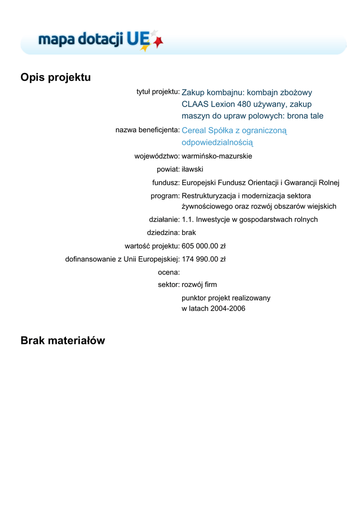 Opis projektu tytuł projektu: Zakup kombajnu: kombajn zbożowy CLAAS Lexion 480 używany, zakup maszyn do upraw polowych: brona tale nazwa beneficjenta: Cereal Spółka z ograniczoną odpowiedzialnością województwo: warmińsko-mazurskie powiat: iławski fundusz: Europejski Fundusz Orientacji i Gwarancji Rolnej program: Restrukturyzacja i modernizacja sektora żywnościowego oraz rozwój obszarów wiejskich działanie: 1.1. Inwestycje w gospodarstwach rolnych dziedzina: brak wartość projektu: 605 000.00 zł dofinansowanie z Unii Europejskiej: 174 990.00 zł ocena: sektor: rozwój firm punktor projekt realizowany w latach 2004-2006 Brak materiałów