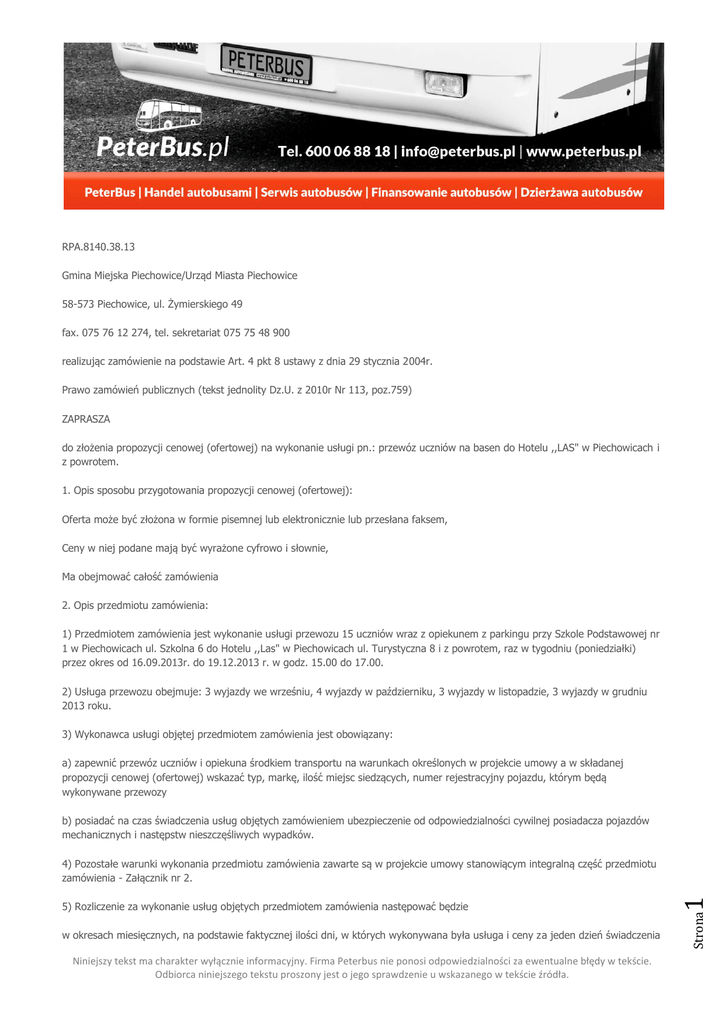 RPA.8140.38.13 Gmina Miejska Piechowice/Urząd Miasta Piechowice 58-573 Piechowice, ul. Żymierskiego 49 fax. 075 76 12 274, tel. sekretariat 075 75 48 900 realizując zamówienie na podstawie Art. 4 pkt 8 ustawy z dnia 29 stycznia 2004r. Prawo zamówień publicznych (tekst jednolity Dz.U. z 2010r Nr 113, poz.759) ZAPRASZA do złożenia propozycji cenowej (ofertowej) na wykonanie usługi pn.: przewóz uczniów na basen do Hotelu ,,LAS" w Piechowicach i z powrotem. 1. Opis sposobu przygotowania propozycji cenowej (ofertowej): Oferta może być złożona w formie pisemnej lub elektronicznie lub przesłana faksem, Ceny w niej podane mają być wyrażone cyfrowo i słownie, Ma obejmować całość zamówienia 2. Opis przedmiotu zamówienia: 1) Przedmiotem zamówienia jest wykonanie usługi przewozu 15 uczniów wraz z opiekunem z parkingu przy Szkole Podstawowej nr 1 w Piechowicach ul. Szkolna 6 do Hotelu ,,Las" w Piechowicach ul. Turystyczna 8 i z powrotem, raz w tygodniu (poniedziałki) przez okres od 16.09.2013r. do 19.12.2013 r. w godz. 15.00 do 17.00. 2) Usługa przewozu obejmuje: 3 wyjazdy we wrześniu, 4 wyjazdy w październiku, 3 wyjazdy w listopadzie, 3 wyjazdy w grudniu 2013 roku. 3) Wykonawca usługi objętej przedmiotem zamówienia jest obowiązany: a) zapewnić przewóz uczniów i opiekuna środkiem transportu na warunkach określonych w projekcie umowy a w składanej propozycji cenowej (ofertowej) wskazać typ, markę, ilość miejsc siedzących, numer rejestracyjny pojazdu, którym będą wykonywane przewozy b) posiadać na czas świadczenia usług objętych zamówieniem ubezpieczenie od odpowiedzialności cywilnej posiadacza pojazdów mechanicznych i następstw nieszczęśliwych wypadków. w okresach miesięcznych, na podstawie faktycznej ilości dni, w których wykonywana była usługa i ceny za jeden dzień świadczenia Niniejszy tekst ma charakter wyłącznie informacyjny. Firma Peterbus nie ponosi odpowiedzialności za ewentualne błędy w tekście. Odbiorca niniejszego tekstu proszony jest o jego sprawdzenie u wskazanego w tekście źródła. Strona 5) Rozliczenie za wykonanie usług objętych przedmiotem zamówienia następować będzie 1 4) Pozostałe warunki wykonania przedmiotu zamówienia zawarte są w projekcie umowy stanowiącym integralną część przedmiotu zamówienia - Załącznik nr 2. usług zaoferowanej w złożonej propozycji cenowej (ofertowej). 3. Wymagany termin realizacji zamówienia: od 16.09.2013r. do 19.12.2013r. 4. Propozycja cenowa (ofertowa) ma być sporządzona na Formularzu propozycji cenowej (ofertowej) wg załączonego wzoru Załącznik nr 1. 5. Opis sposobu obliczania ceny w składanej propozycji cenowej (ofertowej): Zaproponowana przez Oferenta cena ma zawierać cenę brutto w tym podatek VAT według obowiązującej stawki. Cena oferty (brutto wraz z podatkiem) jest ceną za jeden dzień świadczenia usług objętych zamówieniem zgodnie z powyższym opisem przedmiotu zamówienia. Cena oferty brutto musi obejmować wszelkie koszty niezbędne do poniesienia w celu wykonania kompletnego i prawidłowego zamówienia zgodnie z powyższym opisem przedmiotu zamówienia, w tym ubezpieczenie od odpowiedzialności cywilnej posiadacza pojazdów mechanicznych i następstw nieszczęśliwych wypadków. 6. Propozycje cenowe (ofertowe) będą oceniane wg następującego kryterium oceny ofert: Przy wyborze najkorzystniejszej oferty, zamawiający będzie się kierował jednym kryterium: CENA - 100%. Cena - A(X): Przyjmuje się, że najwyższą ilość punktów otrzyma cena najniższa wśród cen zawartych w propozycjach cenowych (ofertowych) na wykonanie zamówienia objętego nn. zaproszeniem. Ceny w pozostałych ofertach punktowane będą w oparciu o następujący wzór: A(X)=(C(min)/C(x))*100 gdzie: A(x) - ilość punktów przyznana ofercie ,,x" za kryterium ceny C min - cena najniższa wśród cen zawartych w ofertach na zadanie objęte nn. zamówieniem, C(x) - cena zawarta w ofercie ,,x" 7. Zamawiający udzieli zamówienia oferentowi, którego propozycja cenowa (ofertowa) odpowiada wszystkim wymaganiom przedstawionym w nn. zaproszeniu oraz zostanie oceniona, jako najkorzystniejsza w oparciu o podane kryterium wyboru, tj. otrzyma najwyższą ilość punktów - najniższa cena oferty. 8. Miejsce i termin złożenia propozycji cenowej (ofertowej): a) bezpośrednio w siedzibie Zamawiającego - 58-573 Piechowice, ul. Żymierskiego 49 b) drogą pocztową na adres: Urząd Miasta Piechowice ul. Żymierskiego 49, 58-573 Piechowice, Niniejszy tekst ma charakter wyłącznie informacyjny. Firma Peterbus nie ponosi odpowiedzialności za ewentualne błędy w tekście. Odbiorca niniejszego tekstu proszony jest o jego sprawdzenie u wskazanego w tekście źródła. Strona 2 Propozycję cenową należy złożyć (przesłać) w terminie do dnia 29 sierpnia 2013 r. do godz. 11:00 w jednej z wybranych form: c) faksem - pod numerem 75 76 12 274 d) drogą elektroniczną - adres e-mail: [email protected] adres email jest ukrywany przed spamerami, włącz obsługę JavaScript w przeglądarce, by go zobaczyć 9. Osobą uprawnioną do kontaktów z oferentami z ramienia zamawiającego jest Wiesława Rak, tel. 75/7548909, e-mail: [email protected] adres email jest ukrywany przed spamerami, włącz obsługę JavaScript w przeglądarce, by go zobaczyć 10. O wyborze najkorzystniejszej propozycji ofertowej (cenowej) oferenci, którzy złożyli ofertę zostaną powiadomieni faksem lub emailem. 11. Oferent , który złoży najkorzystniejszą ofertę zostanie zaproszony do podpisania umowy. 12. Informacje dotyczące zawierania umowy: W terminie do 05.września 2013 r. Oferent, którego propozycja cenowa (ofertowa) została uznana za najkorzystniejszą, jest zobowiązany do podpisania umowy. Umowa musi zawierać w swej treści wszystkie elementy oferty Wykonawcy. Przed podpisaniem umowy zwycięski oferent jest zobowiązany przedłożyć zamawiającemu odpis lub kopię dokumentu potwierdzon