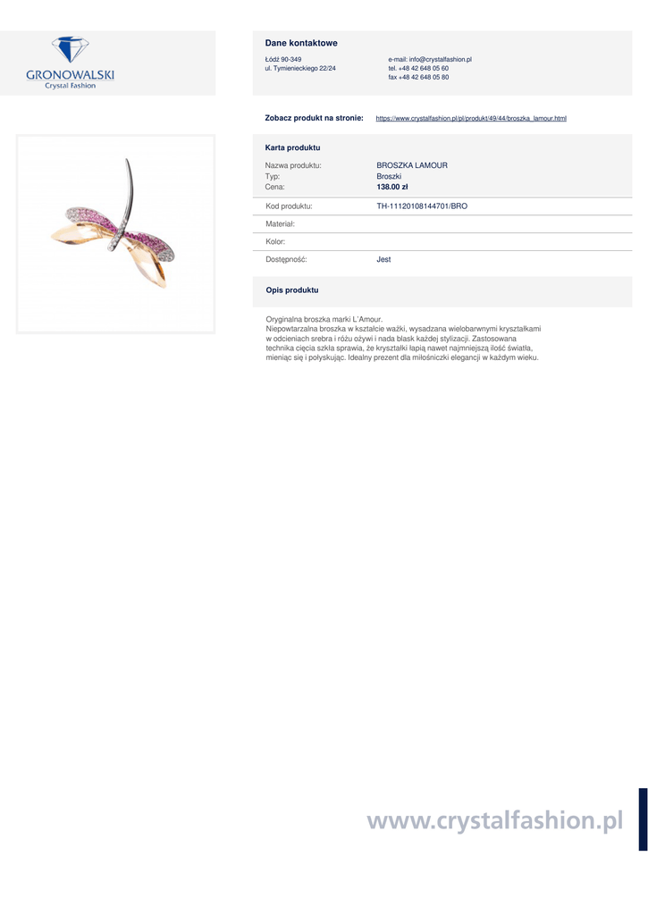 Powered by TCPDF (www.tcpdf.org) Dane kontaktowe Łódź 90-349 ul. Tymienieckiego 22/24 Zobacz produkt na stronie: e-mail: [email protected] tel. +48 42 648 05 60 fax +48 42 648 05 80 https://www.crystalfashion.pl/pl/produkt/49/44/broszka_lamour.html Karta produktu Nazwa produktu: Typ: Cena: BROSZKA LAMOUR Broszki 138.00 zł Kod produktu: TH-11120108144701/BRO Materiał: Kolor: Dostępność: Jest Opis produktu Oryginalna broszka marki L’Amour. Niepowtarzalna broszka w kształcie ważki, wysadzana wielobarwnymi kryształkami w odcieniach srebra i różu ożywi i nada blask każdej stylizacji. Zastosowana technika cięcia szkła sprawia, że kryształki łapią nawet najmniejszą ilość światła, mieniąc się i połyskując. Idealny prezent dla miłośniczki elegancji w każdym wieku.
