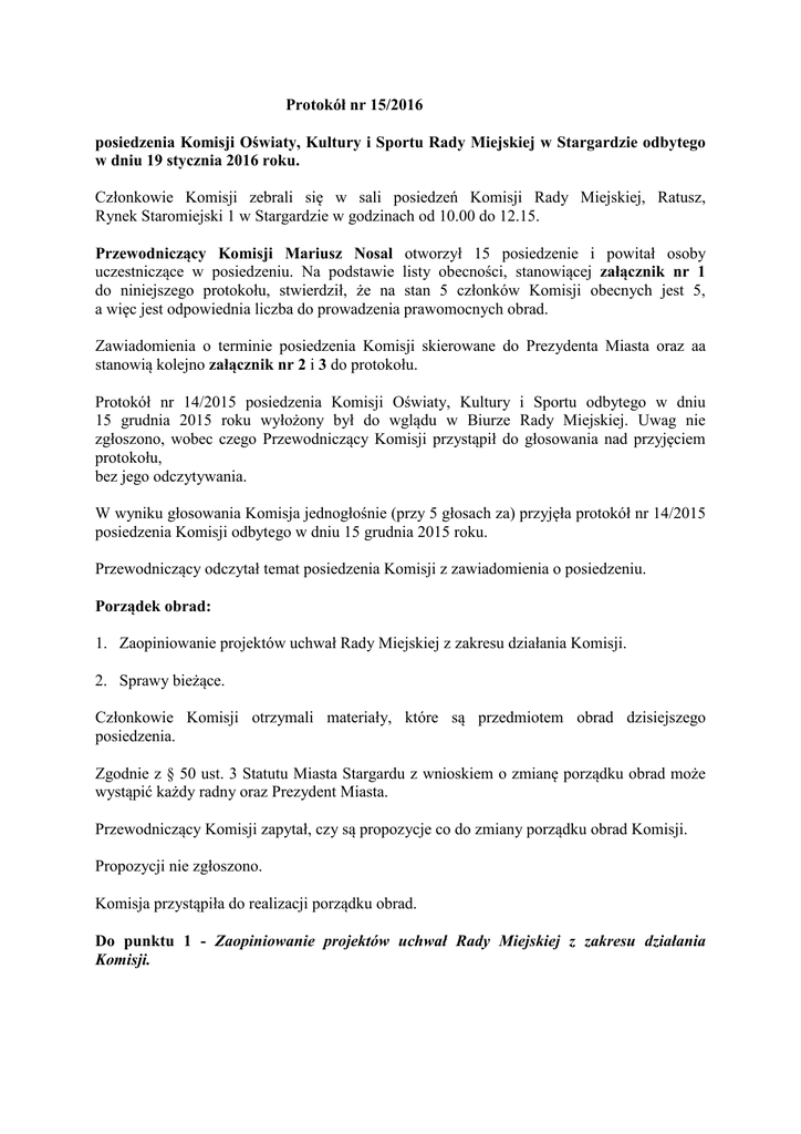 Protokół nr 15/2016 posiedzenia Komisji Oświaty, Kultury i Sportu Rady Miejskiej w Stargardzie odbytego w dniu 19 stycznia 2016 roku. Członkowie Komisji zebrali się w sali posiedzeń Komisji Rady Miejskiej, Ratusz, Rynek Staromiejski 1 w Stargardzie w godzinach od 10.00 do 12.15. Przewodniczący Komisji Mariusz Nosal otworzył 15 posiedzenie i powitał osoby uczestniczące w posiedzeniu. Na podstawie listy obecności, stanowiącej załącznik nr 1 do niniejszego protokołu, stwierdził, że na stan 5 członków Komisji obecnych jest 5, a więc jest odpowiednia liczba do prowadzenia prawomocnych obrad. Zawiadomienia o terminie posiedzenia Komisji skierowane do Prezydenta Miasta oraz aa stanowią kolejno załącznik nr 2 i 3 do protokołu. Protokół nr 14/2015 posiedzenia Komisji Oświaty, Kultury i Sportu odbytego w dniu 15 grudnia 2015 roku wyłożony był do wglądu w Biurze Rady Miejskiej. Uwag nie zgłoszono, wobec czego Przewodniczący Komisji przystąpił do głosowania nad przyjęciem protokołu, bez jego odczytywania. W wyniku głosowania Komisja jednogłośnie (przy 5 głosach za) przyjęła protokół nr 14/2015 posiedzenia Komisji odbytego w dniu 15 grudnia 2015 roku. Przewodniczący odczytał temat posiedzenia Komisji z zawiadomienia o posiedzeniu. Porządek obrad: 1. Zaopiniowanie projektów uchwał Rady Miejskiej z zakresu działania Komisji. 2. Sprawy bieżące. Członkowie Komisji otrzymali materiały, które są przedmiotem obrad dzisiejszego posiedzenia. Zgodnie z § 50 ust. 3 Statutu Miasta Stargardu z wnioskiem o zmianę porządku obrad może wystąpić każdy radny oraz Prezydent Miasta. Przewodniczący Komisji zapytał, czy są propozycje co do zmiany porządku obrad Komisji. Propozycji nie zgłoszono. Komisja przystąpiła do realizacji porządku obrad. Do punktu 1 - Zaopiniowanie projektów uchwał Rady Miejskiej z zakresu działania Komisji. W porządku obrad sesji nie było projektów uchwał z zakresu działania Komisji Oświaty, Kultury i Sportu, w związku z czym Komisja przystąpiła do realizacji następnego punktu porządku obrad. Do punktu 2 – Sprawy bieżące. Rozpatrzenie skargi Pani Ewy Jolanty Szymczyk-Baran nauczyciela Gimnazjum nr 2 z Oddziałami Mistrzostwa Sportowego im. Konstantego Ildefonsa Gałczyńskiego w Stargardzie przekazanej Radzie Miejskiej w Stargardzie w dniu 4 stycznia 2016 roku z upoważnienia Prezydenta Miasta Stargard przez Zastępcę Prezydenta Miasta Stargard Panią Ewę Sowę dotyczącą postępowania Dyrektora Gimnazjum nr 2 z Oddziałami Mistrzostwa Sportowego im. Konstantego Ildefonsa Gałczyńskiego w Stargardzie wykazanego w skardze. Przewodniczący Komisji Mariusz Nosal poinformował, że posiedzenie będzie nagrywane jedynie w celu precyzyjnego sporządzenia protokołu. Po przyjęciu protokołu na kolejnym posiedzeniu Komisji nagranie ulega likwidacji. Przedmiotowa skarga stanowi załącznik nr 4 do protokołu. Pismo wystosowane do Pani Iwony Kuleszewicz Dyrektora Gimnazjum nr 2 z Oddziałami Mistrzostwa Sportowego im. Konstantego Ildefonsa Gałczyńskiego w Stargardzie informujące o terminie posiedzenia Komisji Oświaty, Kultury i Sportu Rady Miejskiej, na którym będzie rozpatrywana skarga z prośbą o ustosunkowanie się do skargi, do wiadomości Prezydenta Miasta Stargard wraz z potwierdzeniem odbioru stanowi załącznik nr 5 do protokołu. Pismo wystosowane do Pani Ewy Jolanty Szymczyk-Baran nauczyciela Gimnazjum nr 2 z Oddziałami Mistrzostwa Sportowego im. Konstantego Ildefonsa Gałczyńskiego w Stargardzie informujące o terminie posiedzenia Komisji Oświaty, Kultury i Sportu Rady Miejskiej, na którym będzie rozpatrywana niniejsza skarga stanowi załącznik nr 6 do protokołu. Zwrotne potwierdzenie odbioru ww. pisma przez Panią Ewę Jolantę Szymczyk-Baran nauczyciela Gimnazjum nr 2 z Oddziałami Mistrzostwa Sportowego im. Konstantego Ildefonsa Gałczyńskiego w Stargardzie stanowi załącznik nr 7 do protokołu. Wyjaśnienie Dyrektora Gimnazjum nr 2 z Oddziałami Mistrzostwa Sportowego im. Konstantego Ildefonsa Gałczyńskiego w Stargardzie z dnia 13 stycznia 2016 roku do skargi stanowi załącznik nr 8 do protokołu. Przewodniczący Komisji Mariusz Nosal w nawiązaniu do zarzutu zawartego w skardze dotyczącego odmowy dofinansowania kosztów zakupu okularów korekcyjnych powiedział, że Pani Iwona Kuleszewicz Dyrektor Gimnazjum nr 2 z Oddziałami Mistrzostwa Sportowego im. Konstantego Ildefonsa Gałczyńskiego w Stargardzie ustosunkowała się do tej kwestii. Przewodniczący zwracając się do Pani Ewy Jolanty Szymczyk-Baran zapytał, czy zgadza się z argumentacją przedstawioną w wyjaśnieniu Pani Dyrektor. Pani Ewa Jolanta Szymczyk-Baran nauczyciel Gimnazjum nr 2 z Oddziałami Mistrzostwa Sportowego im. Konstantego Ildefonsa Gałczyńskiego powiedziała, że nigdy 2 by nie przypuszczała, iż po 30 latach pracy będzie oskarżała Panią Dyrektor. Nie zgadza się z argumentacją Pani Dyrektor. Nie myślała, że do takiej sytuacji dojdzie, ale sytuacja jest już taka, iż musiała skargę złożyć. Specjalista ds. BHP stwierdził, że obraz rzucany z projektora nie jest tożsamy z pracą przy monitorze komputera. Nie pracuje z obrazem rzucanym przez projektor na ścianę, ale przy komputerze. Od 5 lat na biurku Pani Ewy Jolanty Szymczyk-Baran stoi monitor, ale projektor został zamontowany w lutym 2010 roku, a komputer otrzymała z zasobów szkoły dopiero we wrześniu. Przez pierwsze pół roku korzystała z osobistego komputera (laptopa). Przez ten czas korzystano z dziennika internetowego, a więc na każdej lekcji korzystała z komputera. Sporządzanie raportów, sprawozdań, różnego rodzaju planów lekcji, czy planów pracy zespołów wykonuje na komputerze. Wykorzystuje komputer do swojej pracy zarówno w szkole, jak i w domu. W domu przygotowuje sprawdziany, różnego rodzaju pomoce dla uczniów, filmy, programy edukacyjne. Okulary, to nie jest tylko kwestia komputera, ale też kwestia