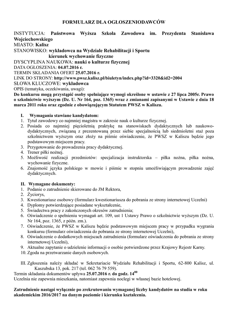 FORMULARZ DLA OGŁOSZENIODAWCÓW INSTYTUCJA: Państwowa Wyższa Szkoła Zawodowa im. Wojciechowskiego MIASTO: Kalisz STANOWISKO: wykładowca na Wydziale Rehabilitacji i Sportu kierunek wychowanie fizyczne DYSCYPLINA NAUKOWA: nauki o kulturze fizycznej Prezydenta Stanisława DATA OGŁOSZENIA: 04.07.2016 r. TERMIN SKŁADANIA OFERT 25.07.2016 r. LINK DO STRONY: http://www.pwsz.kalisz.pl/biuletyn/index.php?id=3320&id2=2004 SŁOWA KLUCZOWE: wykładowca OPIS (tematyka, oczekiwania, uwagi): Do konkursu mogą przystąpić osoby spełniające wymogi określone w ustawie z 27 lipca 2005r. Prawo o szkolnictwie wyższym (Dz. U. Nr 164, poz. 1365) wraz z zmianami zapisanymi w Ustawie z dnia 18 marca 2011 roku oraz zgodnie z obowiązującym Statutem PWSZ w Kaliszu. I. Wymagania stawiane kandydatom: 1. Tytuł zawodowy co najmniej magistra w zakresie nauk o kulturze fizycznej. 2. Posiada co najmniej pięcioletnią praktykę na stanowiskach dydaktycznych lub naukowodydaktycznych, związaną z prezentowaną przez siebie specjalnością lub siedmioletni staż poza szkolnictwem wyższym oraz złoży na piśmie oświadczenie, że PWSZ w Kaliszu będzie jego podstawowym miejscem pracy. 3. Przygotowanie do prowadzenia pracy dydaktycznej. 4. Trener piłki nożnej. 5. Możliwość realizacji przedmiotów: specjalizacja instruktorska – piłka nożna, piłka nożna, wychowanie fizyczne. 6. Znajomość języka polskiego w mowie i piśmie w stopniu umożliwiającym prowadzenie zajęć dydaktycznych. II. 1. 2. 3. 4. 5. 6. Wymagane dokumenty: Podanie o zatrudnienie skierowane do JM Rektora, Życiorys, Kwestionariusz osobowy (formularz kwestionariusza do pobrania ze strony internetowej Uczelni) Dyplomy potwierdzające posiadane wykształcenie, Świadectwa pracy z zakończonych okresów zatrudnienia; Oświadczenie o spełnieniu wymagań art. 109, ust 1 Ustawy Prawo o szkolnictwie wyższym (Dz. U. Nr 164, poz. 1365, z późn. zm.). 7. Oświadczenie, że PWSZ w Kaliszu będzie podstawowym miejscem pracy w przypadku wygrania konkursu (formularz oświadczenia do pobrania ze strony internetowej Uczelni), 8. Oświadczenie o dodatkowych miejscach zatrudnienia (formularz oświadczenia do pobrania ze strony internetowej Uczelni), 9. Aktualne zapytanie o udzielenie informacji o osobie potwierdzone przez Krajowy Rejestr Karny. 10. Zgoda na przetwarzanie danych osobowych. III. Zgłoszenia należy składać w Sekretariacie Wydziału Rehabilitacji i Sportu, 62-800 Kalisz, ul. Kaszubska 13, pok. 217 (tel. 062 76 79 559). Termin składania dokumentów upływa 25.07.2016 r. do godz. 1400 Uczelnia nie zapewnia mieszkania, natomiast zapewnia noclegi w własnej bazie hotelowej. Zatrudnienie nastąpi wyłącznie po zrekrutowaniu wymaganej liczby kandydatów na studia w roku akademickim 2016/2017 na danym poziomie i kierunku kształcenia.