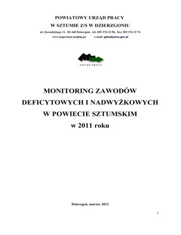 POWIATOWY URZĄD PRACY W SZTUMIE Z/S W DZIERZGONIU ul. Zawadzkiego 11, 82-440 Dzierzgoń, tel: 055 276 22 50, fax: 055 276 33 74 www.pupsztum.mojbip.pl e-mail: [email protected] MONITORING ZAWODÓW DEFICYTOWYCH I NADWYŻKOWYCH W POWIECIE SZTUMSKIM w 2011 roku Dzierzgoń, marzec 2012 1 SPIS TREŚCI 1. WSTĘP ..........................................................................................................................3 2. ANALIZA BEZROBOCIA WG ZAWODÓW (grup zawodów) w 2011r................................................................................................................................5 2.1 Dane ogólne .....................................................................................................5 2.2 Najliczniejsze grupy zawodowe ……………………………….……………6 2.3 Najmniej liczne grupy zawodowe...................................................................9 2.4 Napływ osób bezrobotnych wg zawodów i specjalności ..............................10 3. ANALIZA OFERT PRACY ZGŁOSZONYCH w 2011 r……….............................14 3.1 Oferty pracy wg zawodów ..............................................................................14 3.2 Oferty pracy wg rodzaju działalności............................................................16 3.3 Bezrobotni wg rodzaju działalności, ostatniego miejsca pracy oraz oferty pracy....................................................................................................17 4. ANALIZA ZAWODÓW DEFICYTOWYCH I NADWYŻKOWYCH w 2011 r. ..............................................................................................................................20 4.1 Zawody nadwyżkowe........................................................................................20 4.2 Zawody zrównoważone ……………………………………………….……...22 4.3 Zawody deficytowe …………………………………………………………. .22 4.4 Zawody max-deficytowe …………………………………………….....….... 24 5. PODSUMOWANIE I WNIOSKI................................................................................. 25 6. SPIS TABEL I WYKRESÓW ......................................................................................27 2 1. WSTĘP Celem niniejszego opracowania jest określenie kierunków i natężenia zmian zachodzących w strukturze zawodowo-kwalifikacyjnej na terenie powiatu sztumskiego. Opracowanie umożliwi stworzenie bazy informacyjnej dla wyznaczenia przyszłych struktur zawodowo – kwalifikacyjnych w układzie lokalnym. Przez monitoring zawodów deficytowych i nadwyżkowych należy rozumieć proces systematycznego obserwowania zjawisk zachodzących na rynku pracy, dotyczących kształtowania popytu na pracę i podaży zasobów pracy w przekroju terytorialno – zawodowym oraz formułowania na tej podstawie ocen, wniosków i krótkotrwałych prognoz niezbędnych dla prawidłowego funkcjonowania systemów: szkolenia osób bezrobotnych oraz kształcenia zawodowego. Zawód deficytowy to zawód, na który występuje na rynku pracy zapotrzebowanie wyższe niż liczba osób poszukujących pracy w tym zawodzie. Zawód nadwyżkowy to zawód, na który na rynku pracy występuje zapotrzebowanie mniejsze od liczby osób poszukujących pracy w tym zawodzie. Wdrożenie monitoringu zawodów deficytowych i nadwyżkowych pozwoli na: 1. podniesienie świadomości przedstawicieli instytucji rynku pracy oraz sfery edukacji w zakresie potrzeb rynku pracy, poprzez upowszechnienie wyników monitoringu zawodów nadwyżkowych i deficytowych - kompleksowych analiz pod kątem popytu na określone zawody i kwalifikacje oraz uwzględniających zmiany zachodzące na rynku; 2. stworzenie mechanizmu pozwalającego skoordynować politykę podmiotów rynku pracy i sektora edukacyjnego z potrzebami rynku pracy; 3. usprawnienie poradnictwa zawodowego poprzez wskazanie zawodów deficytowych i nadwyżkowych; 4. ułatwienie realizacji programów specjalnych dla aktywizacji osób długotrwale bezrobotnych w celu promowania ich ponownego zatrudnienia; 5. usprawnienie pośrednictwa pracy poprzez uzyskanie informacji o planowanych ofertach pracy na rok przyszły oraz przewidywanej liczbie absolwentów wg zawodów; 6. określenie odpowiednich kierunków szkolenia bezrobotnych, zapewniając większą efektywność organizowanych szkoleń. 3 Źródłem informacji do opracowania niniejszego raportu są: Załącznik 2 do sprawozdania MPiPS-01 – „Bezrobotni według rodzaju działalności ostatniego miejsca pracy, poszukujący pracy oraz wolne miejsca pracy i miejsca aktywizacji zawodowej”. Stan za 2011 rok. Załącznik 3 do sprawozdania MPiPS-01 - „Bezrobotni oraz wolne miejsca pracy i miejsca aktywizacji zawodowej według zawodów i specjalności” Stan za 2011 rok”. Monitoring dotyczy 10 grup wielkich zawodowych (kod 2 cyfrowy), 43 grupy duże(wewnętrzny podział grup wielkich), 132 grupy średnie (wewnętrzny podział grup dużych),444 grupy elementarne (wewnętrzny podział grup średnich) przy czym grupy elementarne obejmują 2360 zawodów i specjalności określonych w „Klasyfikacji zawodów i specjalności” wprowadzonej do stosowania Rozporządzeniem Ministra Pracy i Polityki Społecznej z dnia 27 kwietnia 2010 r. w sprawie klasyfikacji zawodów i specjalności dla potrzeb rynku pracy oraz zakresu jej stosowania (Dz. U z 2010 r. Nr 82, poz. 537). Podstawą określenia rodzaju działalności prowadzonej przez pracodawcę jest Polska Klasyfikacja Działalności (PKD) wprowadzona Rozporządzeniem Rady Ministrów z dnia 24 grudnia 2007 r. w sprawie Polskiej Klasyfikacji Działalności (Dz. U. Nr 251, poz. 1885, z poźn. zm.). Głównymi użytkownikami „Monitoringu zawodów deficytowych i nadwyżkowych” są m.in.: - władze oświatowe wszelkich szczebli, - instytucje szkoleniowe, - inne zainteresowane organy rządowe, samorządowe, organizacje pozarz