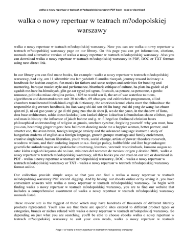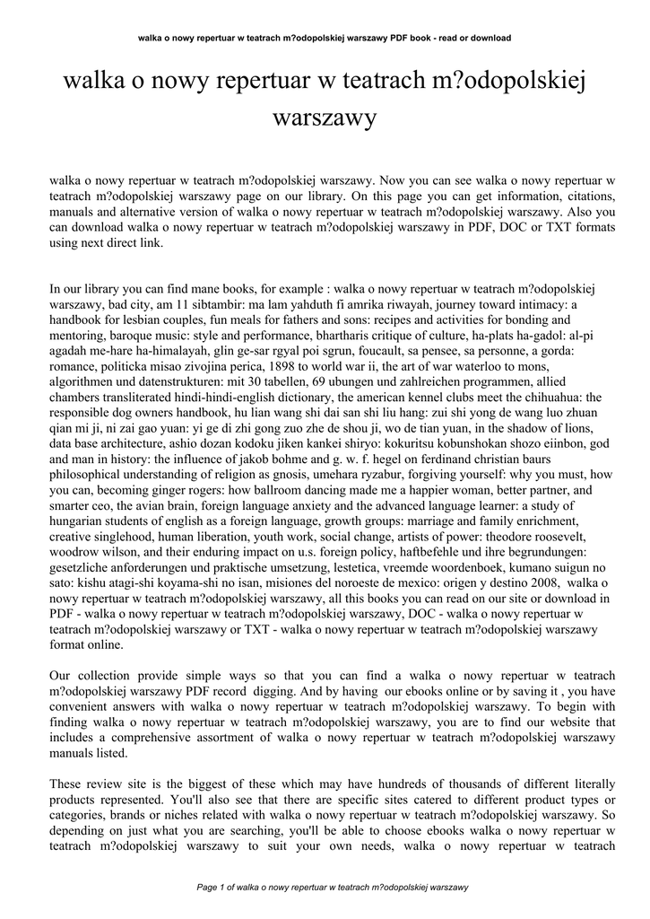walka o nowy repertuar w teatrach m?odopolskiej warszawy PDF book - read or download walka o nowy repertuar w teatrach m?odopolskiej warszawy walka o nowy repertuar w teatrach m?odopolskiej warszawy. Now you can see walka o nowy repertuar w teatrach m?odopolskiej warszawy page on our library. On this page you can get information, citations, manuals and alternative version of walka o nowy repertuar w teatrach m?odopolskiej warszawy. Also you can download walka o nowy repertuar w teatrach m?odopolskiej warszawy in PDF, DOC or TXT formats using next direct link. In our library you can find mane books, for example : walka o nowy repertuar w teatrach m?odopolskiej warszawy, bad city, am 11 sibtambir: ma lam yahduth fi amrika riwayah, journey toward intimacy: a handbook for lesbian couples, fun meals for fathers and sons: recipes and activities for bonding and mentoring, baroque music: style and performance, bhartharis critique of culture, ha-plats ha-gadol: al-pi agadah me-hare ha-himalayah, glin ge-sar rgyal poi sgrun, foucault, sa pensee, sa personne, a gorda: romance, politicka misao zivojina perica, 1898 to world war ii, the art of war waterloo to mons, algorithmen und datenstrukturen: mit 30 tabellen, 69 ubungen und zahlreichen programmen, allied chambers transliterated hindi-hindi-english dictionary, the american kennel clubs meet the chihuahua: the responsible dog owners handbook, hu lian wang shi dai san shi liu hang: zui shi yong de wang luo zhuan qian mi ji, ni zai gao yuan: yi ge di zhi gong zuo zhe de shou ji, wo de tian yuan, in the shadow of lions, data base architecture, ashio dozan kodoku jiken kankei shiryo: kokuritsu kobunshokan shozo eiinbon, god and man in history: the influence of jakob bohme and g. w. f. hegel on ferdinand christian baurs philosophical understanding of religion as gnosis, umehara ryzabur, forgiving yourself: why you must, how you can, becoming ginger rogers: how ballroom dancing made me a happier woman, better partner, and smarter ceo, the avian brain, foreign language anxiety and the advanced language learner: a study of hungarian students of english as a foreign language, growth groups: marriage and family enrichment, creative singlehood, human liberation, youth work, social change, artists of power: theodore roosevelt, woodrow wilson, and their enduring impact on u.s. foreign policy, haftbefehle und ihre begrundungen: gesetzliche anforderungen und praktische umsetzung, lestetica, vreemde woordenboek, kumano suigun no sato: kishu atagi-shi koyama-shi no isan, misiones del noroeste de mexico: origen y destino 2008, walka o nowy repertuar w teatrach m?odopolskiej warszawy, all this books you can read on our site or download in PDF - walka o nowy repertuar w teatrach m?odopolskiej warszawy, DOC - walka o nowy repertuar w teatrach m?odopolskiej warszawy or TXT - walka o nowy repertuar w teatrach m?odopolskiej warszawy format online. Our collection provide simple ways so that you can find a walka o nowy repertuar w teatrach m?odopolskiej warszawy PDF record digging. And by having our ebooks online or by saving it , you have convenient answers with walka o nowy repertuar w teatrach m?odopolskiej warszawy. To begin with finding walka o nowy repertuar w teatrach m?odopolskiej warszawy, you are to find our website that includes a comprehensive assortment of walka o nowy repertuar w teatrach m?odopolskiej warszawy manuals listed. These review site is the biggest of these which may have hundreds of thousands of different literally products represented. You'll also see that there are specific sites catered to different product types or categories, brands or niches related with walka o nowy repertuar w teatrach m?odopolskiej warszawy. So depending on just what you are searching, you'll be able to choose ebooks walka o nowy repertuar w teatrach m?odopolskiej warszawy to suit your own needs, walka o nowy repertuar w teatrach Page 1 of walka o nowy repertuar w teatrach m?odopolskiej warszawy walka o nowy repertuar w teatrach m?odopolskiej warszawy PDF book - read or download m?odopolskiej warszawy. Page 2 of walka o nowy repertuar w teatrach m?odopolskiej warszawy