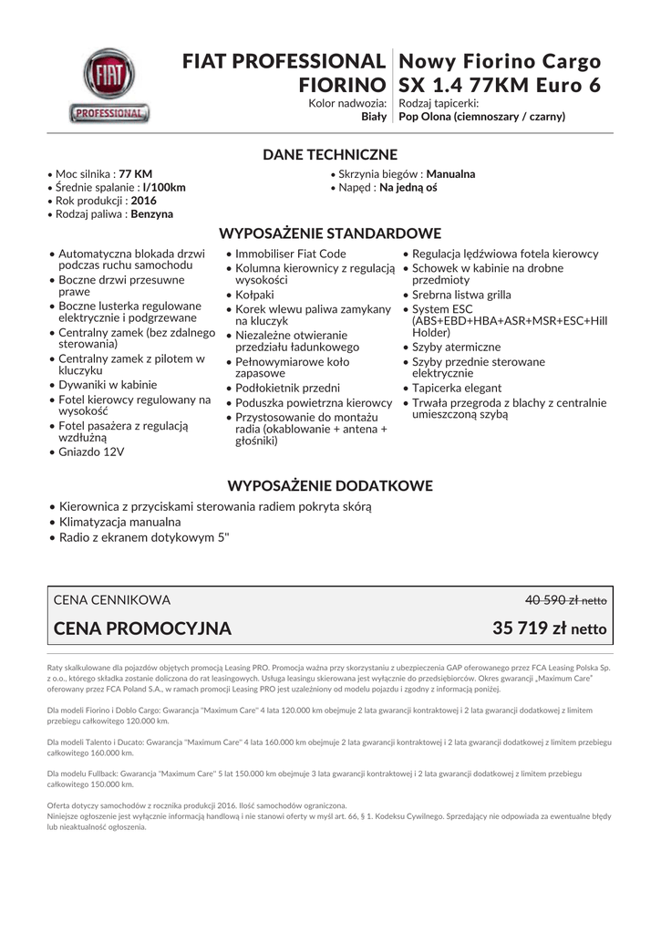 FIAT PROFESSIONAL Nowy Fiorino Cargo FIORINO SX 1.4 77KM Euro 6 Kolor nadwozia: Biały Rodzaj tapicerki: Pop Olona (ciemnoszary / czarny) DANE TECHNICZNE • Moc silnika : 77 KM • Średnie spalanie : l/100km • Rok produkcji : 2016 • Rodzaj paliwa : Benzyna • Skrzynia biegów : Manualna • Napęd : Na jedną oś WYPOSAŻENIE STANDARDOWE • Automatyczna blokada drzwi podczas ruchu samochodu • Boczne drzwi przesuwne prawe • Boczne lusterka regulowane elektrycznie i podgrzewane • Centralny zamek (bez zdalnego sterowania) • Centralny zamek z pilotem w kluczyku • Dywaniki w kabinie • Fotel kierowcy regulowany na wysokość • Fotel pasażera z regulacją wzdłużną • Gniazdo 12V • Immobiliser Fiat Code • Kolumna kierownicy z regulacją wysokości • Kołpaki • Korek wlewu paliwa zamykany na kluczyk • Niezależne otwieranie przedziału ładunkowego • Pełnowymiarowe koło zapasowe • Podłokietnik przedni • Poduszka powietrzna kierowcy • Przystosowanie do montażu radia (okablowanie + antena + głośniki) • Regulacja lędźwiowa fotela kierowcy • Schowek w kabinie na drobne przedmioty • Srebrna listwa grilla • System ESC (ABS+EBD+HBA+ASR+MSR+ESC+Hill Holder) • Szyby atermiczne • Szyby przednie sterowane elektrycznie • Tapicerka elegant • Trwała przegroda z blachy z centralnie umieszczoną szybą WYPOSAŻENIE DODATKOWE • Kierownica z przyciskami sterowania radiem pokryta skórą • Klimatyzacja manualna • Radio z ekranem dotykowym 5" CENA CENNIKOWA CENA PROMOCYJNA 40 590 zł netto 35 719 zł netto Raty skalkulowane dla pojazdów objętych promocją Leasing PRO. Promocja ważna przy skorzystaniu z ubezpieczenia GAP oferowanego przez FCA Leasing Polska Sp. z o.o., którego składka zostanie doliczona do rat leasingowych. Usługa leasingu skierowana jest wyłącznie do przedsiębiorców. Okres gwarancji „Maximum Care” oferowany przez FCA Poland S.A., w ramach promocji Leasing PRO jest uzależniony od modelu pojazdu i zgodny z informacją poniżej. Dla modeli Fiorino i Doblo Cargo: Gwarancja "Maximum Care" 4 lata 120.000 km obejmuje 2 lata gwarancji kontraktowej i 2 lata gwarancji dodatkowej z limitem przebiegu całkowitego 120.000 km. Dla modeli Talento i Ducato: Gwarancja "Maximum Care" 4 lata 160.000 km obejmuje 2 lata gwarancji kontraktowej i 2 lata gwarancji dodatkowej z limitem przebiegu całkowitego 160.000 km. Dla modelu Fullback: Gwarancja "Maximum Care" 5 lat 150.000 km obejmuje 3 lata gwarancji kontraktowej i 2 lata gwarancji dodatkowej z limitem przebiegu całkowitego 150.000 km. Oferta dotyczy samochodów z rocznika produkcji 2016. Ilość samochodów ograniczona. Niniejsze ogłoszenie jest wyłącznie informacją handlową i nie stanowi oferty w myśl art. 66, § 1. Kodeksu Cywilnego. Sprzedający nie odpowiada za ewentualne błędy lub nieaktualność ogłoszenia.
