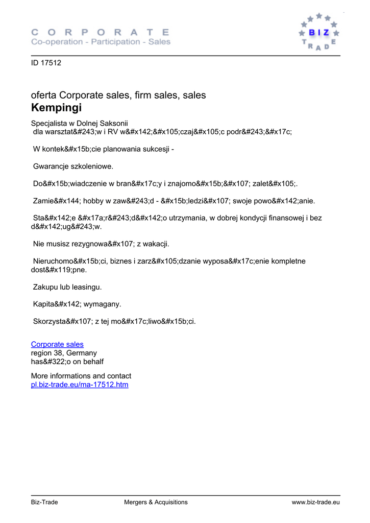ID 17512 oferta Corporate sales, firm sales, sales Kempingi Specjalista w Dolnej Saksonii dla warsztatów i RV włączając podróż W kontekście planowania sukcesji Gwarancje szkoleniowe. Doświadczenie w branży i znajomość zaletą. Zamień hobby w zawód - śledzić swoje powołanie. Stałe źródło utrzymania, w dobrej kondycji finansowej i bez długów. Nie musisz rezygnować z wakacji. Nieruchomości, biznes i zarządzanie wyposażenie kompletne dostępne. Zakupu lub leasingu. Kapitał wymagany. Skorzystać z tej możliwości. Corporate sales region 38, Germany hasło on behalf More informations and contact pl.biz-trade.eu/ma-17512.htm Biz-Trade Mergers & Acquisitions www.biz-trade.eu