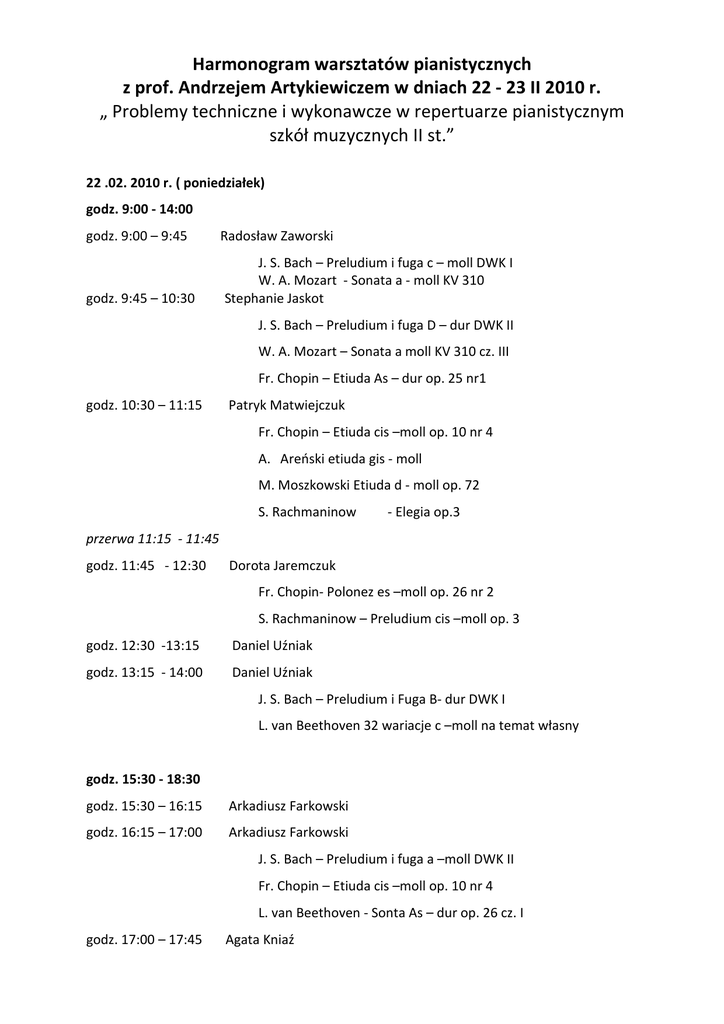 Harmonogram warsztatów pianistycznych z prof. Andrzejem Artykiewiczem w dniach 22 - 23 II 2010 r. „ Problemy techniczne i wykonawcze w repertuarze pianistycznym szkół muzycznych II st.” 22 .02. 2010 r. ( poniedziałek) godz. 9:00 - 14:00 godz. 9:00 – 9:45 Radosław Zaworski godz. 9:45 – 10:30 J. S. Bach – Preludium i fuga c – moll DWK I W. A. Mozart - Sonata a - moll KV 310 Stephanie Jaskot J. S. Bach – Preludium i fuga D – dur DWK II W. A. Mozart – Sonata a moll KV 310 cz. III Fr. Chopin – Etiuda As – dur op. 25 nr1 godz. 10:30 – 11:15 Patryk Matwiejczuk Fr. Chopin – Etiuda cis –moll op. 10 nr 4 A. Areński etiuda gis - moll M. Moszkowski Etiuda d - moll op. 72 S. Rachmaninow - Elegia op.3 przerwa 11:15 - 11:45 godz. 11:45 - 12:30 Dorota Jaremczuk Fr. Chopin- Polonez es –moll op. 26 nr 2 S. Rachmaninow – Preludium cis –moll op. 3 godz. 12:30 -13:15 Daniel Uźniak godz. 13:15 - 14:00 Daniel Uźniak J. S. Bach – Preludium i Fuga B- dur DWK I L. van Beethoven 32 wariacje c –moll na temat własny godz. 15:30 - 18:30 godz. 15:30 – 16:15 Arkadiusz Farkowski godz. 16:15 – 17:00 Arkadiusz Farkowski J. S. Bach – Preludium i fuga a –moll DWK II Fr. Chopin – Etiuda cis –moll op. 10 nr 4 L. van Beethoven - Sonta As – dur op. 26 cz. I godz. 17:00 – 17:45 Agata Kniaź S. Rachmaninow - Etiuda – Obraz op. Fr. Chopin godz. 17:45 – 18:30 - Etiuda As – dur op. 25 nr 1 dyskusja podsumowująca zajęcia warsztatowe 23.02. 2010 r. ( wtorek) godz. 9:00 - 14:00 godz. 9:00 – 9:45 Krzysztof Będkowski godz. 9:45 – 10:30 F. Liszt Etiuda Un Sospiro Michał Landowski godz. 10:30 – 11:15 Michał Landowski J. S. Bach – II Partita c –moll, części : Courente, Sarabande J. Haydn – Sonata C – dur Hob. XVI /50 cz. I A. Skriabin Etiuda dis – moll op. 8 nr 12 przerwa 11:15 - 12:30 godz. 12:30 -13:15 Radosław Zaworski W. A. Mozart - Sonata a-moll KV 310 Fr. Chopin - Etiuda e - moll op. 25 nr 5 godz. 13:15 - 14:00 Dominik Wizjan Fr. Chopin –Nokturn c – moll op. 48 Fr. Chopin – Etiuda F – dur op. 10 nr 8 Godz. 14:00 – 14:45 Anna Snelewska L. van Beethoven – Sonata F- dur op. 54 cz. I M. Moszkowski - Etiuda op. 36 nr 6 “Iskierki” Godz. 15:55 zakończenie warsztatów