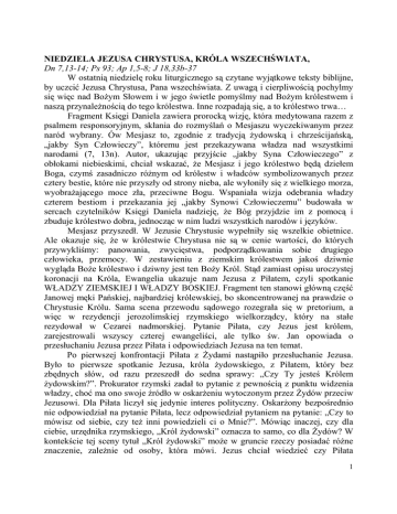NIEDZIELA JEZUSA CHRYSTUSA, KRÓLA WSZECHŚWIATA, Dn 7,13-14; Ps 93; Ap 1,5-8; J 18,33b-37 W ostatnią niedzielę roku liturgicznego są czytane wyjątkowe teksty biblijne, by uczcić Jezusa Chrystusa, Pana wszechświata. Z uwagą i cierpliwością pochylmy się więc nad BoŜym Słowem i w jego świetle pomyślmy nad BoŜym królestwem i naszą przynaleŜnością do tego królestwa. Inne rozpadają się, a to królestwo trwa… Fragment Księgi Daniela zawiera prorocką wizję, która medytowana razem z psalmem responsoryjnym, skłania do rozmyślań o Mesjaszu wyczekiwanym przez naród wybrany. Ów Mesjasz to, zgodnie z tradycją Ŝydowską i chrześcijańską, „jakby Syn Człowieczy”, któremu jest przekazywana władza nad wszystkimi narodami (7, 13n). Autor, ukazując przyjście „jakby Syna Człowieczego” z obłokami niebieskimi, chciał wskazać, Ŝe Mesjasz i jego królestwo będą dziełem Boga, czymś zasadniczo róŜnym od królestw i władców symbolizowanych przez cztery bestie, które nie przyszły od strony nieba, ale wyłoniły się z wielkiego morza, wyobraŜającego moce zła, przeciwne Bogu. Wspaniała wizja odebrania władzy czterem bestiom i przekazania jej „jakby Synowi Człowieczemu” budowała w sercach czytelników Księgi Daniela nadzieję, Ŝe Bóg przyjdzie im z pomocą i zbuduje królestwo dobra, jednocząc w nim ludzi wszystkich narodów i języków. Mesjasz przyszedł. W Jezusie Chrystusie wypełniły się wszelkie obietnice. Ale okazuje się, Ŝe w królestwie Chrystusa nie są w cenie wartości, do których przywykliśmy: panowania, zwycięstwa, podporządkowania sobie drugiego człowieka, przemocy. W zestawieniu z ziemskim królestwem jakoś dziwnie wygląda BoŜe królestwo i dziwny jest ten BoŜy Król. Stąd zamiast opisu uroczystej koronacji na Króla, Ewangelia ukazuje nam Jezusa z Piłatem, czyli spotkanie WŁADZY ZIEMSKIEJ I WŁADZY BOSKIEJ. Fragment ten stanowi główną część Janowej męki Pańskiej, najbardziej królewskiej, bo skoncentrowanej na prawdzie o Chrystusie Królu. Sama scena przewodu sądowego rozegrała się w pretorium, a więc w rezydencji jerozolimskiej rzymskiego wielkorządcy, który na stałe rezydował w Cezarei nadmorskiej. Pytanie Piłata, czy Jezus jest królem, zarejestrowali wszyscy czterej ewangeliści, ale tylko św. Jan opowiada o przesłuchaniu Jezusa przez Piłata i odpowiedziach Jezusa na ten temat. Po pierwszej konfrontacji Piłata z śydami nastąpiło przesłuchanie Jezusa. Było to pierwsze spotkanie Jezusa, króla Ŝydowskiego, z Piłatem, który bez zbędnych słów, od razu przeszedł do sedna sprawy: „Czy Ty jesteś Królem Ŝydowskim?”. Prokurator rzymski zadał to pytanie z pewnością z punktu widzenia władzy, choć ma ono swoje źródło w oskarŜeniu wytoczonym przez śydów przeciw Jezusowi. Dla Piłata liczył się jedynie interes polityczny. OskarŜony bezpośrednio nie odpowiedział na pytanie Piłata, lecz odpowiedział pytaniem na pytanie: „Czy to mówisz od siebie, czy teŜ inni powiedzieli ci o Mnie?”. Mówiąc inaczej, czy dla ciebie, urzędnika rzymskiego, „Król Ŝydowski” oznacza to samo, co dla śydów? W kontekście tej sceny tytuł „Król Ŝydowski” moŜe w gruncie rzeczy posiadać róŜne znaczenie, zaleŜnie od osoby, która mówi. Jezus chciał wiedzieć czy Piłata 1 interesowało to, Kto przed nim stał. Czy był tylko zwykłym prawnikiem, który załatwiał sprawę, czy interesował go człowiek. Niestety, w Piłacie górę wzięła pycha wielkorządcy Cezara, okupanta Judei, oraz osobista niechęć do śydów wraz z ich oficjalnymi przedstawicielami. Piłat wprost poczuł się uraŜony kontrpytaniem, jakie zadał mu Jezus. Namiestnik odpowiedział: „Czy ja jestem śydem?”. Po prostu nie chciał brać tej sprawy w swoje ręce: „Naród twój i arcykapłani wydali mi Ciebie: coś uczynił?”. W tych słowach wyczuwa się klimat niecierpliwości. Piłat wymagał, aby o sprawie mówić jasno, lecz odpowiedź Jezusa była spokojna i zarazem tajemnicza: „Królestwo moje nie jest z tego świata, gdyby królestwo moje było z tego świata, słudzy moi biliby się, abym nie został wydany śydom. Teraz zaś królestwo moje nie jest stąd”. Teraz tylko jedna rzecz interesowała Piłata: „A więc jesteś królem?”. Na co Jezus odpowiedział (dosłownie, według greckiego oryginału): „Ty sam mówisz, Ŝe jestem królem”. Słowa te naleŜy rozumieć następująco: „Rzeczywiście jestem królem, ale nie w takim sensie, jak ty, Piłacie, to rozumiesz”. Jezus zaakceptował tytuł, lecz podał jednocześnie jego sens. A zatem nie powiedział: „Tak, jestem królem”, poniewaŜ w ten sposób potwierdziłby rozumowanie Piłata. Zatem, Chrystus nie jest królem na wzór tyranów ziemskich, a Jego Kościół nie ma nic wspólnego z doczesną władzą: „Królestwo moje nie jest z tego świata”. W gruncie rzeczy oznacza to, Ŝe godność królewska Chrystusa nie opiera się na władzy tego świata i absolutnie nie czerpie z niej inspiracji. Jezus sprawuje władzę na świecie, która realizowana jest w inny sposób niŜ władza ziemska i która czerpie swoją inspirację z innego źródła. W jaki sposób ma się to dokonać? Jezus wyjaśnił to Piłatowi w drugiej części swojej odpowiedzi, gdy powiedział: „Na to przyszedłem na świat, aby dać świadectwo prawdzie”. Św. Jan słowo „prawda” rozumie w sensie biblijnym. „Prawda” to odsłonięcie planu BoŜego. Misja Jezusa polegała na przyniesieniu światu pełni objawienia: pozwolił się poznać jako Syn BoŜy. Jeśli więc Jezus jest prawdą, jeśli Jego ustne objawienie jest odsłonięciem tajemnicy, to ludzie powinni przyjąć to świadectwo, tę prawdę. Człowiek powinien pozwolić się prowadzić i kształtować światłu prawdy, słowu BoŜemu. To właśnie oznacza „być z prawdy”, to jest to, co Jezus powiedział Piłatowi: „KaŜdy, kto jest z prawdy, słucha moje