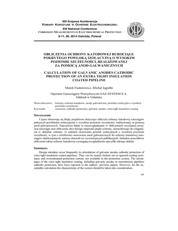 XIII Krajowa Konferencja POMIARY KOROZYJNE W OCHRONIE ELEKTROCHEMICZNEJ XIII National Conference CORROSION MEASUREMENTS IN ELECTROCHEMICAL PROTECTION 9-11. 06. 2014 Ostróda, Poland OBLICZENIA OCHRONY KATODOWEJ RUROCIĄGU POKRYTEGO POWŁOKĄ IZOLACYJNĄ O WYSOKIM POZIOMIE SZCZELNOŚCI, REALIZOWANEJ ZA POMOCĄ ANOD GALWANICZNYCH CALCULATION OF GALVANIC ANODES CATHODIC PROTECTION OF AN EXTRA TIGHT INSULATION COATED PIPELINE Marek Fiedorowicz, Michał Jagiełło Operator Gazociągów Przesyłowych GAZ-SYSTEM S.A. Oddział w Gdańsku Słowa kluczowe: Keywords: korozja, ochrona katodowa, anody galwaniczne, powłoka izolacyjna o wysokim poziomie szczelności corrosion, cathodic protection, galvanic anodes, extra tight insulation coating Streszczenie Często obserwuje się błędy projektowe dotyczące obliczeń ochrony katodowej rurociągów pokrytych powłokami izolacyjnymi o wysokim poziomie szczelności, realizowanej za pomocą anod galwanicznych. Najczęstsze błędy to nieuwzględnianie w obliczeniach rezystancji przejścia rurociągu oraz obliczenia zbyt dużego natężenia prądu ochrony, niemożliwego do osiągnięcia w układzie ochrony. O zaletach stosowania powłok izolacyjnych o wysokim poziomie szczelności, w tym o możliwości stosowania anod galwanicznych do ochrony katodowej rurociągów dalekosiężnych, autorzy donosili we wcześniejszych publikacjach. Jednakże prawidłowe obliczenia takiej ochrony katodowej wymagają uwzględnienia specyfiki takiego układu. Summary Design mistakes occur frequently in calculations of galvanic anodes cathodic protection of extra tight insulation coated pipelines. They can be mainly broken out as ignored coating resistance and overestimated protection current, not available in the protection system. The advantages of the extra tight insulation coating, including galvanic anodes in transmission pipelines cathodic protection, have been reported in the authors’ previous papers. However, for the acceptable calculation the characteristic of the system should be taken into consideration. 41 1. Podstawy ochrony katodowej Jak wiadomo, elektrochemiczna ochrona przed korozją to ochrona osiągana przez polaryzację elektrochemiczną metalowej konstrukcji; z kolei polaryzacja elektrochemiczna jest przesunięciem potencjału konstrukcji na skutek przepływu prądu przez granicę faz metal/elektrolit [1]. Polaryzacja katodowa jest spowodowanym przepływem prądu przesunięciem potencjału korozyjnego metalu w kierunku elektroujemnym. UWAGA - Pojęcia polaryzacji używa się także w odniesieniu do każdego procesu, w którym prąd elektryczny przepływa pomiędzy metalem a elektrolitem, w wyniku czego następuje przesunięcie potencjału metalu w kierunku ujemnym (polaryzacja katodowa) lub dodatnim (polaryzacja anodowa) [2]. Ochrona katodowa to ochrona przeciwkorozyjna metalowej konstrukcji osiągana przez polaryzację katodową powierzchni metalu [1], a wg [3] jest to ochrona elektrochemiczna uzyskana przez obniżenie potencjału korozyjnego do poziomu, przy którym szybkość korozji metalu ulega znacznemu zmniejszeniu. Ochronę katodową stosuje się w przypadku metalowych konstrukcji umieszczonych w elektrolicie, korodujących z tzw. kontrolą katodową, np. do ochrony podziemnych konstrukcji stalowych (rys. 1). Gleba jest elektrolitem, w którym żelazo/stal korodują z kontrolą katodową. Rys. 1. Uproszczony wykres Evansa dla ogniwa korozyjnego, obrazujący zasadę ochrony katodowej; IOCHR – gęstość prądu polaryzacji katodowej, która powoduje obniżenie potencjału mieszanego EKOR do/poniżej potencjału anody EA jak w ogniwie otwartym Ochronę/polaryzację katodową uzyskuje się wówczas, gdy doprowadza się do sytuacji, w której prąd elektryczny (stały) wpływa z elektrolitu do konstrukcji. Ideę ochrony katodowej przedstawiono na rys. 2. Ochronę katodową realizuje się: • za pomocą anod galwanicznych (prądem wewnętrznym źródła, jakie stanowi ogniwo galwaniczne „anoda galwaniczna – chroniona konstrukcja”) (rys. 3); 42 • • prądem z zewnętrznego źródła, wytwarzanym zwykle przez przekształtnik energoelektroniczny; w układzie występuje anoda polaryzacyjna (uziom anodowy z anod polaryzacyjnych) (rys. 4); w obydwóch sposobach reakcja anodowa przebiega na anodzie (galwanicznej lub polaryzacyjnej) – roztwarzanie anody i/lub rozkład wody z wydzielaniem tlenu, natomiast na chronionej konstrukcji przebiegają jedynie reakcje redukcji (depolaryzacji) oraz rozkład wody z wydzielaniem wodoru. Rys. 2. Idea ochrony katodowej; z lewej – brak ochrony katodowej, żelazo koroduje (na powierzchni zachodzi reakcja anodowa – roztwarzanie), proces z depolaryzacją tlenową; z prawej – ochrona katodowa realizowana za pomocą magnezowej anody galwanicznej, żelazo nie koroduje, roztwarza się anoda galwaniczna (reakcja anodowa), na powierzchni żelaza przebiega jedynie reakcja redukcji (depolaryzacja tlenowa) Rys. 3. Ochrona katodowa realizowana prądem wewnętrznym źródła - za pomocą magnezowej anody galwanicznej; 1 – chroniona (polaryzowana) konstrukcja, 2 – anoda galwaniczna, 3 – słupek/szafka pomiarowa, 4 – elektroda odniesienia, względem której wykonywany jest pomiar potencjału 43 Reakcje na anodzie: • roztwarzanie metalu: Me → Mez+ + ze • w przypadku anod trudno roztwarzalnych, rozkład wody (wydzielanie tlenu): 2H2O → O2 + 4H+ + 4e • oraz zazwyczaj wydzielanie chloru: 2Cl- → Cl2 + 2e Reakcje na katodzie (konstrukcji chronionej): O2 + 2H2O + 4e → 4OH– redukcja rozpuszczonego tlenu w środowisku obojętnym (wody naturalne, gleby) lub zasadowym; niezbędna jest obecność w obojętnym środowisku elektrolitycznym tlenu, lub O2 + 4H+ + 4e → 2H2O – redukcja rozpuszczonego tlenu w środowisku kwaśnym (niezbędna obecność w środowisku jonów wodorowych i tlenu), lub 2H+ + 2e → 2H → H2 – redukcja jonów wodorowych w środowisku kwaśnym (konieczna obecność w elektrolicie jo