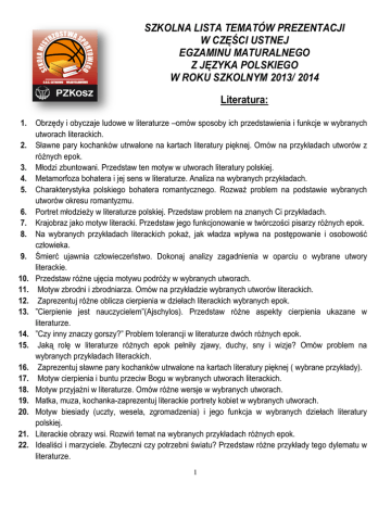 SZKOLNA LISTA TEMATÓW PREZENTACJI W CZĘŚCI USTNEJ EGZAMINU MATURALNEGO Z JĘZYKA POLSKIEGO W ROKU SZKOLNYM 2013/ 2014 Literatura: 1. Obrzędy i obyczaje ludowe w literaturze –omów sposoby ich przedstawienia i funkcje w wybranych utworach literackich. 2. Sławne pary kochanków utrwalone na kartach literatury pięknej. Omów na przykładach utworów z różnych epok. 3. Młodzi zbuntowani. Przedstaw ten motyw w utworach literatury polskiej. 4. Metamorfoza bohatera i jej sens w literaturze. Analiza na wybranych przykładach. 5. Charakterystyka polskiego bohatera romantycznego. Rozważ problem na podstawie wybranych utworów okresu romantyzmu. 6. Portret młodzieży w literaturze polskiej. Przedstaw problem na znanych Ci przykładach. 7. Krajobraz jako motyw literacki. Przedstaw jego funkcjonowanie w twórczości pisarzy różnych epok. 8. Na wybranych przykładach literackich pokaż, jak władza wpływa na postępowanie i osobowość człowieka. 9. Śmierć ujawnia człowieczeństwo. Dokonaj analizy zagadnienia w oparciu o wybrane utwory literackie. 10. Przedstaw różne ujęcia motywu podróży w wybranych utworach. 11. Motyw zbrodni i zbrodniarza. Omów na przykładzie wybranych utworów literackich. 12. Zaprezentuj różne oblicza cierpienia w dziełach literackich wybranych epok. 13. ”Cierpienie jest nauczycielem”(Ajschylos). Przedstaw różne aspekty cierpienia ukazane w literaturze. 14. ”Czy inny znaczy gorszy?” Problem tolerancji w literaturze dwóch różnych epok. 15. Jaką rolę w literaturze różnych epok pełniły zjawy, duchy, sny i wizje? Omów problem na wybranych przykładach literackich. 16. Zaprezentuj sławne pary kochanków utrwalone na kartach literatury pięknej ( wybrane przykłady). 17. Motyw cierpienia i buntu przeciw Bogu w wybranych utworach literackich. 18. Motyw przyjaźni w literaturze. Omów różne wersje w wybranych utworach. 19. Matka, muza, kochanka-zaprezentuj literackie portrety kobiet w wybranych utworach. 20. Motyw biesiady (uczty, wesela, zgromadzenia) i jego funkcja w wybranych dziełach literatury polskiej. 21. Literackie obrazy wsi. Rozwiń temat na wybranych przykładach różnych epok. 22. Idealiści i marzyciele. Zbyteczni czy potrzebni światu? Przedstaw różne przykłady tego dylematu w literaturze. 1 23. Różne sposoby ujęcia motywu miłości. Przedstaw na przykładach z różnych epok literackich. 24. Przedstaw kreacje bohaterów, którzy doświadczyli okrucieństw II wojny i próbują odbudować świat wartości. 25. Motyw tułacza, pielgrzyma, emigranta na podstawie wybranych utworów. 26. ”Kraj lat dziecinnych …”, czyli o literackich powrotach do lat minionych. Rozwiń temat na podstawie wybranych utworów. 27. Przedstaw topos nieszczęśliwej miłości w literaturze na podstawie różnych utworów. 28. Obraz getta warszawskiego w znanych Ci utworach literackich. Omów problem, odwołując się do wybranych utworów literackich. 29. Portret Żyda i różne jego kreacje w literaturze polskiej. Omów na wybranych przykładach. 30. Obraz szkoły, nauczycieli i uczniów w znanych Ci utworach literatury polskiej. 31. Przedstaw różne ujęcia zdrady, analizując wybrane utwory literackie różnych epok. 32. Wizerunki Niemców w literaturze polskiej. Omów, analizując wybrane utwory 33. Motyw wodza w literaturze różnych epok. Omów na wybranych przykładach. 34. Przedstaw obraz rodziny w literaturze. Prezentacja na podstawie wybranych dzieł. 35. Prawda o wojnie utrwalona w słowach. Rozwiń temat na wybranych przykładach z literatury polskiej i obcej. 36. Udowodnij, że średniowiecze jest źródłem motywów i wątków dla literatury fantasy. Omów ich funkcjonowanie w wybranych utworach. 37. Motyw czasu i przemijania w literaturze. Omów na wybranych przykładach. 38. Na wybranych przykładach literackich omów problem relacji między ojcami i synami. 39. Lekarz jako bohater literacki. Scharakteryzuj różne portrety i omów funkcje tego typu postaci w wybranych tekstach literackich. 40. „Nie taki diabeł straszny, jak go malują”. Omów sposoby ukazywania i funkcje postaci szatana w wybranych utworach literackich. 41. Prześledź, jak funkcjonuje motyw Syberii w literaturze polskiej XIX i XX wieku. 42. Magia i zjawiska nadprzyrodzone w literaturze. Omów funkcje tego motywu, odwołując się do wybranych przykładów. 1. 2. 3. 4. 5. 6. ZWIĄZKI LITERATURY Z INNYMI DZIEDZINAMI SZTUKI Historia inspiracją dla twórców różnych epok. Przeanalizuj utwory literackie i Inne przykłady kultury. Odnosząc się do wybranych dzieł sztuki, określ, jakie było pojęcie piękna i urody kobiecej w dwóch różnych epokach. Afrodyta-Wenus. Omów motyw mitycznej bogini piękności w literaturze i sztuce na wybranych przykładach. Literackie i filmowe obrazy rodziny. Omów zagadnienie analizując wybrane przykłady. Mity greckie jako źródło inspiracji artystów epoki renesansu. Przedstaw zagadnienia na wybranych przykładach literackich i plastycznych. Cierpienie i jego sens w wybranych tekstach literackich/ dziełach kultury. Omów problem odwołując się do literatury i innych dzieł sztuki. 2 7. Kat, ofiara i obserwator. Scharakteryzuj sposób kreowania tych postaci i oceń je, opierając się na literackich i filmowych dziełach dotyczących systemów totalitarnych. 8. Różne ujęcia motywu śmierci w literaturze i sztuce. Przedstaw analizując wybrane przykłady. 9. Katastroficzne wizje i obrazy zagłady w dziełach literackich i filmowych. Omów zagadnienie odwołując się do wybranych dzieł. 10. „Trylogia” H. Sienkiewicza a jej filmowe adaptacje. Omów na przykładzie jednej części „Trylogii”. 11. Przedstaw dziecko jako bohatera utworów literackich i dzieł malarskich, analizując wybrane przykłady literackie i plastyczne. 12. Motyw dworku szlacheckiego w literaturze i sztuce. Omów temat, odwołując się do wybranych utworów literackich i malarskich. 13. Postacie kobiece w literaturze i sztuc