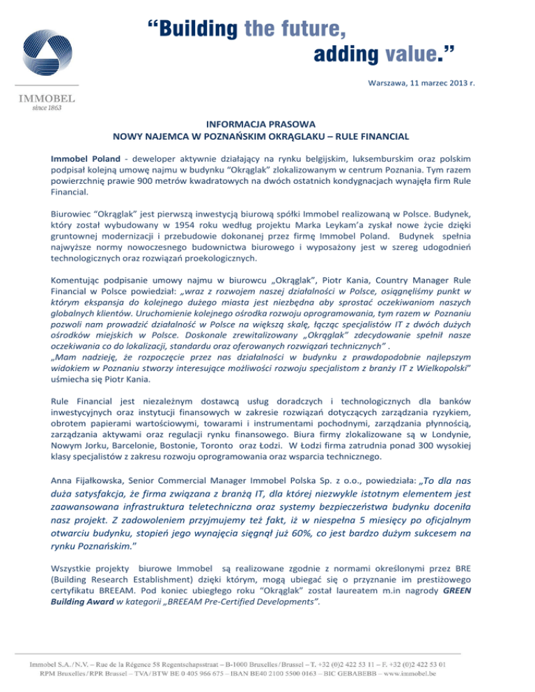 Warszawa, 11 marzec 2013 r. INFORMACJA PRASOWA NOWY NAJEMCA W POZNAŃSKIM OKRĄGLAKU – RULE FINANCIAL Immobel Poland - deweloper aktywnie działający na rynku belgijskim, luksemburskim oraz polskim podpisał kolejną umowę najmu w budynku “Okrąglak” zlokalizowanym w centrum Poznania. Tym razem powierzchnię prawie 900 metrów kwadratowych na dwóch ostatnich kondygnacjach wynajęła firm Rule Financial. Biurowiec “Okrąglak” jest pierwszą inwestycją biurową spółki Immobel realizowaną w Polsce. Budynek, który został wybudowany w 1954 roku według projektu Marka Leykam’a zyskał nowe życie dzięki gruntownej modernizacji i przebudowie dokonanej przez firmę Immobel Poland. Budynek spełnia najwyższe normy nowoczesnego budownictwa biurowego i wyposażony jest w szereg udogodnień technologicznych oraz rozwiązań proekologicznych. Komentując podpisanie umowy najmu w biurowcu „Okrąglak”, Piotr Kania, Country Manager Rule Financial w Polsce powiedział: „wraz z rozwojem naszej działalności w Polsce, osiągnęliśmy punkt w którym ekspansja do kolejnego dużego miasta jest niezbędna aby sprostać oczekiwaniom naszych globalnych klientów. Uruchomienie kolejnego ośrodka rozwoju oprogramowania, tym razem w Poznaniu pozwoli nam prowadzić działalność w Polsce na większą skalę, łącząc specjalistów IT z dwóch dużych ośrodków miejskich w Polsce. Doskonale zrewitalizowany „Okrąglak” zdecydowanie spełnił nasze oczekiwania co do lokalizacji, standardu oraz oferowanych rozwiązań technicznych” . „Mam nadzieję, że rozpoczęcie przez nas działalności w budynku z prawdopodobnie najlepszym widokiem w Poznaniu stworzy interesujące możliwości rozwoju specjalistom z branży IT z Wielkopolski” uśmiecha się Piotr Kania. Rule Financial jest niezależnym dostawcą usług doradczych i technologicznych dla banków inwestycyjnych oraz instytucji finansowych w zakresie rozwiązań dotyczących zarządzania ryzykiem, obrotem papierami wartościowymi, towarami i instrumentami pochodnymi, zarządzania płynnością, zarządzania aktywami oraz regulacji rynku finansowego. Biura firmy zlokalizowane są w Londynie, Nowym Jorku, Barcelonie, Bostonie, Toronto oraz Łodzi. W Łodzi firma zatrudnia ponad 300 wysokiej klasy specjalistów z zakresu rozwoju oprogramowania oraz wsparcia technicznego. Anna Fijałkowska, Senior Commercial Manager Immobel Polska Sp. z o.o., powiedziała: „To dla nas duża satysfakcja, że firma związana z branżą IT, dla której niezwykle istotnym elementem jest zaawansowana infrastruktura teletechniczna oraz systemy bezpieczeństwa budynku doceniła nasz projekt. Z zadowoleniem przyjmujemy też fakt, iż w niespełna 5 miesięcy po oficjalnym otwarciu budynku, stopień jego wynajęcia sięgnął już 60%, co jest bardzo dużym sukcesem na rynku Poznańskim.” Wszystkie projekty biurowe Immobel są realizowane zgodnie z normami określonymi przez BRE (Building Research Establishment) dzięki którym, mogą ubiegać się o przyznanie im prestiżowego certyfikatu BREEAM. Pod koniec ubiegłego roku “Okrąglak” został laureatem m.in nagrody GREEN Building Award w kategorii „BREEAM Pre-Certified Developments”. Więcej informacji udzielają: Bartłomiej Hofman Managing Director Immobel Poland Sp. z o.o. T. +48 22 351 0 190 Gaëtan Piret* CEO IMMOBEL SA T. +32 2 422 53 23 * sprl Piotr G. Kania Country Manager RULE FINANCIAL SP. Z O.O. T. +48 42 663 0860 Tim Osler Marketing Manager Rule Financial Ltd T: +44 (0)20 7826 4444 -2-